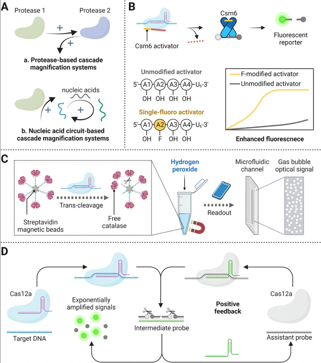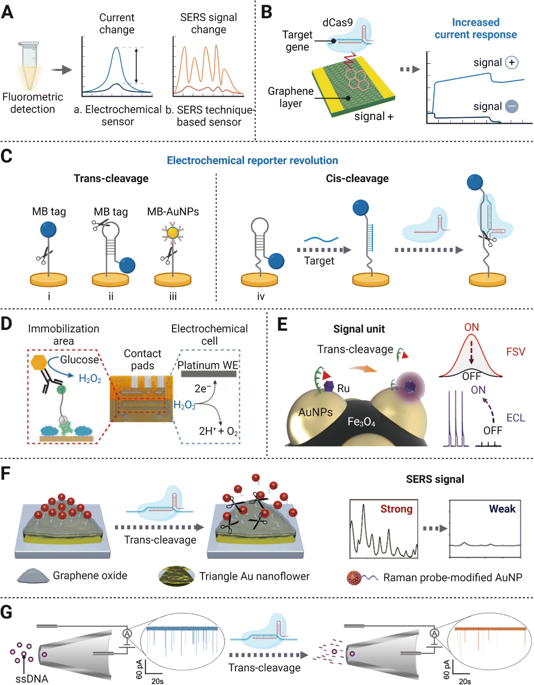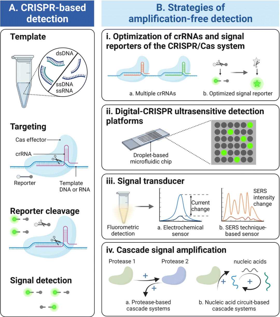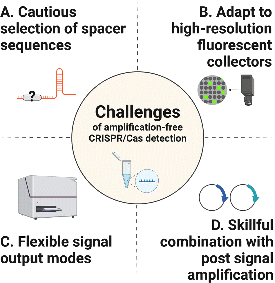 参考文献: Li H, Xie Y, Chen F, Bai H, Xiu L, Zhou X, Guo X, Hu Q, Yin K. Amplification-free CRISPR/Cas detection technology: challenges, strategies, and perspectives. Chem Soc Rev. 2023 Jan 3;52(1):361-382. doi: 10.1039/d2cs00594h. PMID: 36533412.