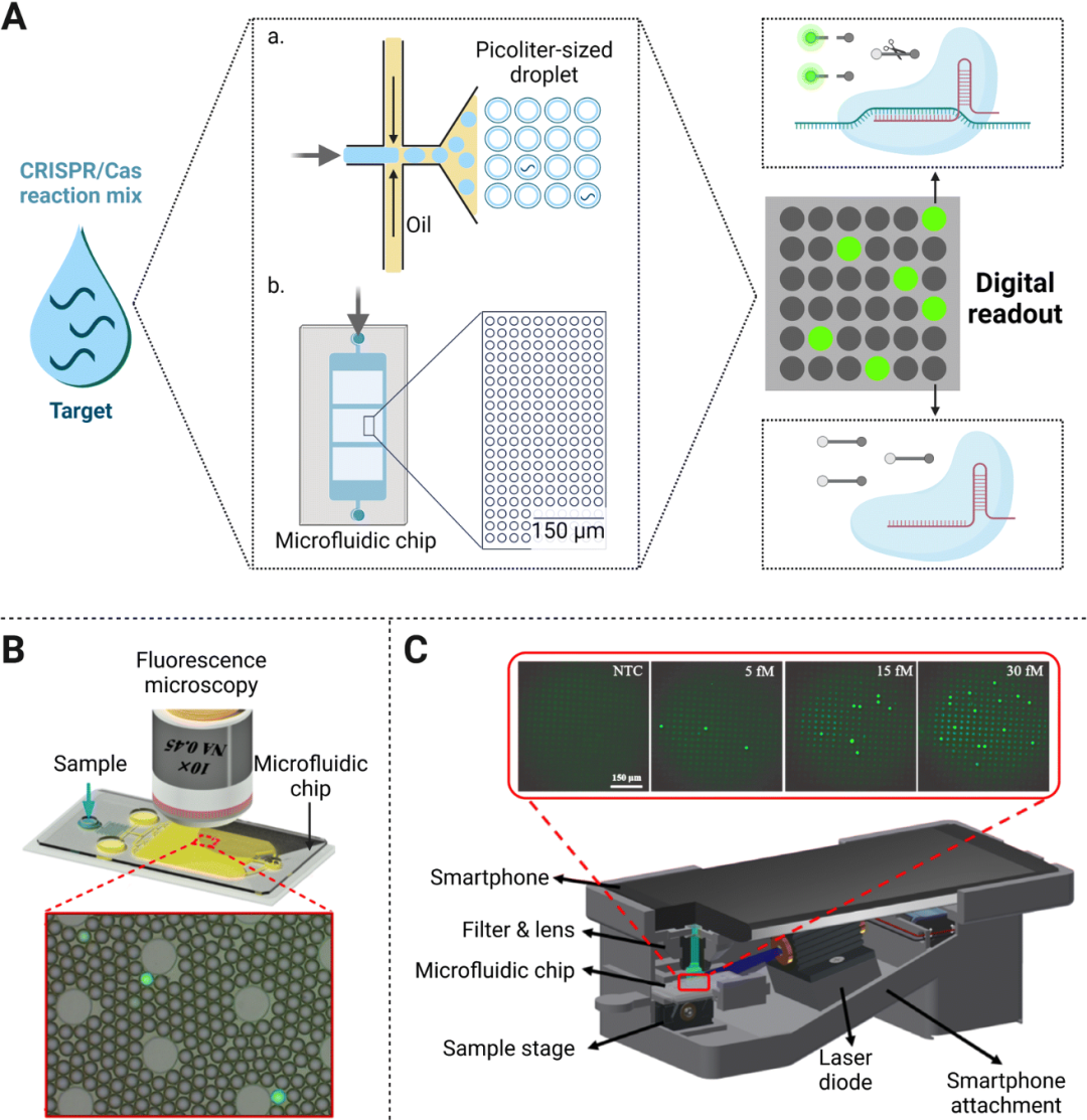 2.数字CRISPR超灵敏检测平台 与常规检测相比,数字检测中形成的反应单元是纳升级别的液滴,体积非常小。CRISPR/Cas系统与液滴数字技术相结合,可以建立用于免扩增直检的超灵敏生物传感平台(图4)。基于CRISPR/Cas的免扩增数字RNA检测(SATORI)平台是在CRISPR/Cas13和微室阵列技术的基础上设计的,可在5分钟内检测低至5 fM浓度的靶标,这大大优于其他免扩增的CRISPR/Cas13检测平台(∼50 pM或3 ×1010拷贝/mL。