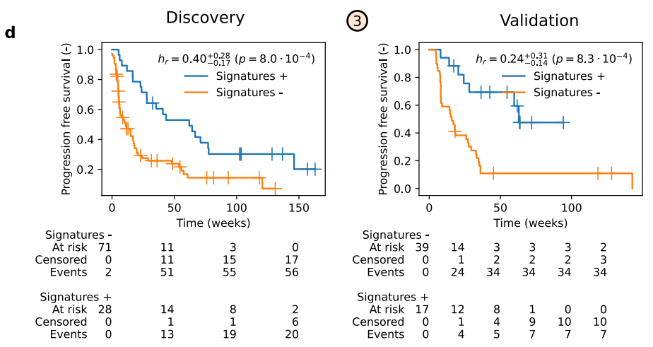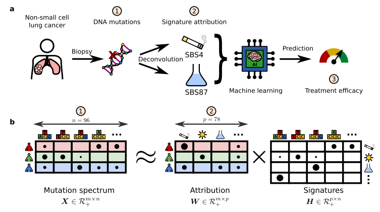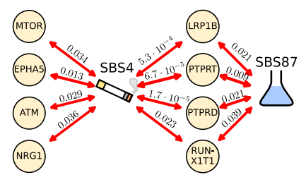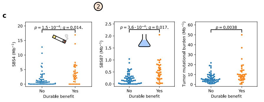 在非小细胞肺癌(NSCLC)中,免疫治疗的反应较低。预测因子可以帮助鉴别出治疗特别有效的特定亚群。肿瘤组织中的程序性死亡配体1(PD-L1)蛋白表达和肿瘤突变负荷(TMB),目前用于预测免疫疗法对NSCLC的疗效。TMB预测值背后的解释是,编码DNA中突变的积累导至新抗原的高度多样性。这些新抗原诱导广泛的抗肿瘤适应性免疫反应。新抗原的计算机分析发现TMB和推断的新抗原数量之间存在近乎完美的关系。一旦癌症细胞表达新抗原,癌症细胞就可以通过免疫识别和细胞杀伤被清除。 虽然几项研究表明TMB与治疗反应明显相关,但并不总是这样,这促使人们寻找一种改进的治疗效果指标。TMB是,通过汇集来自整个外显子组测序数据的所有氨基酸序列变化突变。然而,体细胞突变是由一系列过程产生的,核苷酸序列会提供突变产生的原因。在许多情况下,还需要阐明它们的病因。多环芳香烃、紫外线照射和铂化疗等留下的特定DNA突变特征或“基因组疤痕”都已在实验中得到验证。 越来越多的证据表明,癌症的突变特征与治疗相关。突变特征,根据其原因来区分突变,可能有助于确定相关的改变。特定的突变特征(例如APOBEC A3A)被认为是免疫刺激治疗的有希望的候选者。Wang等人发现,具有持久临床益处的患者富含与COSMIC特征SBS2和SBS13相似的特征,这些特征与APOBEC的损伤有关,APOBEC是一个酶家族,是先天抗逆转录病毒防御的一部分,通过在单链DNA中产生突变来发挥作用。 近日,一组来自于荷兰的研究团队在杂志Scientific reports上发表了一篇题为“Using genomic scars to select immunotherapy beneficiaries in advanced non-small cell lung cancer”的文章。研究团队通过使用更多的突变特征,例如拷贝数,了解它们在引发免疫反应中的作用。作者分析了单碱基置换、双碱基置换、INDEL和拷贝数改变特征,结果发现吸烟特征(SBS4)和硫嘌呤化疗暴露相关特征(SBS87)与持久获益有关。本文证明,通过突变特征编码的突变指纹可以选择可能受益于免疫疗法的晚期NSCLC患者,从而潜在地减少不必要的患者负担。 图片来源:Scientific reports 发现数据集中的变异特征 对M=157晚期非小细胞肺癌患者进行了分析,发现数据集m=101,单独的验证集m=56。该人群的平均年龄为63.2岁,男女比例大致相等(53.5%)。大多数患者(85/147,57.8%)没有从免疫疗法中获得持久的益处。在发现数据集中,21名患者(20.8%)接受了联合治疗。 发现队列中全基因组测序显示平均值为7.80 Mb−1的非同义突变,与之前关于全外显子组测序的报道一致。分析了如下突变特征数据p=47的单碱基置换(SBS),p=11双碱基置换(DBS),p=17插入和缺失(indel),p=20 拷贝数特征。 分析显示,大多数样本中存在9个SBS特征,其中SBS4是与吸烟有关的肺癌特异性特征,中位数最高(0.91 Mb−1)。插入缺失和双碱基置换的特征低了一个数量级,其中两个最高中位数特征,ID3和DBS2,都如SBS4一样归因于吸烟。全基因组拷贝数去卷积显示同源重组缺陷特征CN17具有最高的中位数归因。 治疗前肿瘤组织的突变特征预测晚期非小细胞肺癌的免疫治疗效果。 图片来源:Scientific reports 与持久获益相关的突变特征 接下来寻找免疫治疗前的突变特征,这些特征是治疗效果的决定因素。单变量分析(m=93 患者)挑选出两个单碱基置换特征(图c)。吸烟特征SBS4在可从免疫疗法持久获益的患者中显著不同(q=0.014)。SBS87的突变与巯嘌呤化疗暴露也被发现在两组患者之间存在差异(q=0.017)。但根据临床记录,没有一名患者接受过巯嘌呤相关化合物的治疗。且分析结果显示SBS4和SBS87特征之间不相关。 早期的工作将clock-like突变特征SBS1(随着年龄的增长而稳定增加)与无反应性和存活率更差相关联,但是此工作中无法复制其与持久获益的关联。插入和缺失和全基因组拷贝数改变特征均与持久获益无显著相关性。 与持久获益相关的突变特征。图片来源:Scientific reports 基于特征的分类器预测免疫疗法的益处 结合SBS4和SBS87特征归因时,证实了上述单变量分析不会导至发现数据集的过度拟合。分类器在受试者工作特征曲线下的面积(ROC AUC)为0.74。 研究团队使用Kaplan–Meier对所有发现队列患者m=101的预测结果与实际结果进行了比较。持久受益预测患者的中位无进展生存率较高(持久受益预测患者为62周,而非持久受益预测患者为11周)。对Miao等人的数据进行独立验证。外部验证集中的持久受益预测患者中位生存率(m=56)为63周,而非持久受益预测患者为16周(图d)。 基于特征的分类器预测免疫疗法的益处。 图片来源:Scientific reports 特征特异性突变与特定基因组位点的关系 为了更好地理解为什么SBS4和SBS87与持久获益有关,试图将它们的归因与特定基因联系起来。SBS4和SBS87特征均与TCGA中23个肺癌突变基因中任何一个的突变数量无关。对临床相关TSO500 panel中包含的523个基因的突变进行分析,发现8个基因ATM,EPHA5,LRP1,MTOR,NRG1,PTPRD,PTPRT,RUNX1T1,其突变数量与吸烟特征SBS4显著相关(如下图)。其中四个基因LRP1,PTPRD,PTPRT,和RUNX1T1也与SBS87相关。 在功能上,ATM和EPHA5都在DNA修复位点相互作用。MTOR调节细胞代谢,其他是肿瘤抑制基因。这些基因如PTPRT参与细胞相互作用,和如STAT3参与炎症反应的抑制。SBS87仅与肿瘤抑制基因相关。 特征SBS4和SBS87与癌症中典型突变基因的突变相关。 图片来源:Scientific reports SBS4/SBS87突变的表达 不是预测持久获益的充分条件 接下来,研究团队