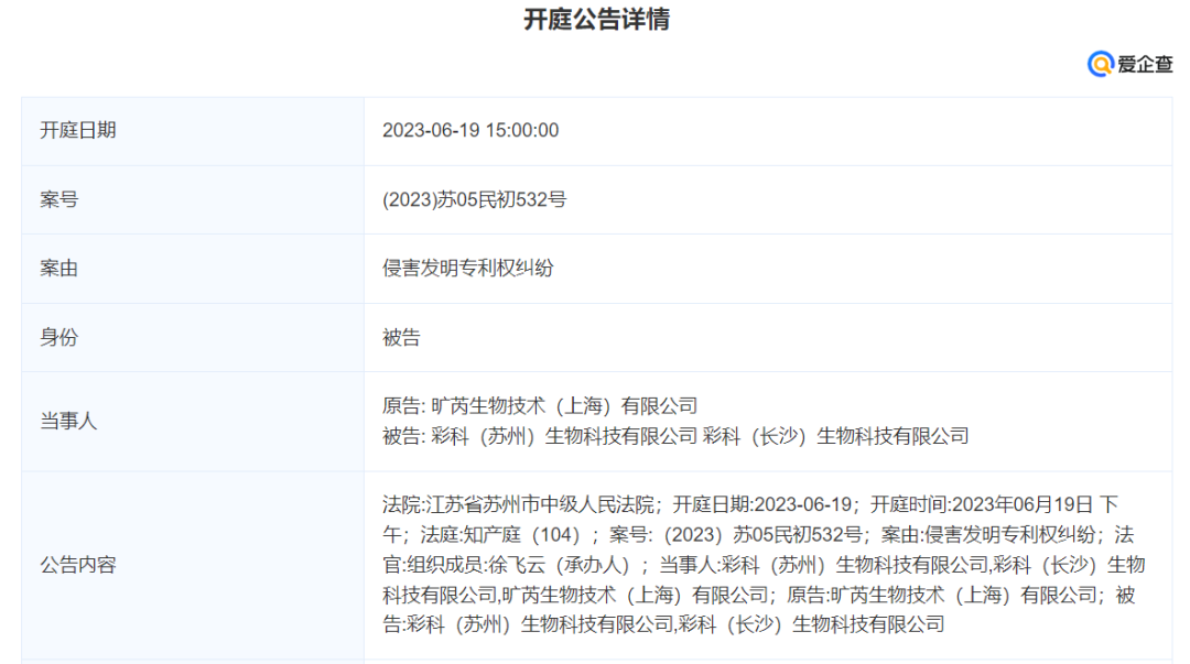 爱企查信息显示,旷芮生物技术(上海)有限公司与彩科(苏州)生物科技有限公司、彩科(长沙)生物科技有限公司正在发生专利权纠纷。旷芮生物作为原告起诉彩科生物,案由为侵害发明专利权纠纷,6月19日开庭。彩科(苏州)生物科技有限公司,由多位美国海归博士于2018年在苏州生物医药产业园创立,公司以为广大生命科学研究人员提供先进研究工具,挖掘海量高分辨率生命科学数据为目标,以微尺度下多物理场耦合μ-MPF (Micro-scaled Multi Physics coupled Force)技术及高端生物芯片设计为核心,自主研发生产了高通量单细胞光导系统、单分子阵列免疫分析仪、试剂、芯片等多项高科技产品,在单分子及单细胞水平大大提升了生命科学研究人员对生命认知的分辨率。公司自成立以来,已得到国内、外顶级生物医药投资机构如IDG、君联资本、弘晖资本、国投招商和国际著名生命科学及诊断公司珀金埃尔默(PerkinElmer)旗下产业基金PKI的亲睐。公司同时也荣获了“苏州工业园区第十二届科技领军企业”、“苏州市科技计划姑苏创新创业领军人才计划立项”、“2020未来医疗100强”、“中国创新医疗器械榜单Top100”及“生命科学工具及服务”价值榜等众多荣誉。Quanterix是一家在美国纳斯达克上市的生物技术公司,总部位于美国马萨诸塞州比勒利卡。我们独有的数字化解决方案Simoa超灵敏单分子检测技术,很有可能改变当今的医疗检测方式,使研发人员能够精密检测从健康到疾病的连续病理过程。Quanterix的创始人、CEO及管理团队凭借他们多次成功上市及国际化运营的经验,正带领整个公司实现快速的成长。2018年首次进入中国,2021年Quanterix在中国正经历飞速的扩展。