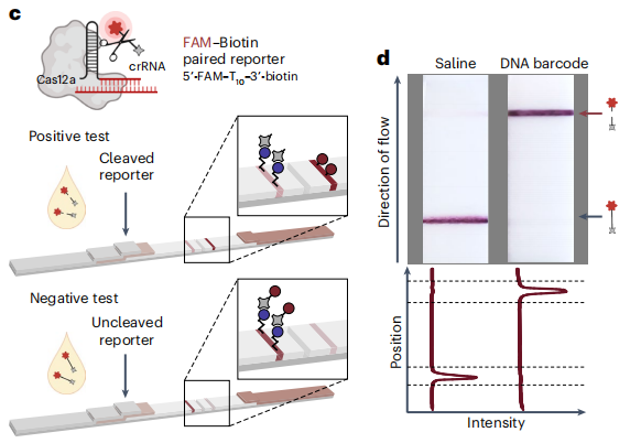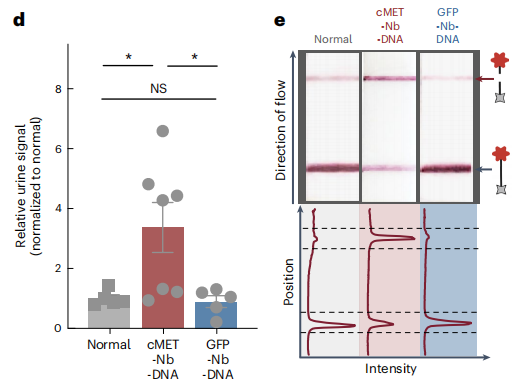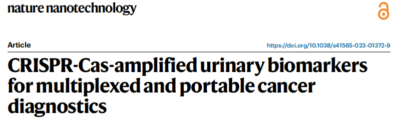 提供综合诊断信息的生物标志物在改善复杂疾病的临床管理方面发挥着重要作用,包括风险评估、早期检测、治疗或监测。由于蛋白或核酸等内源性生物标志物可能受到其在循环中的丰度或稳定性的限制,因此正在开发工程化的“合成生物标志物”,利用患病微环境的生物化学来放大分析物的产生,并提高信噪比。 分析化学中有很多用于多路复用的分子策略,包括DNA条形码转化药物筛选、基因表达谱分析和细胞功能分析。然而,体内核酸的敏感性阻碍了合成生物标志物DNA的多路复用。当不受核小体保护时,DNA会被降解。具有化学修饰的治疗性核酸可以抵抗系统降解,但不能用传统聚合酶扩增,也不能方便检测,从而阻止其用于诊断平台。 近日,一组来自美国的研究团队在杂志Nature nanotechnology上发表了一篇题为“CRISPR-Cas-amplified urinary biomarkers for multiplexed and portable cancer diagnostics”的文章。文章中,为了将合成生物标志物用于护理点(PoC)精准诊断,作者利用化学稳定的DNA进行分子条形码,并依赖于微环境内肽酶来触发尿液中核酸条形码的释放和无聚合酶扩增的CRISPR-Cas介导的条形码检测。结果表明,DNA编码的纳米传感器可以在移植和原位小鼠癌症模型中无创检测和区分疾病状态。作者利用这项技术设计了一组高通量、可编程的体内纳米传感器,用于尿液中的非侵入性疾病检测和监测。 图片来源:Nature nanotechnology DNA SUBs概述 DNA编码的合成尿液生物标志物(DNA SUBs)(1)靶向体内病变部位,(2)感知肿瘤微环境中失调的蛋白水解,和(3)释放在循环系统中存活并被肾脏浓缩的核酸条形码,(4)通过与引导RNA的序列互补性激活CRISPR-Cas12a的单链DNA酶活性。通过病理性蛋白水解活性释放,使用荧光动力学在尿液中检测到化学稳定的DNA条形码,或在Cas12a激活后在试纸上检测到。DNA条形码的大规模多重性为对复杂的人类疾病进行分类打开了大门。为了证明其模块性,作者在纳米体或合成聚合物支架上组装了DNA SUB,并在小鼠模型中对三种不同类型的原发性和转移性癌症进行了无创检测和监测。 工程DNA编码的合成尿液生物标志物与CRISPR-Cas介导的疾病检测。图片来源:Nature nanotechnology 化学修饰DNA使CRISPR-Cas12a介导的 尿液检测成为可能 研究团队尝试使用硫代磷酸修饰的DNA激活Cas效应蛋白CRISPR-Cas12a。这些DNA在CRISPR RNA(crRNA)结合时释放Cas12a的旁切切割活性,导至荧光报告子DNA的反式切割。实验证明,来自注射了硫代磷酸化ssDNA的动物的尿液保留了触发LbaCas12a的旁切核酸酶活性的能力。使用侧流纸带上的比色读数也可以检测到未处理尿液中的修饰DNA分子(图c)。前部“样品带”的存在表明,在LbaCas12a被尿液DNA激活后,可检测的FAM已通过报告子切割释放(图d) 化学修饰的DNA结合CRISPR-Cas用于体内尿液传感。 图片来源:Nature nanotechnology 肿瘤靶向,DNA编码的合成生物标志物 作者利用肿瘤微环境中失调的蛋白水解活性来切割和释放化学稳定的DNA条形码,这些条形码集中在尿液中,以产生目标疾病的非侵入性读数。将一段肽底物序列标记具有组织亲和力的纳米体。肽底物对PCa相关蛋白酶PLAU(或uPA)有特异性反应。将PLAU可激活的纳米体与20-mer DNA条形码共价连接,纳米体(cMET-Nb-DNA)表现出增强的肿瘤积聚。 在人类前列腺癌症(PCa)异种移植模型中评估了合成生物标记物。与健康对照相比,cMET-Nb-DNA显著增加了从荷瘤小鼠收集的尿液样本激活的LbaCas12a的反式切割率(图d)。进一步可将荧光读数转化为PoC检测工具,可用测流层析使结果可视化(图e)。 肿瘤靶向,DNA编码的合成生物标志物。 图片来源:Nature nanotechnology 多重DNA编码的合成生物标志物 异质性疾病的诊断敏感性和特异性可能需要分析多种癌症特征。研究团队构建了一个DNA-SUB的多路复用面板。每个DNA-SUB具有20聚体的硫代磷酸化DNA标记的蛋白酶激活肽(PAP),其共价偶联到八臂PEG纳米载体(图a)。 蛋白酶激活的肽(PAP7、PAP9、PAP11、PAP13、PAP15)在体外被肿瘤组织匀浆特异性切割,被用于DNA SUB面板(图c)。通过分析每个DNA条形码触发的反式切割活性,作者发现DNA-PAP7-SUB在肿瘤接种后第11天肿瘤结节为1-2 mm时成功区分了荷瘤小鼠和健康小鼠 。随着时间的推移,DNA-PAP9-SUB、DNA-PAP15-SUB传感器差异也被放大。基于ROC曲线分析,PAP7,PAP15和PAP9蛋白酶底物信号的总和显著增加了DNA SUB的分类能力。将此传感器面板与测流检测相结合,可实现视觉读数,且量化之后可表现出多个传感器的疾病分类能力。 多重DNA编码的合成尿生物标记物。 图片来源:Nature nanotechnology 用于临床相关诊断的DNA复用 作者假设,对疾病定位蛋白酶活性的多重测量可以对来源于不同来源组织的肿瘤进行分类。结果显示,在低等级疾病中(诱导7.5 周后),来自多重DNA-SUB面板的DNA-PAP9-SUB从健康小鼠中鉴定出携带肿瘤的小鼠。疾病进展时(诱导12 周后),除了DNA-PAP9-SUB外,DNA-PAP15-SUB蛋白酶切割趋势也变得显著,这反映在荧光和纸质条形码读数中,允许在ROC曲线分析中对患病与健康对照动物进行分类。 研究团队分析了尿液DNA条形码水平,评估了DNA SUB面板是否在疾病状态之间被差异切割。结果显示前列腺癌、原发性肺肿瘤和转移性CRC肿瘤中患病和健康小鼠报告基因浓度有差异,这显示了不同肿瘤类型之间蛋白酶活性的差异(图f)。不仅如此,作者实现了一个大规模复用的Fluidigm微流体平台(图g),评估了44个合成的20聚体ssDNA及其相