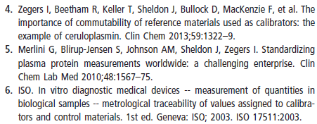互换性是参考物质的性质,参考物质被检测的值,与具有代表性的临床样品被检测的值,在相同被测量的检测程序的2个或更多个之间,具有相同的关系(1,2)。当某个参考物质将被用于临床实验室检测程序的通用校准品,或将被用于质量评估(能力比对试验)计划去评价检测程序间检测病人样品结果的一致性时,要求互换性(3)。当参考物质被用于某个体外诊断厂商,作为他们内部溯源性程序,为他们的产品校准品定值时,也被要求互换性。 本期杂志上,Zegers等报告了新参考物质对铜蓝蛋白互换性的研究和证实,ERM-DA472/IFCC是被制备替代ERM-DA470的。早期的参考物质以血清为基础,是15个蛋白包括铜蓝蛋白的参考物质,没有被确认互换性,但有报告改善了常规临床实验室检测程序间对数种蛋白的一致性。但是ERM-DA470没有使得病人样品中的铜蓝蛋白结果一致性(harmonization),因它缺少互换性。常规程序结果间缺少一致性,被英国的国家室间质量评估计划(the United Kingdom National External Quality Assessment Scheme)证实,该计划使用了可互换的样品评估性能。Zegers等的报告强调了证实打算用于常规检测程序的通用校准品的参考物质,须确认互换性;参考物质提供者承担去评价互换性作为确认某个参考物质互换性的责任。 检验医学专业已经认识到在预期用作溯源性链的校准品中,参考物质互换性的重要性(1,2)。ISO 17511实施了为校准品和控制品定值在计量上的溯源性,并声明在溯源性链上的每一步,校准品的互换性。校准可溯源至较高等级参考物质或参考检测程序的目的,是为了使检测相同被测量的不同常规临床实验室检测程序对病人样品提供等同的结果。不幸的是,ISO标准对于病人样品的最后结果溯源性要求很模糊。Consequently因此,常规检测程序的产品校准品可溯源至无互换性的参考物质叙述的情况,造成不同常规程序间病人样品缺少一致性(4,7-13)。ISO 17511近期正在修订,我们期望(鼓励)工作组为确保在不同常规检测程序间病人样品结果具有可比性,要仔细地实施必要的溯源性要求。 所有参考物质的提供者,无论是预期作为通用校准品、还是去评估室间质量评估/能力比对试验的结果一致性,必须负责确保该物质与有代表性的临床病人样品是互换的。从实用观点,不可能去评价整个世界上使用的每个检测程序的互换性。合适的方式是对给定的被测量通常使用的程序和技术评价它们的互换性。近期CLSI对可互换参考物质的特性和量化的导则,对支持参考物质生产者以相应确认这一的物质是可用的(14)。发展(形成)不常用的检测程序,包括由实验室发展的项目和进入市场新程序,有责任确定某个给定参考物质是否适合用于这样的程序。对于这样的评估orient定向特定方案,需要由临床实验室社团去形成。 可互换的参考物质有很大的挑战,因为某个给定的分析物的分子形式会尚未很好地理解、或在不同的临床情况下有变异,而某个生物标志物被用于诊断或药物监视的信息。另外,为制备某个参考物质,也会难以得到内含被测量的相应分子形式的生物物质合适量。还有困难是临床样品处理中分子形式被修饰(修改)、对需要的生物标志物的纯化、在制备物质或添加稳定剂时改变了通常的样品基质等。某个生物标志物的纯化形式会不合适去制备用于常规检测程序的以合适基质为基础的物质。例如,基因重组蛋白会可用、但会不具有相应转译后的糖基化、或分子复合物结构,可合适地代表未经改变的临床被测量。除此之外,互换性依然是参考物质的基础要求,因为它将用于校准溯源性过程或评价室间质量评估计划中检测程序间的一致性。 在检验医学中有几个新的发展,在未来的岁月里将对改善检测程序的一致性有关系。WHO近期召集了咨询:WHO生物参考制品在体外检出感染标志物的互换性。该会议预期将在不久公布于WHO网页。尽管这个会议关注的仅是感染疾病的生物标志物,WHO也提供了其他临床实验室学科的“国际标准”和“参考试剂”等实质性的多个参考意见。许多常规检测程序具有校准可溯源至WHO参考物质的,还没有被评价过互换性,有些已经被报告没有实现病人样品结果间的一致性(7-11)。我们称赞WHO认识到参考物质互换性的重要性,以确保它们适应它们的预期用途,和我们期望在未来进行互换性的评价,并更新它们参考物质。 JCTLM列出了参考物质、参考检测程序、和实施参考程序的实验室,已经被评审是否与ISO标准一致、可以用于建立常规临床实验室检测程序的校准溯源性。工作组1的质量手册已经添加了要求,包括参考物质互换性的评估,被考虑列出数据库 (15)。 IFCC科学部近期建立一个互换性的工作组。该工作组正在负责未来形成互换性正规评估的程序,和依据某个被测量的预期临床用途,规定某个参考物质是可互换的的指标。诸如confounding扰乱影响检测特异性、参考物质批号置换的评价、和以新的检测程序对现有的物质互换性的评估等问题,是这个工作组要实施的内容。 AACC已经在导至形成国际临床实验室结果一致性共同体(International Consortium for Hamonization of Clinical Laboratory Results)。这个新计划在2010年的国际forum讨论会上被证实由这个需求,去组织全球的努力推动一致性结果(2)。该计划目的在于提供为依据临床重要性和使用于临床实践导则中对一致性需求,证实和优先考虑的被测量的中心
