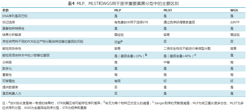 建议采用MLST、MLP 和 WGS 技术,对目标菌株进行同源性判断。依据技术特点(表4)和实验室实际能力,选择相应技术。MLST和MLP不能确定分型的菌株可使用WGS进行分型(弱,低)。IC通常使用MLP或MLST基因分型方法。在耳念珠菌病,MLP分型具有快速、高分辨率的特点,有助于在亚种水平上对临床分离株进行初步分类 [109, 110](弱,低)。曲霉流行病学研究推荐使用MLP方法[105](弱,低)。