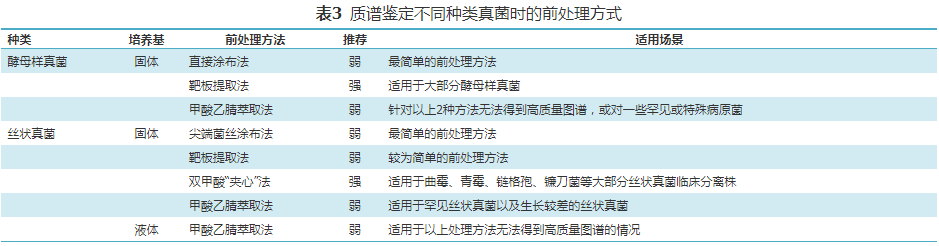 对基质辅助激光解吸电离飞行时间质谱(matrix-assisted laser desorption ionization time-of-flight mass spectrometry,MALDI-TOF MS)技术,必须明确鉴定范围(参见说明书),并定期完成质控。能力具备时考虑自建库,须进行能力验证(强,中)。不同真菌的前处理方式见表3。推荐对酵母样真菌进行MALDI-TOF MS技术鉴定。推荐靶板提取法(强,中)。靶板提取法未产生可接受的鉴定结果或出于生物安全考虑时,建议使用甲酸乙腈萃取法处理酵母样真菌(弱,低)。一般培养18~24 h的酵母样真菌适宜用于质谱鉴定,而生长较慢的酵母样真菌可延长至48 h。美国临床和实验室标准研究所(Clinical and Laboratory Standards Institute,CLSI)指南CLSI-M58推荐1×105~1×107 CFU/孔位的菌量以提高鉴定性能。明确质谱数据库中酵母样真菌鉴定范围,并进行定期更新。对丝状真菌,建议采用:(1)制造商推荐的甲酸乙腈萃取法(弱,低);(2)双甲酸“夹心”法作为前处理方法[80](强,中)。不建议对原始样本直接进行MALDI-TOF MS检测。对血培养、体液增菌培养样本中酵母菌,可以尝试该技术,但须进行性能验证(弱,低)。