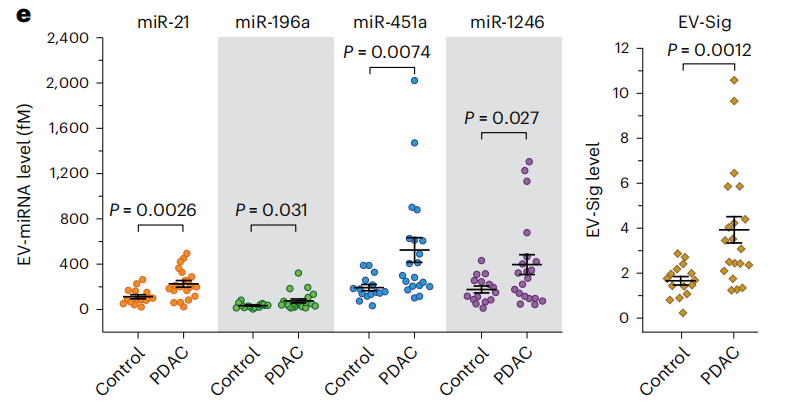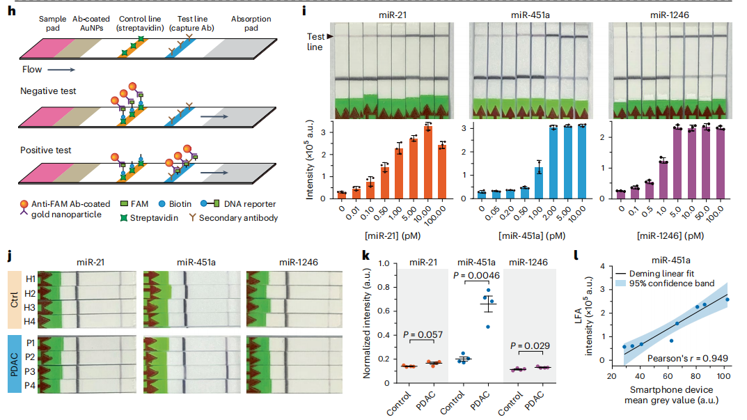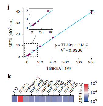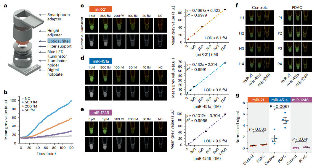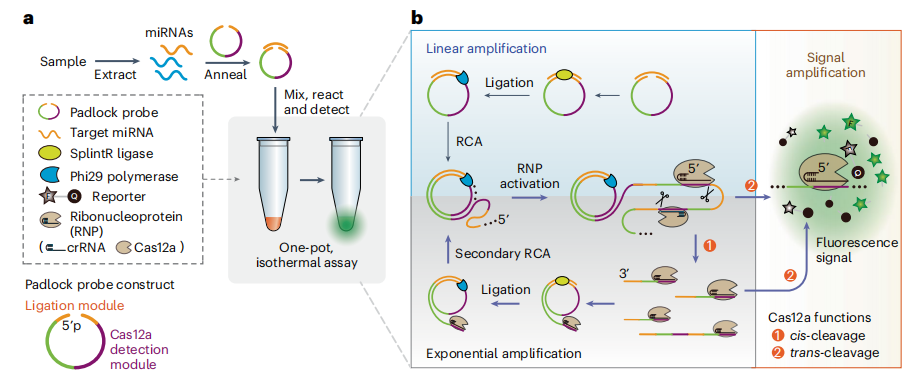 microRNA是内源性和短的非编码单链RNA(18-23个核苷酸),参与信使RNA的转录后抑制。由于miRNA参与细胞增殖、分化和细胞死亡等各种生物学过程,因此失调的miRNA与癌症等疾病的发病机制密切相关。在基于液体活检的癌症诊断、预后和监测中,探索循环miRNAs是一种很有前景的策略。一个障碍是高性能检测生物样本中miRNA的挑战,因为它们的长度短,在miRNA家族中序列相似性高,在不同细胞类型和生物流体中的浓度范围大,以及相关的起源和载体的多样性。因此,迫切需要超灵敏、特异和稳健的生物测定和传感器,以促进临床上可行的疾病miRNA生物标志物的开发。 逆转录定量聚合酶链式反应(RT-qPCR)已成为检测miRNA的金标准工具。与长RNA物种(如mRNA)不同,短miRNA需要特殊的RT过程来结合有助于PCR扩增和检测的扩展序列。已经开发了许多等温分析来推进miRNA检测,包括滚环扩增(RCA),指数扩增反应(EXPAR),环介导的等温扩增(LAMP),杂交链反应和催化发夹组装。尽管这些测定具有简单甚至无需仪器操作的优点,但也存在限制广泛临床应用的缺点,例如EXPAR和LAMP的非特异性扩增和高背景信号,以及杂交链反应和催化发夹组装的相对较慢的动力学和低灵敏度。其他标准技术,如微阵列、NanoString和测序,需要复杂的仪器或具有复杂的分析工作流程、高操作成本和有限的分析性能,这阻碍了它们在临床诊断中的广泛应用。 近日,一组来自美国的研究团队在杂志Nature biomedical engineering上发表了一篇题为“A one-pot isothermal Cas12-based assay for the sensitive detection of microRNAs”的文章。在这篇文章中,研究团队报道了一种一步、一锅等温CRISPR-Cas12a检测方法(EXTRA-CRISPR),用于快速特异性检测miRNA,其灵敏度与RT-PCR相当。作者将EXTRA-CRISPR测定用于量化细胞外囊泡(EV)中的miRNA生物标志物(miR-21、miR-196a、miR-451a和miR-1246),用于基于液体活检的胰腺导管腺癌(PDAC)诊断,并通过对相同临床样本进行平行RT-qPCR分析,严格验证了EXTRA-CRSPR测试的分析和诊断性能。结果表明,该技术可能有助于推进miRNA检测和miRNA生物标记物的临床开发,以用于基于液体生物检测的癌症诊断和预后。 图片来源:Nature biomedical engineering EXTRA-CRISPR测定的原理 EXTRA-CRISPR检测被设计为三酶级联,利用CRISPR-Cas12a系统的核酸剪切活性(顺式切割和反式切割功能),将线性RCA转化为用于miRNA检测的指数扩增方法。简言之,Cas12a-RNP可以通过其顺式活性结合并切割RCA的长ssDNA扩增子,从而产生许多含有靶序列的二级引物来启动随后的RCA循环,从而导至靶的指数扩增。同时,扩增子激活的Cas12a RNP非特异性切割ssDNA报告子以产生和放大荧光信号。 EXTRA-CRISPR测定的原理和工作流程。 图片来源:Nature biomedical engineering EXTRA-CRISPR测定法的优化和表征 作者优化了EXTRA-CRISPR测定法的padlock探针结构、连接酶、变性退火步骤、RCA相关缓冲液添加剂、聚合酶浓度、CRISPR组分如RNP和报告子浓度。优化后的EXTRA-CRISPR测定法的分析性能通过金标准RT-qPCR的平行测量得到了系统验证。与商业miRCURY LNA miRNA PCR试剂盒相比,EXTRA-CRISPR一锅法检测灵敏度相当,按照3小时实验流程其LOD为1.57 fM。 为了评估此方法的特异性,作者检测了许多非靶miRNA,包括一个在padlock-1连接位点具有单核苷酸错配的合成miR-21和8个1 pM的人miRNA。这些测试产生的信号水平约为miR-21信号的2%,甚至更低(如下图k),显示了优异特异性。对于从连接位点偏移三个核苷酸的单个错配,仍然可以获得相当好的特异性,非特异性信号水平约为25%。总的来说,结果验证了一锅EXTRA-CRISPR测定法,该测定法使用适当设计的padlock探针以个位数的飞摩尔敏感性和单碱基特异性快速检测miRNA。 一锅法EXTRA-CRISPR miR-21测定的优化。 图片来源:Nature biomedical engineering EV-miRNAs定量分析EV衍生的miRNA 作者采用了EXTRA-CRISPR测定法来检测用于诊断PDAC的小EV(sEV)miRNA,为此,使用细胞培养基和人血浆样品分离sEV并提取短RNA,然后使用一锅EXTRA-CRISPR和两步RT-PCR测定进行平行测量在PDAC中失调的miRNA包括miR-21,miR-196a,miR-451a和miR-1246。通过EXTRA-CRISPR检测三种miRNA的校准图,从中确定miR-196a LOD为1.35 fM(5–500 fM线性范围),miR-451a为4.14 fM(5–500 fM线性范围)和miR-1246为7.96 fM(20–500 fM线性范围)。这些LOD与标准RT-qPCR测定的LOD相当(下图c)。EXTRA-CRISPR测定也显示出对四个miRNA靶标的高度特异性检测,单个padlock探针和三个非靶标之间的交叉反应性最小(下图d)。总的来说,这些结果证实了EXTRA-CRISPR方法有优异的敏感和特异性。 EV衍生的miRNA的定量分析。 图片来源:Nature biomedical engineering EV-miRNAs定量分析在胰腺癌症诊断中的应用 接下来评估了EXTRA-CRISPR分析法,以测量无癌对照组(n = 15) 和PDAC患者(n = 20) 的血浆样本。使用EXTRA-CRISPR测量EV miRNA,同时量化miR-21、miR-196a、miR-451a和miR-1246的水平。如图e所示,每个受试者的四种血浆EV miRNA标记物的浓度,它们在PDAC队列中的表达升高,与之前的研究一致。与单个标记物相比,EV Sig(miR-21、miR-451a和miR-1246的加权线性组合)提高了区分PDAC组和健康组的能力。AUC值范围从miR-196a的0.677到miR-451a的0.793。EV-Sig小组极大地提高了诊断能力,AUC为0.853。 EV-miRNAs定量分析在胰腺癌症诊断中的应用。 图片来源:Nature biomedical engineering 用于POC测试的智能手机型EXTRA-CRISPR分析 为了测试POC应用,作者试图建立一个低成本、便携式智能手机的EXTRA-CRISPR检测系统。这个原型是由3D打印的身
