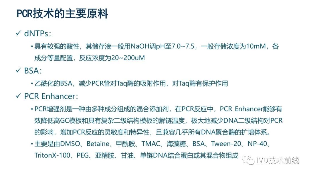 刚建的公众号,取名为“IVD前线 ”,旨在追踪国际国内的IVD前沿技术,以及新的IVD原料,为 IVDer 提供一个不断学习的平台。大家可以敞开交流,互通有无。非专业写手,很难做到像大拿们一样日更周更,但是还是会督促自己多多学习新知识,分享新知识,也希望大家多给予鼓励。 老生常谈,第一篇文章,先给大家来个PCR原料的概览,这个话题之前也在满天星平台讲过,今天再来回顾一下。PCR技术是目前分子诊断的主流技术,其原料就是除模板之外的PCR反应几大组分(酶,dNTPs,引物,buffer)。为了使得PCR的性能更优秀,在设计好引物序列之后,大家一般会围绕酶和buffer做文章。接下来我们将针对各个组分做一个简单的概括性介绍,如有不足之处,还请多多指教。 |