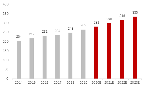 (二) 辅助生殖行业发展历程辅助生殖技术已在世界范围内得到广泛应用,近1000万新生儿通过人类辅助生殖技术(ART)出生。以不同辅助生殖技术的诞生为依据,可将辅助生殖行业的发展历程划分为以下阶段: 1. 人工授精技术(1780-1970年代)1785年英国Jonh Hunter将一位尿道下裂患者的精液注入到其妻子的阴道内,成功解决了他们的生育问题,标志人工授精技术初步形成。1860年美国纽约州医院人工授精获得成功。我国在20世纪40年代即有人工授精技术,但病例仅是个别的。1953年Bunge和Sheman首次报道使用冷冻精液人工授精成功,到20世纪70年代中期才广泛使用。 2. 试管婴儿技术(1970-1990年代)1978年7月25日在英国伦敦诞生了人类最早的试管婴儿,此后试管婴儿技术在各国蓬勃展开。1980年澳大利亚、1981年美国等国家试管婴儿也陆续诞生。1985年4月16日,我国台湾出生1名试管婴儿,1986年12月我国香港出生1名,1988年3月10日在北医大附属第三医院,大陆首个试管婴儿诞生,此后妊娠成功率进一步提高及其他一些助孕技术的发展,解决了一些有特殊孕育困难夫妇的生育问题。 3. 体外受精技术(1990-1999年代)1990年英国最先将PGD应用于临床并获得健康婴儿。1992年时通过将精子直接注入卵细胞浆内诞生了人类首例ICSI婴儿。1996年我国首例ICSI试管婴儿在中山大学附属第一医院生殖医学中心诞生,1999年中山大学附属第一医院生殖医学中心成功完成我国第一列PGD。 4. 辅助生殖技术新发展(1999年末至今)1998年美国Wisconsin大学Tomson实验室从体外受精14个胚胎中获得5个胚胎干细胞系,自此拉开人类生殖干细胞研究大幕。我国于2004年也成功培养出胚胎干细胞,生殖工程技术发展进入国际先进行列,同年我国冷冻卵子试管婴儿在北京大学第一附属医院诞生,2006年1月我国首例、国际第二例“三冻”(冻卵、冻精、冻胚胎)试管婴儿在北医大附属第三医院诞生,卵子冷冻技术逐渐发展起来。2014年北医三院生殖中心成功应用多次退火环状循环扩增技术(MALBAC),诞生世界首例MALBAC扩增测序的PGD婴儿。2019年,生殖中心实验室通过对时差显微镜积累的海量胚胎图像分析,发现了胚胎体外发育的“真实事件”,揭示了形态正常与异常胚胎的区别,有望指导临床对胚胎的正确评估。随着人工智能技术的不断发展,我国学者也在探索如何将人工智能技术应用到辅助生殖技术的治疗中,以提高辅助生殖技术治疗的精准性。 (三) 辅助生殖行业市场规模1. 全球辅助生殖市场规模由于首次生育平均年龄提高,以及不健康生活方式和环境因素影响,不孕症在全球范围内越来越普遍。据统计,全球不孕症患病率已从1997年的11.0%增长至2019年的16.4%,预计2023年将达17.2%。在不孕率居高不下之际,全球辅助生殖服务行业发展迅猛。根据弗若斯特沙利文数据显示,市场规模由2014年的204亿美元增长至2019年的265亿美元,CAGR达6.0%。根据高禾投资中心预测,2023年全球市场规模预计达到335亿美元。 图 2014-2023E全球辅助生殖服务行业市场规模(亿美元)
