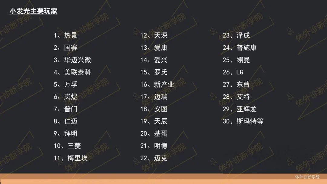 从免疫荧光POCT到单人份半自动POCT化学发光,再到全自动小型化学发光,市场一直在进化... 小发光由日本三菱的PATHFAST开创,2017年前后,单人份小发光开始兴起,彼时的POCT市场上百家厂家开始把POCT带向红海。此后,国家分级诊疗、医联体、医供体、结果互认开始推行,患者回流的红利让大家对小发光未来替代乡镇市场免疫免疫POCT趋之若鹜,小发光市场的大战也开始打响。这几年,规模千万以上的乡镇、社区医院,小发光出现的越来越多!同时,大发光已经在二三甲市场打开局面,医院检验科也都清楚免疫检测的结果要准确,必须以化学发光为主。于是,小发光也开始盯上国内的二三甲急诊市场,比如脑梗、心梗、心衰、炎症等。通过融合大发光和单人份发光的优点,进入小型全自动化学发光的发展新阶段,提升检测速度,优化检测结果,操作自更便捷、样本量更小、仪器成本更低、可全血检测、应用场景也开始往大发光方向靠(心内科、胸痛中心、卒中中心、心衰中心、急诊科、ICU/CCU、儿科等)。当然,这无疑也会进入头部大发光企业的领地,竞争也会越来越激烈。在提高速度和自动化程度的前提下,如何让小发光仪器、试剂、校准、质控系统的完美结合,确保结果的稳定性和准确度,是小发光崛起的关键点。目前来看,国产全自动小发光仪器对比半自动单人份小发光已经进步不小,未来可期。 随着,国家对基础医疗的不断重视,新医疗基建将会拉动二级医院终端市场的需求释放,这对于正在市场拓展的小发光无疑是一个利好的信号。新冠到来后,行业格局也发生了不小的变化,小发光代表热景完成上市,借助新冠起飞,华迈兴微抓住国际新冠抗原市场乘机储备现金流。POCT代表企业万孚抓住新冠抗原市场的红利,明德靠新冠核酸、抗原同样赚的盆满钵满,基蛋则更多通过自研进入各大细分市场。大发光代表安图、迈瑞、新产业则更倾向于巩固化学发光市场地位,迈克、亚辉龙、万泰则把握新冠机遇的同时,大力发展发光市场。