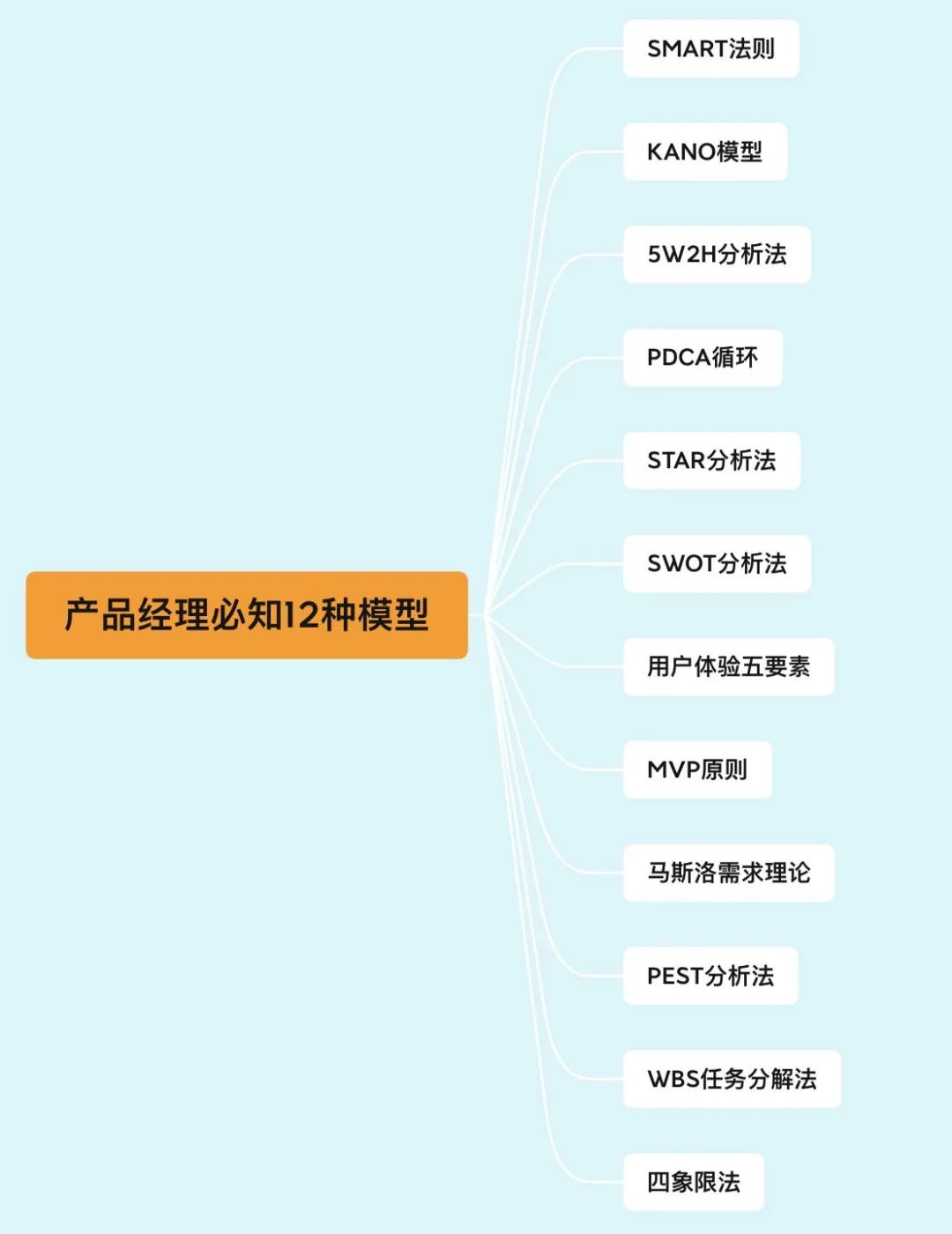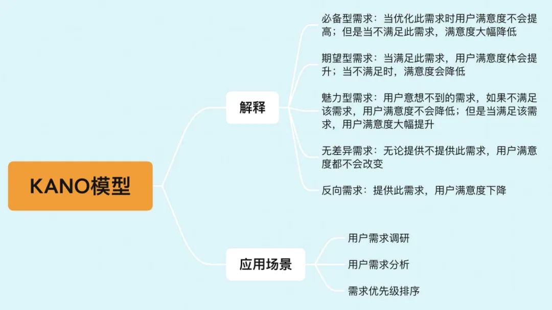 想要成为一个优秀的产品经理,最核心的就两个:一个是产品思维(软性),一个是产品技能(硬性)。 产品技能的提升相对容易,而且很快就能触碰到”天花板“且产品技能的高低并不是区分一个产品经理是否优秀的核心要素;而产品思维的提升是一个循序渐进的过程,而且产品思维在很大长度上决定了一个产品经理的上限。 在产品工作中学会使用一些模型可以很好的锻炼产品思维;在面试中使用分析模型可以惊艳面试官,所以我整理了产品经理必备12种模型,并附上具体的应用场景。整理起来真的很不容易,前前后后花了4个多小时,大家一定要关注、点赞、收藏。 第一个:SMART法则 也就是在一定期限内,为了实现某个明确的目标,需要设定一个可衡量目标成效的指标,并且采取与目标有相关性的行动 主要的应用场景是制定团队的工作目标、员工的绩效目标、明确任务的边界以及评估需求的实现效果。 第二个:卡诺模型 按照满不满足 此需求对用户满意度的影响,将需求分为必备型、期望型、魅力型、无差异型和反向需求五种。主要的应用场景是:用户需求调研。需求分析以及优先级排序。 第三个:5W2H分析法 通俗来讲就是:在什么时间、地点,因为什么做了什么事情,是如何做到的,付出了什么?主要的应用场景是梳理业务场景或者业务流程,以及描述用户故事。 第四个:PDCA循环 每一项工作都遵循PDCA循环,从计划、实施、检查结果,并进一步进行纠正改进,同时进入下一个循环。主要应用场景是:产品迭代规划以及工作复盘。 第五个:STAR分析法 在何种背景下,为了实现什么目标,采取了什么具体行动,最后取得了什么成果。主要应用场景是:梳理业务流程、撰写简历以及工作复盘。 第六个:SWOT分析法 分析一款产品或者公司自身拥有的优势劣势,面临的市场机会,以及可能存在的风险威胁。主要用来分析竞品优劣势以及自身产品战略规划。 第七个:用户体验五要素 从宏观到微观,拆解一款产品的战略层、范围层、结构层、框架层和表现层;主要应用在一款产品从0到1全生命周规划,以及对竞品进行多维度分析 第八个:MVP原则 是指为了降低风险,产品经理通过提供最小化产品获取用户反馈,需求验证通过后再快速迭代,直到达到一个稳定的阶段。主要的场景是快速试错、验证用户需求,提供快速迭代的可行性。 第九个:马斯洛需求理论 人在每一个阶段,都会有一种需求占主导地位,而其他需求处于从属地位。主要用于用户需求痛点分析以及为寻找新产品方向提供依据。 第十个:PEST分析法 分析影响一个市场发展的四大外部因素:政策、经济、社会和技术,主要用于行业发展底层驱动因素分析以及对一个行业未来发展趋势进行预判。 第十一个:WBS任务分解法 将主体目标逐步细化分解,最底层的任务活动可直接分派到个人去完成,每个任务原则上要求分解到不能再细分为止。主要用于分解工作目标,制定工作计划以及明确各个阶段的交付物。 第十二个:四象限法 按照重要性以及紧急程度划分为四个象限,主要用于需求优先级的排定以及个人工作优先级的排定。 |