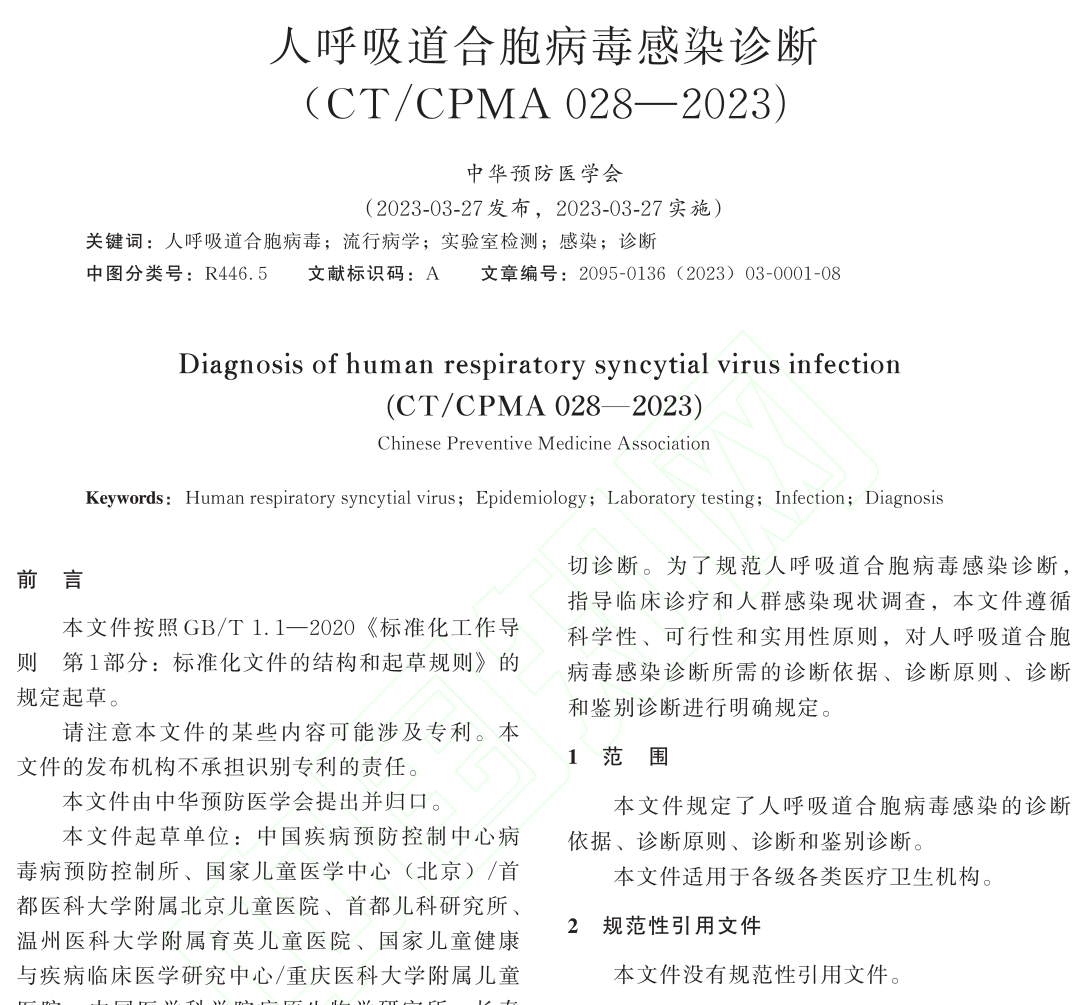 2023年3月27日,中华预防医学会发布《人呼吸道合胞病毒感染诊断(CT/CPMA 028—2023)》,并于2023年3月27日实施。该份文件新增RSV IgG抗体检测标准,目前是国内呼吸道合胞病毒(RSV)感染诊断最新标准指南文件。此外,该文件规定了人呼吸道合胞病毒感染的诊断依据、诊断原则、诊断和鉴别诊断,且适用于各级各类医疗卫生机。