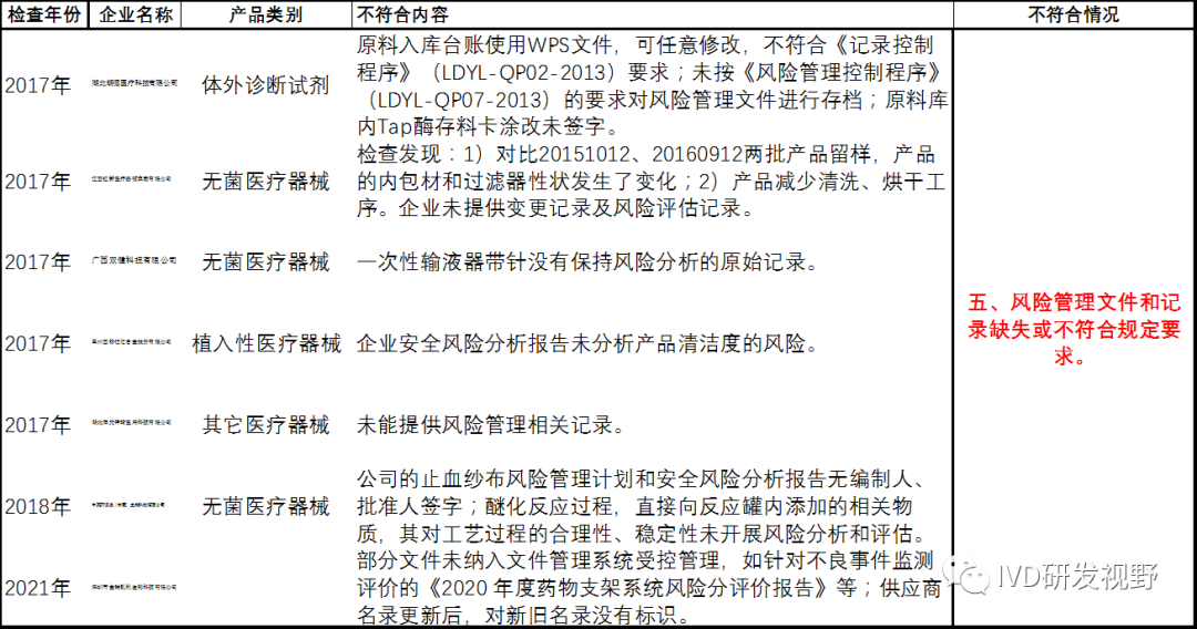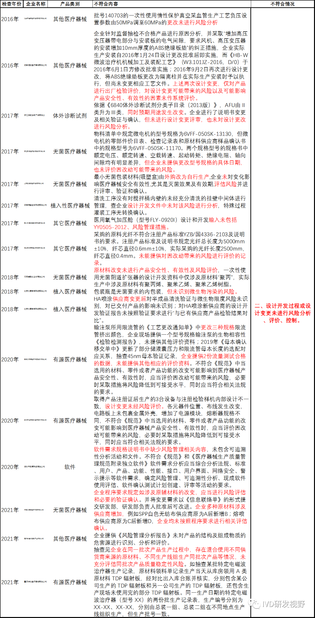 3.国家飞检不符合项风险管理相关的国家飞检不符合项主要集中在以下几方面:一、设计开发控制程序未规定风险管理要求;二、设计开发过程或设计变更未进行风险分析、评价、控制;三、生产检验过程存在污染风险或是质量风险,但未进行风险分析和控制;四、未进行产品上市后的不良事件风险评价或定期风险评价;五、风险管理文件和记录缺失或不符合规定要求。其中设计变更未进行风险分析和生产检验过程存在质量风险两种情况不符合项最多。 一、设计开发控制程序未规定风险管理要求