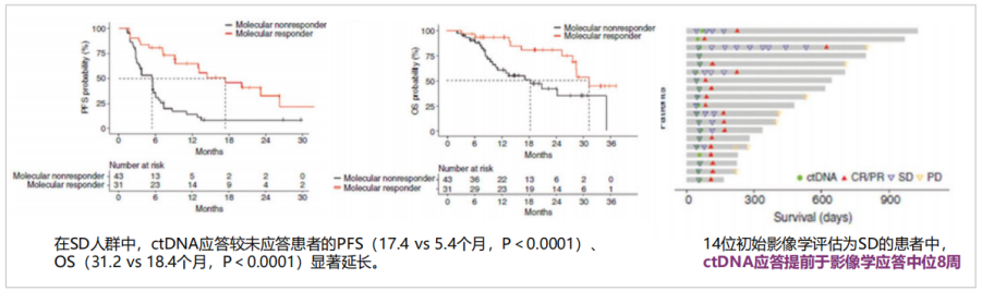 ctDNA-MRE在肿瘤治疗中应用 在刚刚举办的2023 ASCO会议上,有一项来自上海市肺科医院周彩存教授团队的研究2,研究发现在227名IIIB-IV期肺鳞癌患者中,使用臻和“MinerVa-Delta”技术平台,以70%作为cut-off值,可以明显区分出分子应答后,治疗获益人群,同时对于影像学表现为SD的患者,分子应答的患者相比较未应答患者有更好的获益。