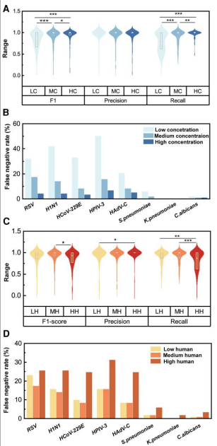 在相同宿主环境,不同微生物浓度的样品中,随着微生物负荷的增加,mNGS的召回率受到微生物浓度的显著影响(图A)。对于大多数微生物,假阴性率随着微生物浓度的增加而降低(图B)。在人类背景在2x105拷贝/毫升,大多数DNA和RNA病毒在效价高于104拷贝/毫升时,>80%的实验室能检测到;而>90%的实验室能检测到效价低于103拷贝/毫升的细菌和真菌。因此,检测病毒比检测其他微生物类型更具挑战性。