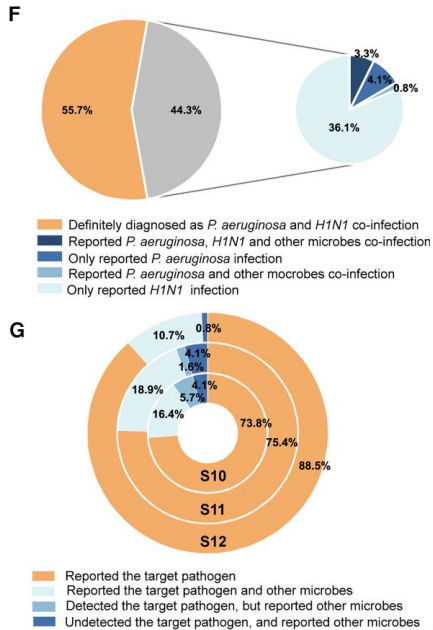 经过作者分析,浓度≥104拷贝/毫升产生假阴性的主要原因是湿实验室流程导至微生物序列丢失。对于RNA病毒,湿法实验室期间微生物序列的丢失也是导至RNA病毒假阴性结果的最常见原因,近85%的假阴性结果在生物信息学分析前留下不超过3个reads(图C)。真菌和细菌的假阴性结果都倾向于在数据预处理和去除人类序列的过程中丢失微生物序列(图D)。