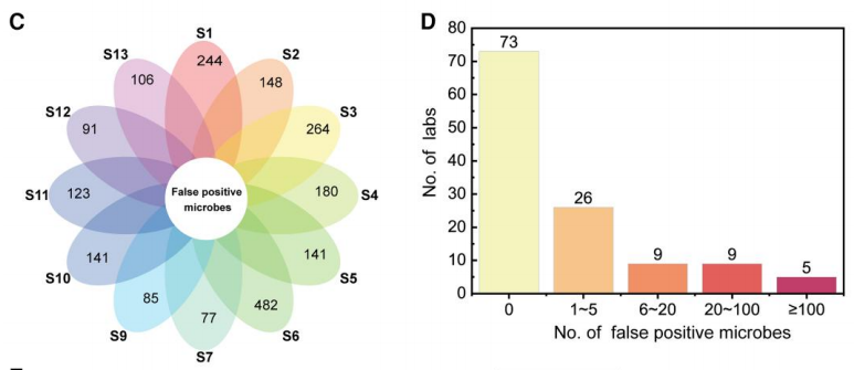 除样本S8外(临床BALF基质),样本S1至样本S13用于评估参与者的假阳性结果。在1464个人工微生物添加样本中,共报告了784个物种的2082个意外结果(图C)。49个(40.16%)实验室报告了至少一个假阳性微生物,观察到的数量从1到大约800(图D)。共有21.31%(26/122)的实验室报告了1到5个假阳性微生物。在784个假阳性微生物中,出现频率最高的是铜绿假单胞菌(P. aeruginosa)、痤疮丙酸杆菌(Cutibacterium acnes)和奥斯陆莫拉菌(Moraxella osloensis),分别出现38次、33次和30次。