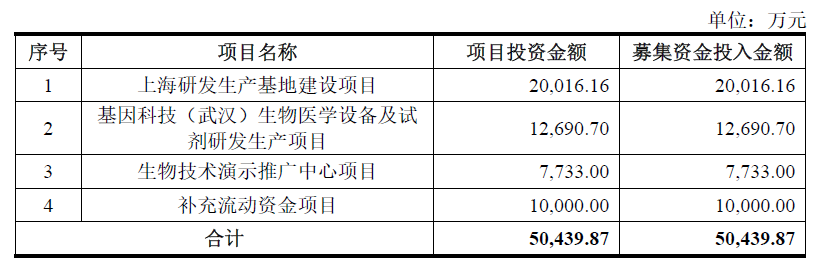 6月27日,基因科技(上海)股份有限公司(简称基因科技)向深交所创业板递交了IPO招股书,保荐机构为广发证券,拟募资5.044亿元,用于上海研发生产基地建设项目、基因科技(武汉)生物医学设备及试剂研发生产项目、生物技术演示推广中心项目以及补充流动资金项目。