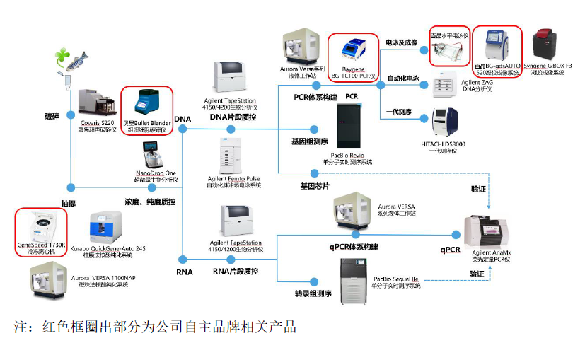 通过整合行业知名品牌产品,包括赛默飞、Agilent、纽英伦、雅培、PacBio、LI-COR、赛信通等以及自主品牌产品,搭建一站式综合服务模式,将自产和在全球范围内采购的实验仪器与试剂,销售给国内高等院校、科研机构、医院和生物医药企业。引进了包括半导体PCR仪、基因芯片、三代基因测序及单细胞测序、单细胞空间组学超分辨率成像分析系统、近红外激光成像系统、激光显微切割空间组学技术、一站式定量PCR技术(qPCR)、超微量样本分光光度计、高产单细胞分析分选系统、自动化电泳系统、量化成像分析流式细胞仪、高性能非接触式样本处理系统、细胞成像分析系统、单细胞(核)制备系统等在内的众多国际领先的生命科学技术。基因科技还借鉴赛默飞的发展思路,通过外延并购和自主研发构建产品矩阵,目前,基于公司掌握的核心技术开发形成的科研仪器产品已达50余项。