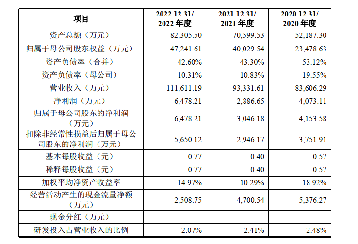 研发投入方面,2020-2022年,公司研发投入分别为2,073.72万元、2,252.64万元和2,315.88万元,占营业收入比重分别为2.48%、2.41%和2.07%。与同行业上市公司相比,研发投入比例处于行业下游水平且逐年递减。