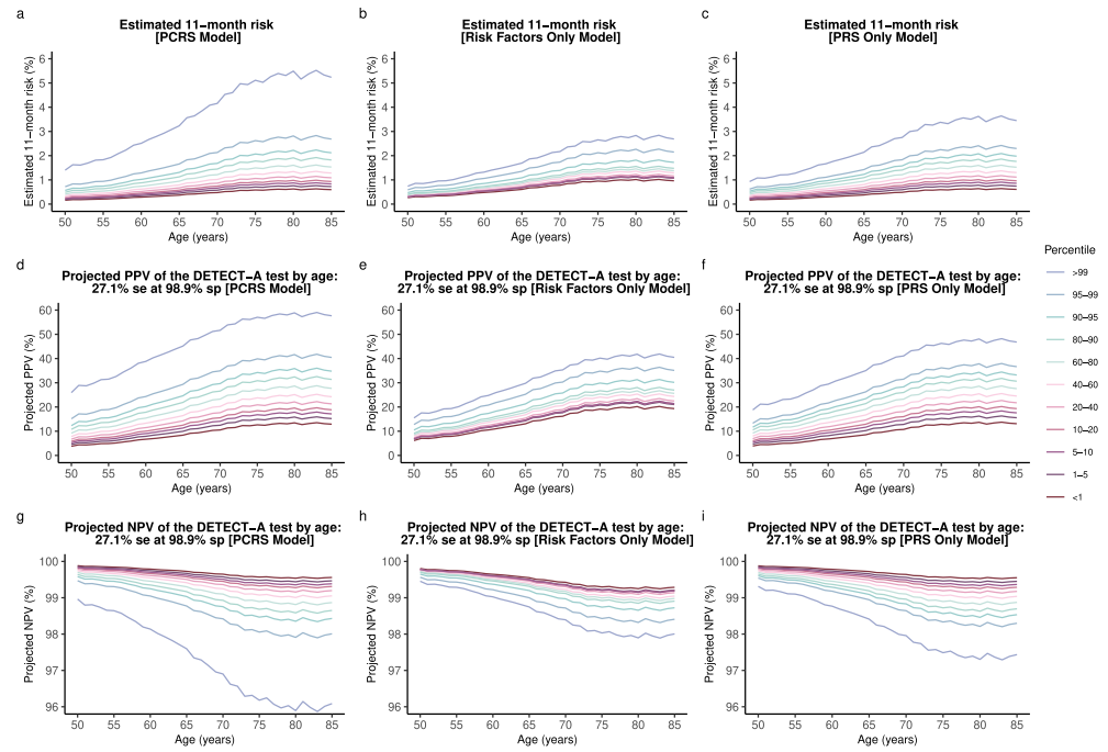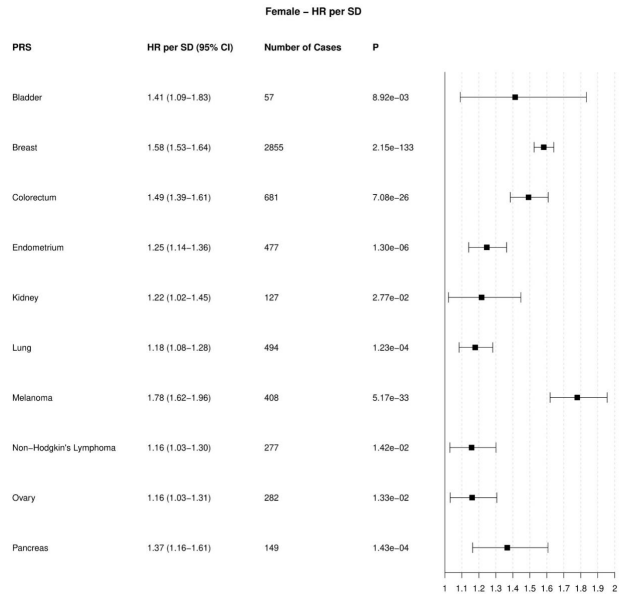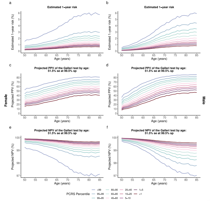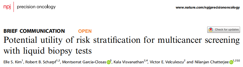 由于癌症晚期预后不良,开发有效的早期癌症检测筛查工具一直是一个迫切的需求。识别处于亚临床或无症状阶段的个体为早期干预提供了独特的机会,这已被证明可以提高生存率。在癌症患病率相对较低的一般人群中,理想情况下,筛查试验需要广泛可及、高度特异性和敏感性。筛查试验应具有特异性,以尽量减少与过度诊断相关的心理和经济负担以及与不必要的随访治疗相关的风险。由于这些原因,迄今为止,美国预防服务工作组只推荐了几种基于年龄的单一癌症筛查方式,如结直肠癌的结肠镜检查,乳腺癌的乳房X光检查,肺癌的低剂量计算机断层扫描,宫颈癌的巴氏涂片检查。 使用无细胞DNA (cfDNA)等分析物的多癌早期检测(MCED)液体活检试验越来越受到关注。比如GRAIL的Galleri和Thrive的DETECT-A测试。然而,低PPV(阳性预测值)问题仍然是新开发的多癌检测的一个重大限制。目前的MCED检测具有高特异性(99%或更高),但一般人群的PPV通常较低,因为一般人群的敏感性和癌症患病率较低。在未来,可能需要一种风险分层的方法来加强PPV和这些测试的风险-收益平衡。由于全基因组关联研究(GWASs)中出现了针对多种癌症的多基因风险评分(PRS),一项研究调查了PRSs和其他风险因素的潜在效用,以建立一个模型来预测癌症中至少一种风险,以了解生活方式改变对总体癌症风险的影响。 近日,一组来自约翰·霍普金斯大学的研究团队在杂志NPJ Precision Oncology上发表了一篇题为“Potential utility of risk stratification for multicancer screening with liquid biopsy tests”的文章。此概念验证研究揭示了年龄、多基因风险评分(PRS)和非遗传风险因素在增加快速出现的非侵入性多癌早期检测(MCED)液体活检检查的风险-收益平衡方面的风险分层的潜力。作者开发并验证了性别特异性泛癌症风险评分(PCRSs),该评分由体重指数、吸烟、癌症家族史和癌症特异性多基因风险评分(PRSs)联合定义,以预测罹患至少一种常见癌症类型的绝对风险。作者证明了PRSs在改善风险因素模型的预测性能方面的附加价值,并在年龄和PCRS定义的风险层中预测了两种有前途的多癌筛查试验的阳性和阴性预测值。 图片来源:NPJ Precision Oncology 主要内容 受试者信息 作者使用来自英国生物银行(UKBB)前瞻性研究和美国人口癌症发病率的数据,使用个人遗传和非遗传信息来估计未来的癌症风险。作者确定了女性和男性的十大癌症类型,且具有足够大且可公开获得的GWAS。最终分析涉及133,830名女性和115,207名无血缘关系的英国白人血统参与者,年龄在40-73岁之间,在随访过程中分别有5807和5906例膀胱癌、乳腺癌、结直肠、子宫内膜、肾癌、肺癌、黑色素瘤、非霍奇金淋巴瘤、卵巢、胰腺和前列腺癌。 使用模型概述 作者使用了性别特异性Cox比例风险回归模型,其中基线风险被指定为年龄的函数,并假设风险因素具有倍增效应。作者计算了11种(膀胱、乳腺、结直肠、子宫内膜、肾、肺、黑色素瘤、非霍奇金淋巴瘤、卵巢、胰腺和前列腺)癌症类型的PRSs(如下图)。纳入了两种主要的与生活方式相关的暴露,即吸烟(吸烟状况和吸烟量)和体重指数(BMI),已知会影响多种癌症的风险,以及生物学一级亲属的乳腺癌、结肠直肠癌、肺癌和前列腺癌家族史作为风险因素。然后计算泛癌风险评分(PCRSs)作为多癌Cox模型中包括的预测因子的加权和。使用长达5年的随访数据及标准化的瞬时风险比和曲线下面积(AUC)评估PCRSs的性能。作者假设个体携带无症状但可筛查到的癌症的概率与短期内(DETECT-A为11个月,Galleri为1年)内发生癌症的风险成正比。基于这些测试的报告诊断准确性,研究团队使用贝叶斯定理来确定DETECT-A和Galleri在PCRS百分位数和年龄上的预期PPVs和NPVs。 癌症类型的多基因风险评分(PRS)的估计风险比(HR)[女性]。图片来源:NPJ Precision Oncology 模型性能 正如预期的那样,在UKBB研究的随访期间,PCRSs与女性(HR: 1.39 per 1 SD)和男性(HR: 1.43 per 1 SD)中发生至少一种癌症的风险密切相关。通过年龄、癌症特异性多基因风险评分和多种癌症类型共有的常规危险因素的综合影响,作者观察到多种癌症的风险分层程度很强(如下图)。仅PRS模型(女性AUC: 0.58,男性AUC: 0.59)、仅风险因素模型(女性AUC: 0.55,男性AUC: 0.57)和联合PCRS模型(女性AUC: 0.60,男性AUC: 0.62)在不同年龄和风险阶层的1年和10年轨迹的比较,进一步证明了癌症特异性PRSs作为协变量在改善多癌风险分层和预测模型性能方面的附加价值。综合(即PCRS)模型显示,75岁以上的高风险女性(前10个百分位)的平均1年总体绝对癌症风险为3.58%,而相同年龄的低风险女性(后10个百分位)的平均1年总体绝对癌症风险为0.77%,而风险因素单一模型显示,高风险组和低风险组之间的总体癌症风险分层水平较低,1年绝对风险分别为2.36%和1.12%。 此外,MCED检测(Galleri检测灵敏度为51.5%,特异度为99.5%; DETECT-A检测灵敏度为27.1%,特异度为98.9%)的预测PPV因人群分层潜在风险水平和液体活检检测准确性而有很大差异。例如,在90 - 95个PCRS百分位数(AR: 2.27%)的75岁女性与在5- 10个PCRS百分位数(AR: 0.89%)的同龄女性相比,1年的风险增加2.6倍(下图a)。两种测试在所有阶层的所有风险百分位数上的NPV都很高(下图e、f)。 预计的1年绝对风险和Galleri检验预测的PPV和NPV。 图片来源:NPJ Precision Oncology 临床环境的转化 作为在临床环境中整合这些新的多癌筛查试验的第一步,可