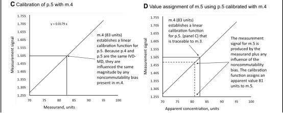 在计量上可溯源的校准等级中 哪个校准品必须与临床样品是可互换的 使用不同终端用户的体外诊断设施(IVD-MD)检测临床样品中相同被测量具有等同结果,是为诊断、治疗、监视、或风险评估是必须的。ISO 17511:2020规定了如何建立计量溯源性到较高等级可用的参考系统成分,使得在IVD-MD间有等同的结果。与临床样品(CS)互换性是参考物质在校准等级中作为一个校准品的必须特性。但是,在校准等级中不是所有校准品被要求是可互换的;不同校准等级对哪个校准品必须与CS具有可互换具有不同的要求。因为互换性的评估是一个艰巨的努力,所以,重要的是,在实施某个校准等级时,确定哪些校准品需要可互换的。我们提供了一个指导,在纠正任何不可互换的偏移是适当下,哪些校准品必须与CS是可互换的;以及在ISO 17511:2020中,叙述的各个类型校准等级中,没有要求校准品与CS的互换性。 背景 使用不同终端用户的体外诊断设施(IVD-MD)检测临床样品中相同被测量具有等同结果,是为诊断、治疗、监视、或风险评估是必须的。ISO 17511:2020规定了如何建立计量溯源性到较高等级可用的参考系统成分,使得在IVD-MD间有等同的结果(1)。计量溯源性是通过系列校准步骤的一个不间断链,从可用的最高参考物质(RM)和/或参考检测程序(RMP),到临床样品(CS)的最后结果。一个IVD-MD的最合适的计量溯源性是SI制单位,其中计量溯源性被校准等级确定,开始于较高等级RN或RMP,依从了各自ISO 15194(2)或15193(3)标准。 计量溯源性到较高等级的参考系统组分。使得在不同时间和地点,和不同终端用户IVD-MD间得到一致的校准等级。ISO 17511:2020叙述了校准等级的示例,说明溯源性到SI和较高等级的参考系统组分是可能的,其他情况仅为可用的技术方式,是校准等级没有包括较高等级RM和/或检测程序(MP),作为厂商选定的指定RM(1)。 ISO 17511:2020在多个地方提示了RM互换性和校准品可应用在给定校准等级处的重要性。但是,没有提供明确的指导,在一个等级内的特定校准品,必须与CS是可互换的,或互换性不是必须的。一个校准品未被检出的不可互换性,会引起某个MP具有偏移。因为评估互换性是一个很艰巨的努力,很重要的是确定,在实施IVD-MD的校准等级中,哪个校准品需要与CS是可互换的。 国际计量学词汇定义参考物质的互换性:对于给定物质的规定量,由两个给定测量程序(MP)得到的测量结果间关系,与其他指定物质测量结果间关系一致程度表示的参考物质(RM)的特性(4)。在检验医学,“其他指定物质”是临床样品(CS)。互换性可以定义为:更有功能的叙述,为某个RM的特性,以两个或更多的检测系统检测,对RM的检测响应,与含有相同规定被测量的量临床样品是相同的。 在合适相应下,某个RM的互换性可以按照文献的技术叙述予以评估(5-7)。一个溶液的基质包括所有除了分析物外的所有分子和离子。在校准物质的基质,与CS的基质有足够差异下,将偏移引入某个MP的校准等级,引起了不可互换性。在相应环境下,不可互换性的偏移可以在添加某个纠正步骤到校准等级中去除(8)。 本报告中,在ISO 17511:2020中叙述的一些校准等级通用模式中,我们提供了指导,就某个校准等级中哪些校准品,必须与CS是可互换的,何时对不可互换性的偏移的纠正是合适的,何时一个校准品的互换性不是要求的。因为在ISO 17511:2020展现的校准等级模式,会应用在被不同IVD厂商各个不同配置到适应可用的RM和MP,这里给出的示例,代表了特定的实施,去展现逻辑被应用去确定,是否在某个特定校准等级中对校准品要求互换性。展现的概念也可被应用到需要的校准等级的各个其他需要的基质等级的配置。 在要求和不要求校准品的换性的指导和示例 在图1、2和3中,展现的校准等级中的每个步骤,按照ISO 17511:2020确定的习俗标记缩略号。这些缩略号确定了检测程序的标准等级水平(指定为p.1到p.6),和校准物质(设定为m.1到m.6)在确定的校准等级内每个在水平处展开。对每一个这些标准词语以及详细解释,在计量上可溯源的校准等级内在ISO 17511:2020内给出相应缩略号,并总结在表1中。 一个 “完整”计量溯源性到SI,如在ISO 17511:2020,5.2内叙述的,被展现在图1A。被广泛接受的做法是,使用一组真实CS(m.3),将一个p.3 RMP的值转换到m.4和/或p.6终端用户IVD-MD,对于m.3 RM去用于临床实验室为CS(m.6)确定值。按照定义一组真实CS被接受为可互换的,以及被选定的CS组在制备和储存中没有变化,该组没有包括具有干扰物质或其他标本-特定的已知影响的CS,会不利地影响p.4 MP的性能,其中该组CS被用于进行校准(5)。作为p.5常设MP的校准品的功能,m.4厂商的应用校准品(一级批校准品),通常由IVD-MD厂商制备,应是稳定和可用许多年,去支持未来正在序列批的m.5终端用户IVD-MD校准品设定值(该校准品一年内有多批)。使用m.4应用校准品,替代了m.3一组CS。去校准p.5常设MP,为此节省了连续的、设定值、和保持CS组等的费用。 若可能,可要求替代一个有证参考物质(CRM),它与该组CS处于m.3位置的是可互换的,使得IVD-MD厂商在实施计量溯源性较早,并较少的费用。同于m.3位置的CRM,为二级CRM,有别于在m.1位置的一级(纯物质)CRM。二级m.3 CRM经常具有的基质类似于CS,促使与未改变的CS具有互换性。为该被测量的可互换的m.3 CRM,由国家计量研究院产生,预期被用于所有IVD厂商,作为它们各自的内部基质等级,去实现为CS在许