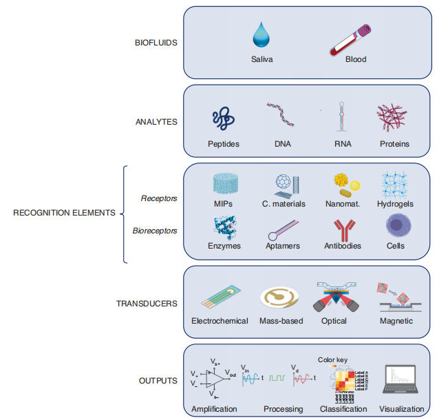 研究人员已经研究了几种材料(碳基或金基材料)作为生物传感器发展的有希望的替代品。石墨烯等先进的碳材料虽然价格昂贵,但其生产方法正在不断发展,而且资源丰富。金基材料结构简单,功能方便。电化学、光学和声学转导广泛用于开发检测唾液炎症生物标志物的生物传感器。电化学技术具有通用性、低成本和高便携性;光信号转导具有高灵敏度和选择性。声信号转导,可以改进信号采集达到非常低的检测限,但由于对高频率的依赖,在护理点的应用仍然存在局限性。