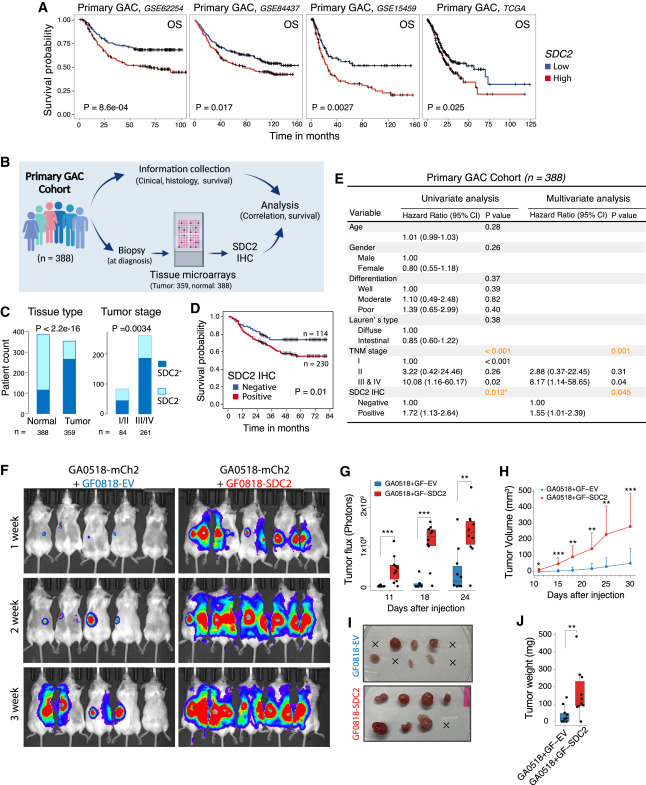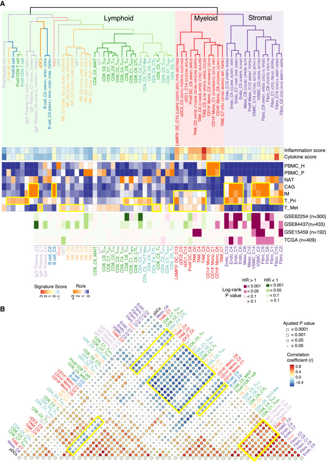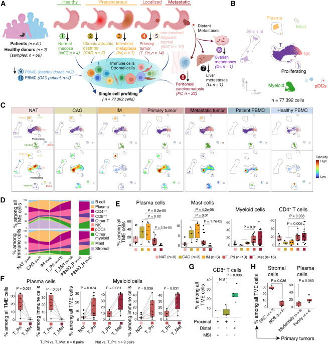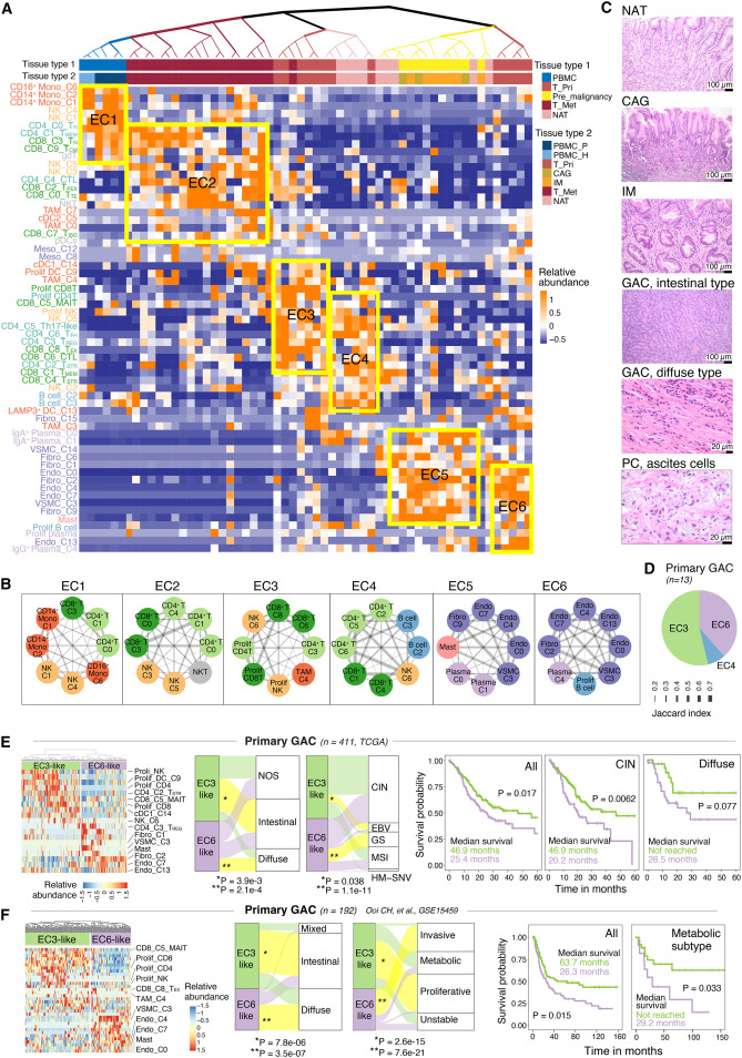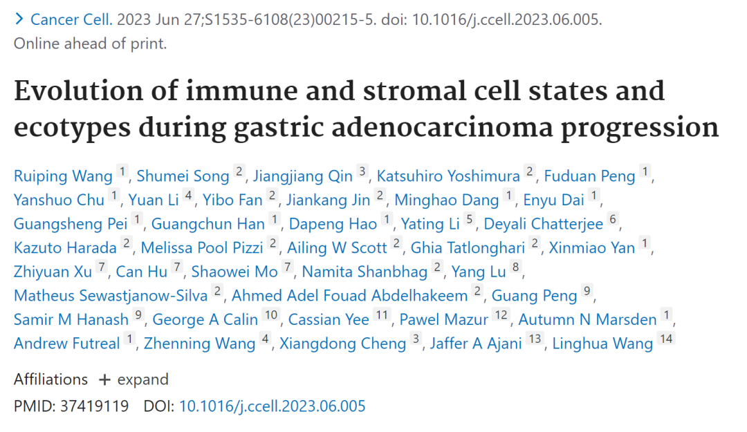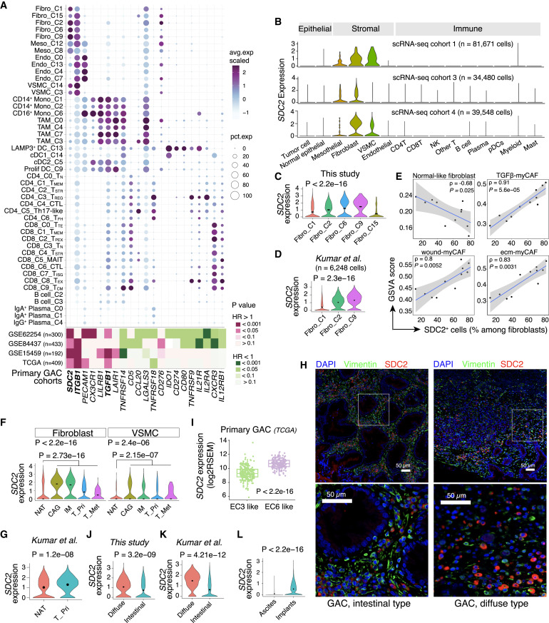 胃腺癌(GAC)属于胃癌的一种,由胃腺体细胞恶变形成,其疾病进展迅速、治疗耐药性和转移率较高,是世界上最致命的癌症之一。其中,腹膜转移(PC)是常见的胃癌转移形式,发生在约45%患者中,占所有复发患者的60%,多数患者在6个月内死亡。目前,亟需开发在GAC早期或癌前阶段有效的治疗策略,但人们对从癌前病变如慢性萎缩性胃炎(CAG)和肠上皮化生(IM)到原发性GAC再到转移这一演变背后的分子机制尚不清楚。 对GAC进展过程中不断变化的肿瘤微环境(TME)进行深入分析,能够极大地促进治疗的发展,并揭示各种免疫抑制机制和潜在的治疗靶点。因此,了解TME的复杂性至关重要。迄今为止,传统方法主要集中在GAC肿瘤细胞上,仅有少数研究探索了GAC的免疫和基质亚型,提供了有价值的见解,但受到范围、队列大小、分析深度等限制。人们对各种免疫细胞和基质细胞亚群在GAC进展过程中的演变仍知之甚少。 近日,美国德克萨斯大学MD安德森癌症中心的研究团队在Cancer Cell上发表了题为“Evolution of immune and stromal cell states and ecotypes during gastric adenocarcinoma progression”的文章。研究团队对癌前病变、局部和转移性GAC进行了单细胞分析,表征了GAC不同阶段TME中不同的免疫和基质细胞群,包括转录状态、细胞组成、分化轨迹、细胞间相互作用以及细胞生态类型(ecotype)。研究团队共鉴定出6种TME生态型(EC1-6),并发现大量IgA+浆细胞存在于癌前TME中,而免疫抑制的髓细胞亚群和基质亚群在晚期GAC中占主导地位。综上,该研究提供了GAC进展过程中免疫和基质细胞演变的详细图谱,揭示了潜在的治疗靶点,并为未来的相关研究提供了宝贵的资源。 研究团队对来自43名胃腺癌患者68个样本中的免疫细胞和基质细胞进行单细胞RNA测序(scRNA-seq),样本涵盖GAC发展的不同阶段,如癌前病变(CAG和IM)、原发GAC和腹膜、卵巢和肝脏的转移灶(图1)。此外,研究团队还收集部分患者配对的非肿瘤肿瘤旁组织(NAT)、正常胃组织(NGT)和外周血单核细胞(PBMC)样本。经严格的质量过滤,最终保留了77,392个高质量细胞用于后续分析。 接下来使用无监督聚类分析,研究团队将上述细胞分为10个不同的细胞谱系,并进一步细分为3种主要的细胞类型,即淋巴细胞(77%,如T、B、NK和浆细胞)、髓系细胞(13%,如pDC、肥大细胞、其他髓细胞)和基质细胞(10%,如成纤维细胞、内皮细胞和间皮细胞)。通过对每一个细胞类型进行亚群分析,最终识别了62个不同的细胞亚群。 为更好地表征GAC的TME图谱,研究团队分析了上述62个细胞亚群的相对丰度和表型关系,并通过无监督层次聚类量化其转录组相似性(图2)。结果显示,基质细胞、浆细胞和肥大细胞亚群主要分布在组织样本中,并在CAG/IM中高度富集;PBMC和PC中富集单核细胞群。原发GAC表现出增殖淋巴样细胞、CD4+ TREG、CD4/ CD8+ TSTR和CD8+ TEX的富集,而转移GAC表现出先天免疫细胞、CD4+/ CD8+ TN和CTL水平的增加。此外,随着GAC的进展,浆细胞显著减少,髓细胞增加。综上,该研究揭示了随着GAC进展过程中TME的演变,并提示肿瘤相关的基质细胞和免疫细胞之间可能存在相互作用。 为探究不同免疫和基质细胞亚群如何形成特定的“生态系统(ecosystem)”,以及这些生态系统在GAC不同进展过程的变化,研究团队量化了58个样本的细胞组成,并分析了各细胞之间的关系以及共存模式,即细胞生态型(ecotype)(图3)。结果显示,共发现6个细胞生态型(EC1-6),每个生态型都具有特定的细胞类型/状态,并表现出独特的细胞组成和共存模式。 EC1包括所有的PBMC样本,主要由单核细胞、NK细胞和CD4+/CD8+ T细胞组成,仅存在于血液中;EC2、EC4和EC5分别在转移灶、未受累组织、癌前病变中富集;EC3和EC6是原发性GAC中的两种不同生态型,富集于原位癌组织中并与组织病理学、基因组特征以及患者生存相关。EC3和EC6的细胞组成存在显著差异:EC3主要由CD4+ T细胞、CD8+ T细胞、NK细胞、MAIT细胞和DC等免疫细胞组成,而EC6则主要由基质细胞亚群组成。此外,与EC3生态型患者相比,EC6生态型患者的生存期显著缩短。 为识别免疫和基质细胞中的潜在靶点,研究团队对157个基因进行了综合分析,包括免疫检查点基因和其他已知或新发现的免疫调节基因(图4)。结果显示,有21个基因在公共GAC队列中显示与生存结果显著相关,其中SDC2、ITGB1和TGFB1在超3个GAC队列中与生存率显著相关。进一步分析显示,SDC2在癌前病变和原发癌的基质细胞中的表达水平显著高于正常组织,并在myCAF型成纤维细胞中表达最高,表明其在GAC进展中可能存在潜在作用。 为验证SDC2在GAC队列中的临床意义,研究团队通过组织微阵列分析了一个独立的原发性GAC队列中(359名患者)SDC2的表达水平。结果显示,SDC2主要存在于基质细胞及肿瘤细胞的细胞质和细胞膜中;SDC2表达与肿瘤分期存在显著相关性。GAC组织中,SDC2的高表达与较短的生存期相关;在肿瘤相关成纤维细胞中,SDC2的表达水平与疾病的侵袭性表型相关。此外,与早期GAC相比,晚期GAC中SDC2的表达显著增加。综上所述,SDC2在肿瘤间质中的基因和蛋白水平均表达上调,其高表达水平与肿瘤进展和不良生存率显著相关,且独立于其他临床或组织病理学变量。 综上所述,该研究收集并分析了来自胃腺癌癌前病变、原发病灶、转移组织的单细胞RNA测序(scRNA-seq)数据,以及未受累的正常组织和外周血样本,共鉴定出6种TME生态型。此外,研究团队还发现广泛的间质重塑发生在