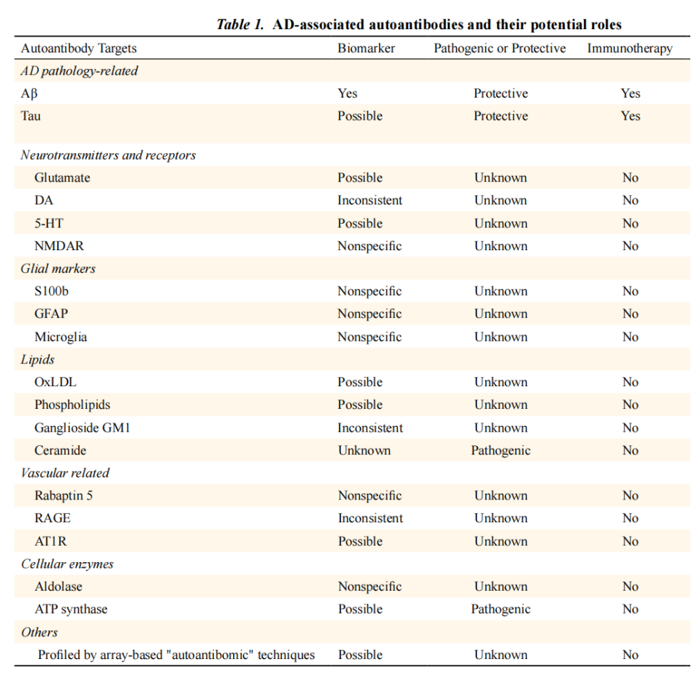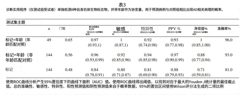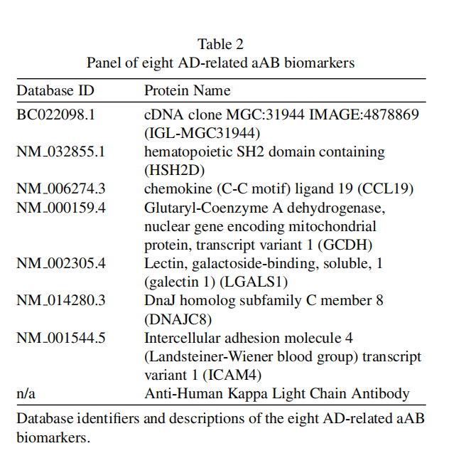 | 诊断公司 Durin Technologies 正致力于将8种自身抗体组成的血液检测套餐,用于早期检测阿尔茨海默病的血液检测商业化。负责人贝林卡说,尽管Durin已经营业十多年,但它仍然是一家小型企业,大约有五名员工。他表示,该公司在 2019 年筹集了 350 万美元的资金,迄今为止大部分资金都是由单一家族办公室提供的。他表示,Durin 计划额外筹集 1000 万至 1300 万美元,用于资助通过 FDA 进行该测试或将其作为 LDT 推出的过程。通过检测一下自身抗体,建立预测模型,预测AD疾病准确率为81.0%,曲线下面积(AUC)为0.84(95%CI=0.78–0.91)。将年龄作为模型的参数提高了AUC(0.96;95%CI=0.93–0.99)和总体准确性(93.0%)。  总体看曲线下面积还是比较大。标志物做到的(机翻)  5人的小公司果然就是要专攻偏门,发现的这几种自身抗体,也不是常见的自免疾病抗体和AD症标志物抗体。具体效果还需要观察。找到一篇综述文章分析了现有AD自身抗体及潜在的作用: Aβ沉积是AD致病原因之一,所以很好理解Aβ自身抗体,可以结合致病的Aβ,从而起到保护作用。但机体产生的少量Aβ自身抗体无法阻止AD症的发展。检测时要关注游离和结合的Aβ自身抗体,最终发现Aβ自身抗体轻度至中度阶段上升,然后在中度至重度期下降。Tau蛋白自身抗体原理上能够阻止神经原纤维缠结,对AD症患者有保护作用。在AD症患者组中含量高于对照组,但Tau蛋白自身抗体并不能在患者中普遍检出,其作用也需要进一步研究。其他表中的自身抗体在biomarker一栏,标注possible表示可能作为标志物进行应用。就像一把双刃剑一样,自身抗体可以发挥有害和保护作用。在病理条件下,自身抗体干扰细胞功能,引发严重的炎症反应,导至脑组织损伤和自身免疫性疾病。在生理条件下,自身抗体赋予免疫耐受性,减轻炎症反应,并促进有毒蛋白的清除。这些自身抗体的有益作用为开发抗Aβ和抗tau蛋白免疫疗法提供了基础。然而,许多自身抗体的确切作用目前尚不清楚。一些自身抗体与疾病的状态特异性相关,因此可以作为阿尔茨海默病的诊断/预后生物标志物。综合看来自身抗体作为AD诊断标志物,仍需要更多研究。相反在治疗中的作用可能更加明确。 |