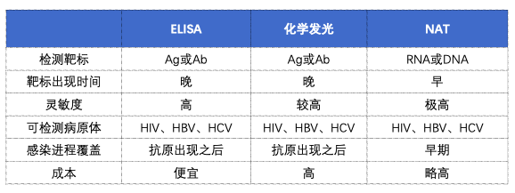| 术前三项又可称为血源性病原体核酸筛查,病原体筛查是指病人在入院期间,在进行输血、手术、血液透析、牙科治疗等之前所进行的针对传染性微生物的检查。检测内容:乙肝病毒、丙肝病毒、艾滋病病毒。 虽然Elisa(酶免疫分析)方法广泛用于术前检查(检查抗原抗体,不直接检测病毒),但仍有少数新发感染病例的报道。而NAT(核酸检测) 技术的引入可使传染性疾病感染危险性降到最低。 核酸检测是现行术前检测技术的有益补充甚至是替代技术,应用核酸检测技术进行血源性传染病核酸检测具有高灵敏度和高特异性、能显著缩短病毒检测窗口期等特点。  乙型肝炎病毒(HBV)和丙型肝炎病毒(HCV)是肝细胞癌(Hepatocellular carcinoma,HCC)的主要病原体。全球约 80% 的肝癌病例是由 HBV 和 HCV 两种病毒的长期感染引起的,其中前者的比例更大。HBV 和 HCV 可通过多种途径影响肝癌的发生和发展;HIV和他们有共同的传播形式,因感染途径相似,HBV感染可由HIV感染所致,而HIV感染患者(约90%)也可经相似的感染途径感染HBV。劣势:虽然制备简单,成本低,但是不能参与核酸提取过程