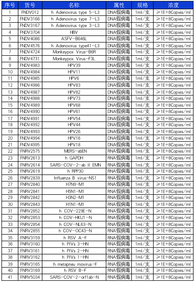 由人工制备包裹核酸物质的病毒样颗粒,与检测靶病毒有着非常相似的结构优势:可再生 安全性高 可参与样本提取进行扩增流程质控质控品是质量保证的重要物质之一,可用于评价检验结果的准确度,确保能提供可靠且均一的结果;应尽可能模拟真实样本,以更好地监测检验结果是否准确可靠。 复百澳生物是一家专注于“基因递送载体产品研发与临床转化”的平台型公司,公司先后被评为国家级园区领军人才企业、江苏省民营科技企业、中小型科技企业。团队成员深耕病毒载体研发及工艺开发领域,有丰富的病毒载体研发和工艺开发经验,秉承 “品质、创新、协作、共赢”的精神,坚持创新,聚焦于病毒及类病毒(VLP)基因递送载体产品的研发。拥有国内涵盖领域最全、品种最多的病毒载体库,可以在极短时间内完成基因递送载体产品开发与服务。  产品订购| 销售与技术支持 | 联系电话 | | 谢经理 | 13052518221 | | 缪经理 | 13862593400 | | 江经理 | 15371815028 | | 纪经理 | 19901470592 | | 技术支持 | 400-8792-452 |