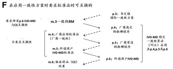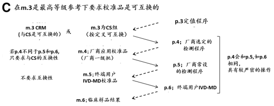 在计量上可溯源的校准等级中 哪个校准品必须与临床样品是可互换的 接上文 图3、(A)组为p.4是与p.5和p.6不同的MP(它们的每一个是相同IVD-MD的示例)下,校准品必须与临床样品是可互换的校准等级。(B)组为没有满足m.4互换性的要求下,将纠正不可互换性偏移的步骤添加到校准等级。步骤p.4a是纠正程序,应用在为m.4定值,去实现m.4a新的定值,再用于校准p.5。(C)组为加注的校准等级,说明校准品必须与临床样品是可互换的,m.3 CRM或CS组是最高等级参考系统的组分。(D)组为加注的校准等级,说明校准品必须与临床样品是可互换的,在p.4选定MP是不同厂商的终端用户IVD-MD,没有其他较高等级参考系统组分可用。(E)组为加注的校准等级,说明校准品必须与临床样品是可互换的,在较高等级纯物质CRM或含有被测量的指定RM,是添加了适当基质形成了m.4应用校准品,没有其他较高等级参考系统组分可用。(F)组为加注的校准等级,说明校准品必须与临床样品是可互换的,而一致性方案是可用的最高等级参考系统组分。所有符号和箭头参见图1。NC为不可互换性。 (注:上面的各个图,我也已经全部放大在下面翻译。冯) 左右滑动,查看更多 在p.4,p.5和p.6均为相同厂商生产的相同IVD-MD的情况 图1B展现了计量溯源性到某个m.1纯物质CRM,在校准等级中的RM必须与CS在MP情况下时可互换的。m.1 CRM是纯物质RM,它与互换性没有关系。为被测量的p.3 RMP的p.3 RMP的m.2 校准品,由m.1 CRM制备。对很好指定(设计)的p.3 RMP应用,经典地不需要与CS的互换性,在m.2的一级校准品基质和m.3 CRM基质二者具有高度的选择性。某个p.3 RMP的性能特性,应不受被检测样品的基质的影响,理想地,应依从ISO 15193的要求(见ISO 17511:2020, ),对者m.2中的被测量是高度选择的(1,3)。 在图1,B中,p.4厂商选定MP、p.5厂商常设MP、和p.6终端用户IVD-MD,是由厂商产生的相同IVD-MD的所有示例。在用于p.4和p.5角色中,IVD-MD典型地以对关键检测系统要素增加了重复检测,如校准品(如,在加到每一个重复检测中的不同瓶数或分样)、CS、和仪器(如,分析仪相同型号台数和/或版本),较按照在p.6终端用户IVD-MD使用说明的要多。使用这些更严密的操作条件,去减少为m.4和m.5校准品定值的检测不确定度。使用相同IVD-MD作为p.4、p.5、和p.6,是IVD-MD厂商的惯例。在这些情况下,在使用p.6的终端用户IVD-MD检测时,要求m,3 CRM与CS可互换,理想地,CRM预期被作为所有厂商IVD-MD的共同校准品。注意,在较早讨论的纠正可能性,若需要,某个特定终端用户IVD-MD,对CRM与CS不可互换的校准等级中,m.3中的不可互换性的偏移需要纠正(8)。 原则上,可互换的m.3 CRM可以用于直接校准所有厂商的p.6终端用户IVD-MD,直接供应m3 CRM给所有终端用户临床实验室,成本太高。而且不实际。因此,IVD-MD厂商典型地制备了m.4应用(一级批)校准品和m.5 终端用户校准品,将可互换的m.3 CRM的值转换给医学实验室检测的m.6 CS结果,只要使用厂商的p.6 终端用户IVD-MD。m.4“一级批”的批量较小,被预期可储存和可用许多年,厂商去校准p.5,被用于为m.5终端用户校准品成功批号定值,通常可以制备较大批量销售给终端用户。依据生产要求,不同批号m.5可以每年制备数批 成为终端用户校准品提供给医学实验室。 m.4和m.5 IVD-MD厂商特定校准品的基质,可以只要适合目的即可,使用IVD-MD厂商的p.6 IVD-MD,将可互换的m.3 CRM(用于所有IVD-MD厂商的共同校准品)的值,转换到m.6 的CS。m.4和m.5校准品没有必须以相同基质制备,也不用于CS具有相同基质,因为它们仅用于特定厂商的IVD-MD。m.4和m.5校准品可以使用纯化化学物,作为初始材料制备(如在缓冲的牛白蛋白溶液或一个水溶液中的分析物)为提供renewable可更新的物质,适合涉及p.4,p.5,和p.6技术的检测。以纯化的化学物制备的m.4和m.5校准品,可产生非常可再现的批间产品,在校准等级的p.4,p.5和p.6位置使用IVD-MD检测,将具有非常一致和可预期的性能。 图2展现了,为什么m.4厂商的应用校准品和m.5 终端用户IVD-MD的校准品,不需要于CS可互换,这是使用的相同IVD-MD作为p.4厂商的选定MP、p.5厂商厂商MP、和p.6终端用户IVD-MD的例子。很重要的要认识,m.4和m,5被预期仅用在为规定的终端用户IVD-MD校准等级;它们没有预期用在任何其他IVD-MD的校准等级。在这些示例中,使用线性校准函数展现和逻辑可推广到非线性连续响应校准函数。在等级中从某个RM值转换到下一个的序列,和为什么一个可互换RM不需要在图2的所有步骤中,叙述如下: 1、 图2A,可互换m.3 CRM(设定值87单位),使用MP p.4具有的检测信号1.560,为p.4建立了线性校准函数,从0到95单位。 2、 图2B,物质m.4,厂商一级批校准品,使用MP p.4的信号1.483。产生的检测信号是由被测量加上与基质有关的不可互换偏移影响。因此,校准函数对m.4设定了值83单位,反映了被测量浓度受到任何不可互换性的偏移影响,具有了受影响的检测信号。任何不可互换性偏移的大小,在为m.4设定值上没有关联,纠正了不可互换性偏移被测量实际值也没有关联。 3、 图2C,物质m.4(设定值83单位),使用MP p.5具有的检测信号1.505,建立了p.5的校准函数。p.5的校准函数的斜率不同于p.4校准函数的斜率,因为这是相同IVD-MDp.4和p.5的不同例子。但是,因为p.4和p.5是相同的IVD-MD,它们受到实际上存在于m.4内任何不可互换性偏移的影响程度是相同的。因此,p.5的校准函数(以m.4校准)正确地反映了从可互换m.3转换到m.4,p.5的线性校准函
