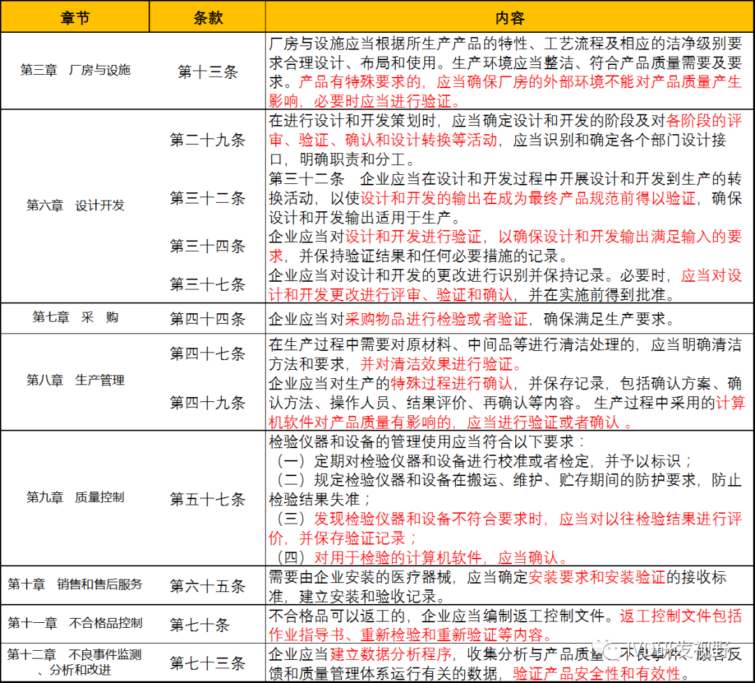 (2)《医疗器械生产质量管理规范》有8个章节和12个条款对验证作了规定。