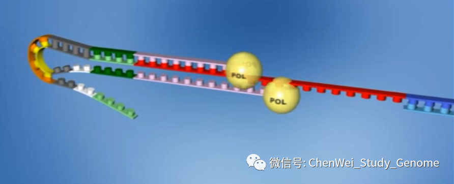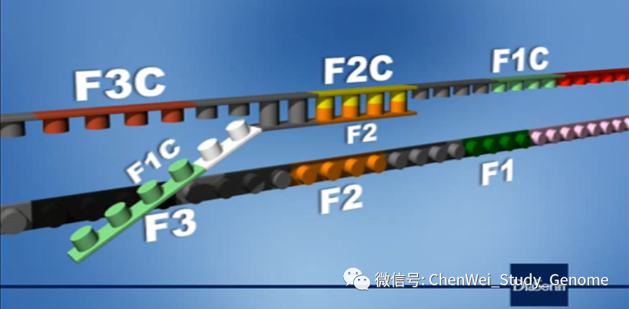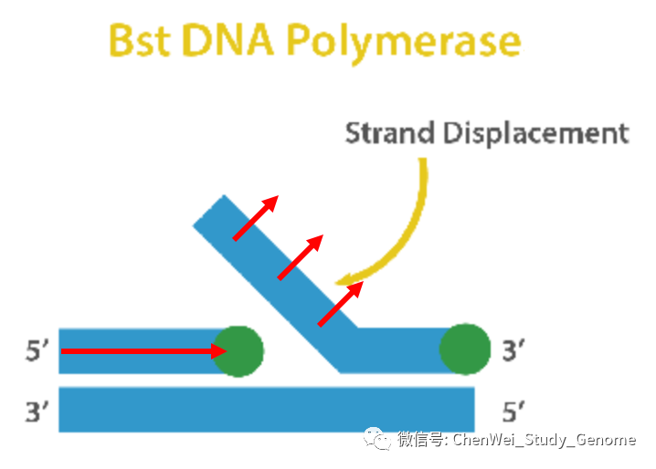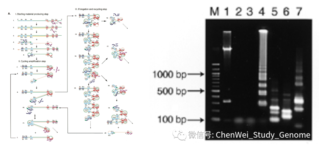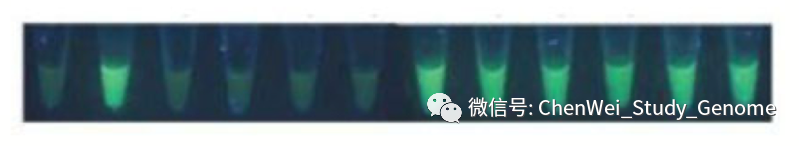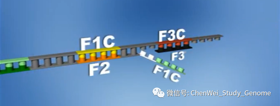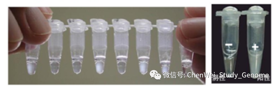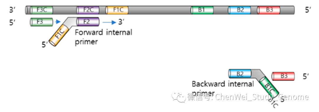 LAMP分子检测是一种类似于荧光定量PCR的技术。但是LAMP检测比定量PCR更加简便,速度更快,价格很便宜,灵敏度高,特异性也高。 ①LAMP的操作更加简便,只要有离心机和60°C恒温水浴就可以操作; ②LAMP的检测速度快,只需30分钟就可以完成检测反应; ③LAMP的检测成本很低,我查到网上售卖的LAMP检测试剂盒大约十几元人民币一个反应; ④LAMP检测的特异性和灵敏度都很高。 #01 LAMP概述 LAMP 是“Loop-mediated isothermal amplification”的首字母缩写。翻成中文,是“环介导等温扩增”的意思。 这项技术最早是由日本科学家Tsugunori Notomi在2000年首先提出。 这是一种比传统PCR更加容易操作的核酸扩增技术。它不需要热循环仪,只需要60~65 °C的恒温水浴就可以操作。 检测结果可以通过肉眼进行判断。 #02 LAMP工作原理 LAMP 实验中要用到 Bst DNA 聚合酶。它实际上天然 Bst DNA 聚合酶的大片段部分。Bst DNA 聚合酶大片段保留了天然 Bst DNA 聚合酶的一个重要的特点,就是在进行聚合反应时,它可把被复制的 DNA 双链中的那条非模板链推开。 之所以要用 Bst DNA 聚合酶的大片段,是因为这可以去掉天然 Bst DNA 聚合酶的小片段中所具有的 DNA 5’ 端外切酶和 3’ 端外切酶的酶活性。 另外,这个酶还可以在 65 °C 的较高温度条件下,在较长时间内保持酶活性。 这是 LAMP 的引物设计。 先看左侧,左侧设计有 2 个引物。先是 forward outer primer,翻译成中文就是“正向的外侧引物”。这个引物的序列是针对目标序列左边外侧的 F3C 序列的,这里 F 是 forward 的意思;3 是指第三段序列;C 是 complementary,“互补”的意思。 接下来,是 forward internal primer,翻成中文是“正向的内侧引物”。它的序列分成两段,其中 F2 段是与所针对的目标序列上的 F2C 段序列相互补的。它的另一段序列,是 F1C 序列,这段序列是与模板上的 F1C 序列是一样的。注意:它是与模板上的 F1C 序列一样,而不是与 F1C 序列互补。 再看右侧的 2 个引物。其实,右侧的两个引物与左侧的两个引物的设计是相似的,只不过方向倒过来。并且引物和引物所针对的目标模板序列的标识,都改成了“B”开头的,也就是 Backward,翻成中文是“反向”意思。 我在网上找到了一段说明 LAMP 实验原理的动画,这个动画很好地展示了LAMP的复制过程。 接下来,我们对这个动画进行逐段的解释。 先有一段要被扩增的目标 DNA,目标 DNA 的一端可以被分成三段,分别是:F1、F2、F3。而对应的互补链上的序列则是 F1C、F2C 和 F3C 。 设计好的“正向内侧引物”,结合到目标 DNA 的 F2C 这一段上。 然后,在 DNA 聚合酶的作用下,引物上发生延伸反应。延伸反应一直进行到目标序列的另一端。 接下来,回头来看合成反应起始的位置,“正向内侧引物”的尾巴是翘起来的。 留下的模板 DNA 链上 F3C 这一段序列的单链,于是正向外侧引物结合到模板单链上,同样在 DNA 聚合酶的作用下,正向外侧引物发生延伸反应。 在合成链的同时,之前被合成出来的第一条链,此时被聚合酶从模板链上推开。 我们来看这条被推开的链,一方面,它的一端内部就有互补回文序列,互补序列折叠起来,形成一个小环。 另一端,“反向内侧引物”结合到这条链上,并在聚合酶的作用下,发生延伸反应产生出第 3 条链。 同时延伸反应可以把之前折叠形成的小环推开。 然后,反向外侧引物结合到这条链上,也同时进行延伸反应,并把第 3 条链推开。 现在,我们来看这第 3 条链。它有一个显著的特点,就是它的两端都有互补回文序列。当它处于单链状态的时候,两端的互补回文序列都自然地折叠起来,在两端各形成一个小环。 这时候,F1 这一段序列是有一个游离的 3’ 尾巴的,它又结合到 F1C 序列上。这个 F1 序列就可以作为聚合酶的合成引物起作用。 同时左侧的 F2C 这一段,是可以被“正向内侧引物”所结合的,于是,链内部的 F1 序列,和结合上来的“正向内侧引物”,都在聚合酶的作用下,发生延伸反应。 注意:虽然发生了延伸反应,但这还是第 3 条链。 F1这段序列所延伸出来的这条链,被“正向内侧引物”所引导的合成反应所推开,形成单链。 有回纹序列的单链折叠回来,形成一个新的可延伸的末端,开始延伸反应。 我们回过来看第 3 条链。这个被延伸的第条 3 链,在此时有了 4 段中心模板序列,也就是 2 段粉色的序列和 2 段红色的序列,中间则有一个单链的鼓泡。 这个鼓泡会被反向的内侧引物结合上,并进行延伸反应。延伸反应会把下半条链推开,让下半条链形成单链。 这个单链末端的回文序列又引发新一轮的延伸。 延伸的结果是,一方面原来粘在上面的第 5 条链被推开,形成一条独立的单链。 另一方面,第 3 条链的长度进一步加倍,形成一条含有 8 段原始序列(4 段粉色,4 段红色)的长链。 这就是 LAMP 的复制过程。 一方面,在链的数量上进行扩增;另一方面,是链的长度上进行扩增。 总之,会形成一轮又一轮的指数扩增。 左图,就是经过指数扩增后,会形成的各种长度的扩增产物的示意图。 右图中,4号泳道,就是LAMP扩增产物的电泳结果。可以明显地看到,反应产物中有类似梯子状的扩增产物,也就是反应产生目标序列整数倍长度的扩增产物。 #03 LAMP结果检测 首先,LAMP 反应中,在 dNTP 被聚合酶合成进 DNA 链的同时,会有大量的焦磷酸被释放出来。 而高浓度的焦磷酸会和反应体系中的镁离子结合,形成沉淀。这种沉淀可以被浊度计检测出
