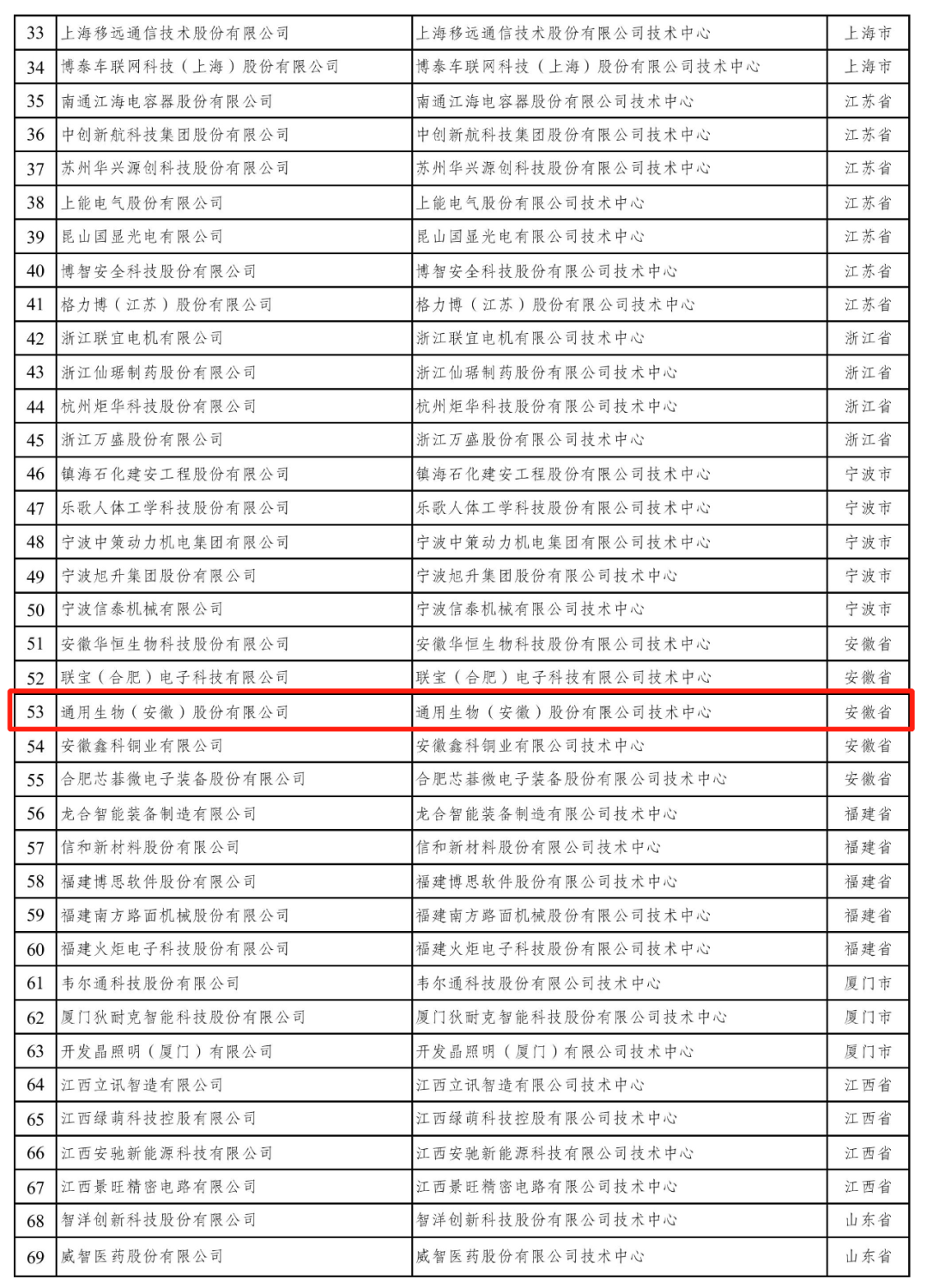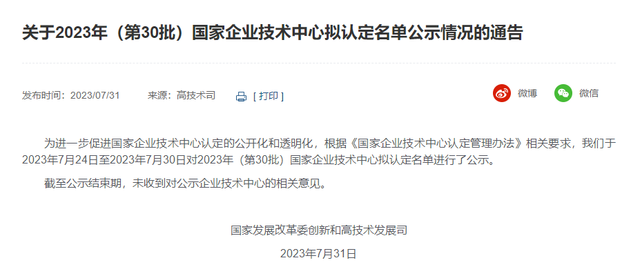 近日,国家发改委根据《国家企业技术中心认定管理办法》(国家发展改革委、科技部、财政部、海关总署、税务总局2016年第34号令)和《国家发展改革委办公厅关于组织开展2023年(第30批)国家企业技术中心认定及国家企业技术中心评价工作的通知》(发改办高技〔2023〕207号),在地方主管部门审核和推荐的基础上,国家发展改革委创新和高技术发展司组织了2023年(第30批)国家企业技术中心的认定复核工作,拟认定企业技术中心名单,予以公示。 且在公示结束期,未收到公示企业技术中心的相关意见,现将名单公布如下: |
