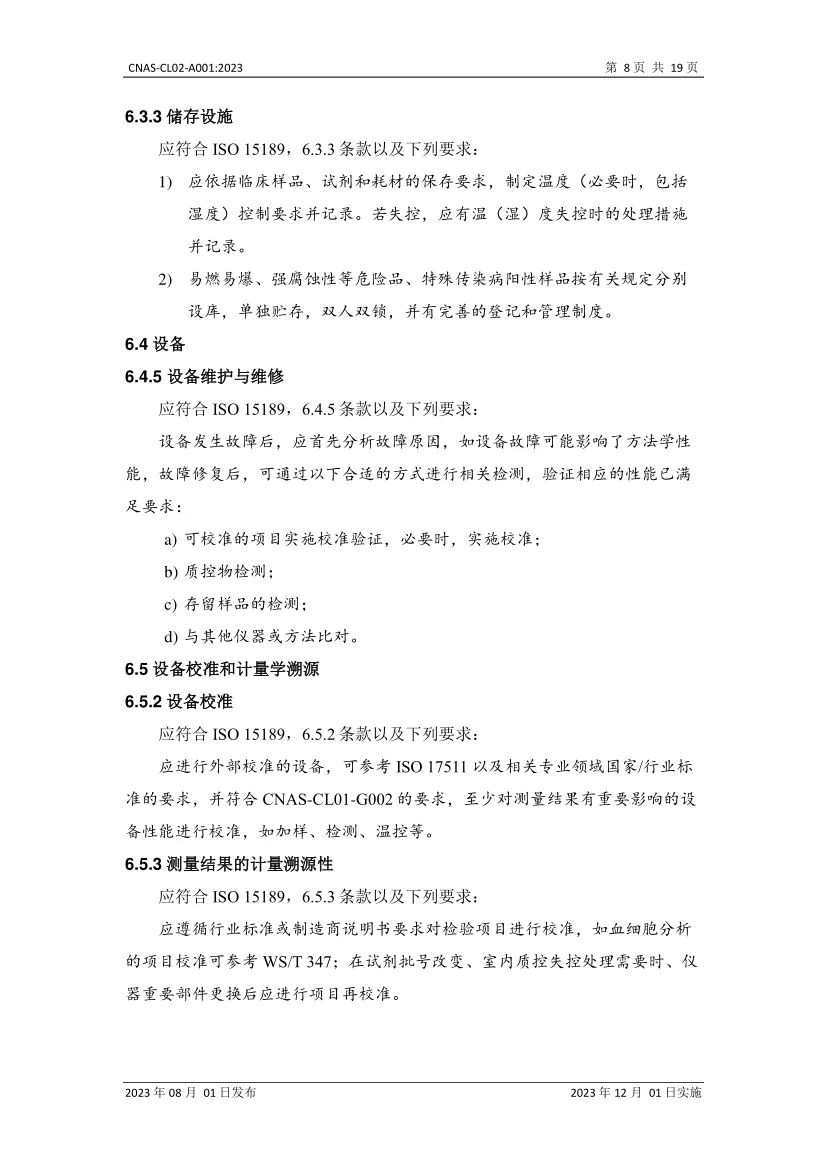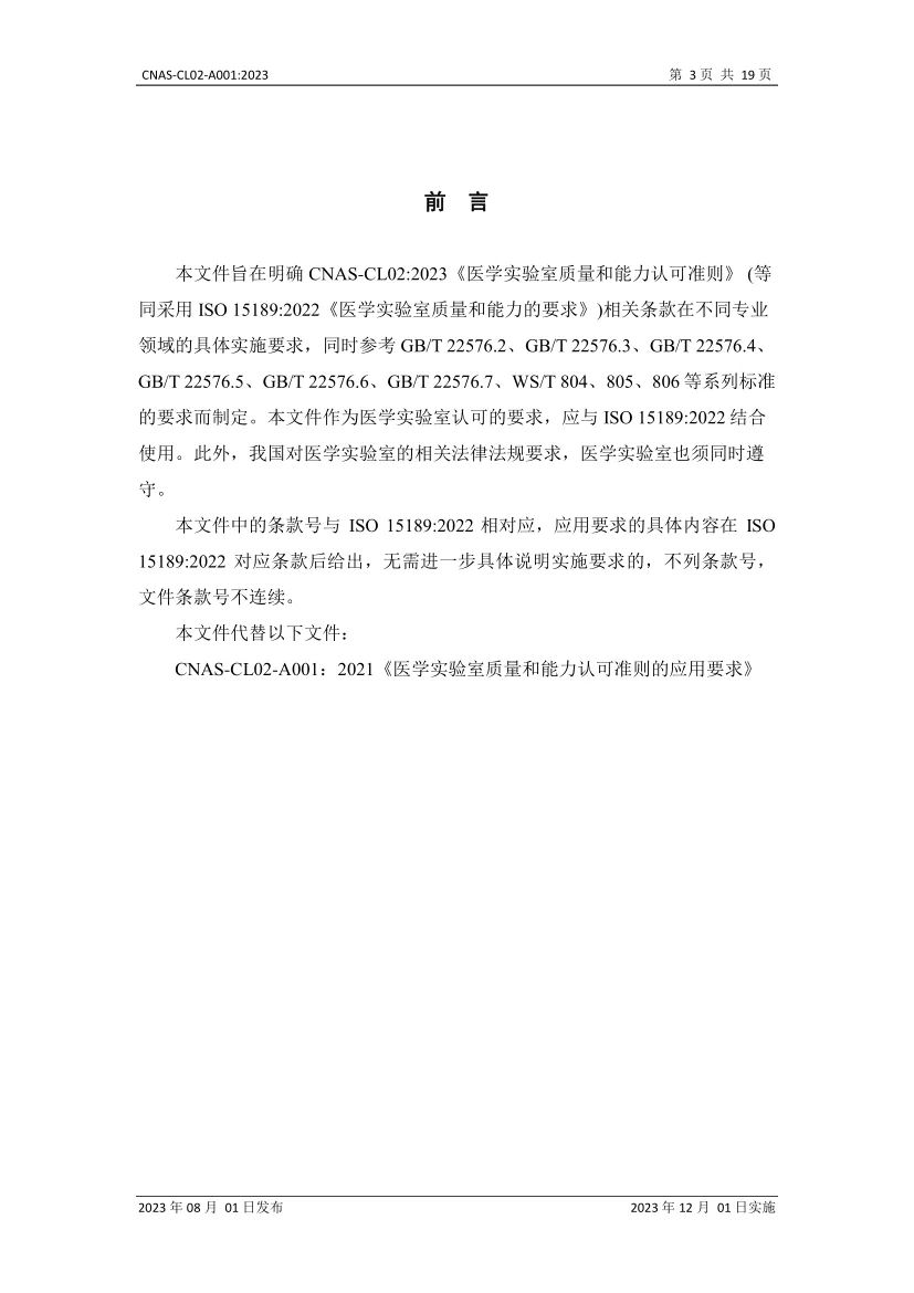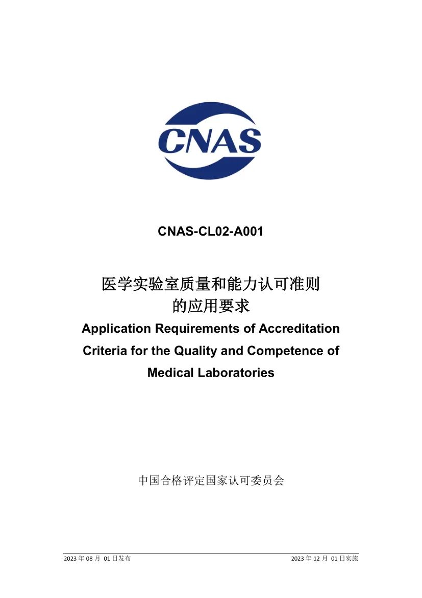 8月1日,中国合格评定国家认可委员会(CNAS)发布通知,CNAS-CL02-A001:2023《医学实验室质量和能力认可准则的应用要求》和CNAS-EL-14:2023《医学实验室认可受理要求的说明》已完成修订工作,于2023年8月1日发布,2023年12月1日实施。