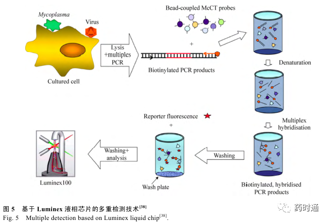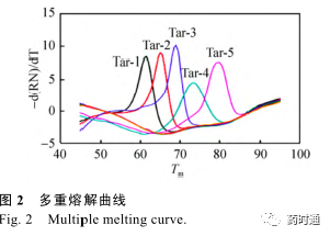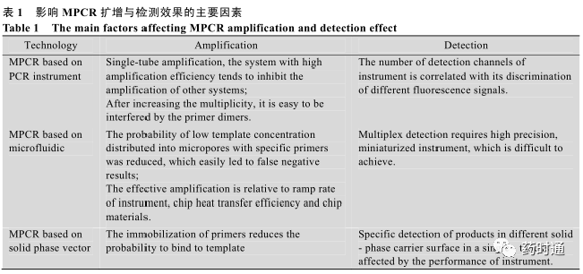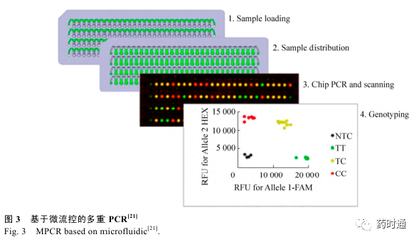01 多重荧光定量 PCR 技术 1.1 基于荧光探针的多重 PCR 技术 多重荧光定量 PCR (Multiple fluorescencequantitative PCR)技术是在荧光定量 PCR 技术的基础上,利用几种不同荧光基团的组合,结合仪器对不同通道荧光的检测能力实现对多个靶标的实时定量检测。 TaqMan 水解探针 (Hydrolysisprobes) 是多重荧光 PCR 体系中常用的一种探针,探针一端标记荧光基团,另一端标记淬灭基团,通过在不同序列末端标记不同荧光基团及相应的淬灭基团,即可形成不同的 TaqMan 水解探针,将上述探针及相应的扩增引物加至同一反应体系,即可实现对多个靶标的共同检测。 Weller等 [7] 以 TaqMan 探针为基础,成功构建了两重 PCR扩增和检测体系,Zhang 等 [8] 通过单管逆转录反应成功地实现了对肠病毒 71 型 (EV71)、柯萨奇病毒 A16 (CA16) 以及总肠道病毒 (EVs) 的三重检测。 分子信标 (Molecular beacon) 是多重 PCR 体系中另一种常用的探针,基于荧光共振能量转移(Fluorescence resonance energy transfer,FRET) 的原理,当体系中不存在特异性的靶标时,分子信标会自发形成茎环结构,淬灭基团与荧光基团相互接近从而发生 FRET,不会产生荧光。 如果体系中存在特异性的靶标,在一定的条件下,茎环结构会打开并且与靶标进行复性,从而产生荧光信号。那么在同一个反应体系中加入几种靶标特异性的分子信标就能够实现对多个靶标的同时检测。Vet 等 [9] 针对 4 种不同的靶标设计了 4 种不同的分子信标并且首次在四色荧光 PCR 仪上实现了四重的检测,El-Hajj 等 [10] 利用五色分子信标探针实现了对结核杆菌利福平耐药突变的检测。 1.2 基于探针编码的多重 PCR 技术 基于水解探针和分子信标探针的多重荧光定量 PCR 技术的优点是简便快捷,然而受仪器荧光检测通道的限制,往往最多只能达到四重或五重检测。 组合探针编码 (Combination probecoding) 技术的开发,使得目前的多重实时核酸扩增可检测的靶标数目多于仪器可检测的数目。通过对 4 种不同的荧光基团进行相互组合可以形成15 种指示探针 (图 1),在多重反应体系中加入多种靶序列特异的置换探针 (Displacing probes),那么在检测通道有限的情况下仍能够实现对多种不同的靶标同时进行扩增和检测。 Huang 等利用多色组合探针编码技术 (MCPC) 实现了对 8 种食源性病原菌的鉴定以及通过 4 色组合探针编码技术实现了对 15 种不同型别的 HPV 病毒进行分型 [11-12] 。 1.3 基于荧光染料的多重 PCR 技术 非特异性的荧光染料嵌入到 DNA 双链小沟中后,在特定的激发光激发后将会产生一定波长的荧光。 以此为基础发展了熔解曲线 (Meltingcurve) 分析法,利用不同 DNA 序列具有不同 Tm(Melting temperature) 值的特征,在 PCR 反应结束后,通过程序升温使双链逐渐解链成单链,当达到双链特异的 Tm 值所对应的温度时,荧光强度大幅度降低,利用这样的原理可以对 PCR 中不同长度的双链产物或相同长度不同 GC 含量的双链进行分析 (图 2)。 Singh 等 [13] 利用多重实时PCR 熔解曲线分析的方法,成功地实现了同时对氨苄西林、链霉素、磺胺、四环素、氯霉素耐药的沙门氏菌的检测与辨别,Mendes 等 [14] 建立了一种多重熔解曲线分析方法并且实现了对不同基因编码的金属-β-内酰胺酶型别的检测和鉴别。 针对不同的型别设计了特异性的引物对,从而对模板进行扩增生成不同的扩增子,扩增子之间T m 值各有差异,最后通过熔解曲线峰的位置进行鉴别。 在熔解曲线分析技术的基础上发展而来的高分辨率熔解曲线技术是一种利用饱和染料,借助高分辨率的仪器,实现对单个核苷酸熔解温度不同从而形成不同形态熔解曲线,进而对基因进行分析的新技术,它具有极高的灵敏度,能够检测出单个碱基之间的差别,目前主要应用于单核苷酸多态性分析、甲基化分析、基因突变、基因分型等领域 [15-18] 。 1.4 基于荧光探针熔解曲线的多重 PCR 技术 由于荧光基团本身发射的不是单一波长的荧光,而且 PCR 仪对不同荧光基团发射的荧光信号的区分度有限,所以现有的 PCR 仪只能检测 4–5 种不同的荧光信号。 而基于荧光染料的多重 PCR 技术由于染料不具备特异性的识别能力,所以同一反应体系中通常只能使用一种荧光染料。为了弥补这两种方法的不足而开发出来的荧光探针熔解曲线技术 (Fluorescence probe melting curve technique)具有成本低、多重检测能力更强的优点。 通过在靶序列中选取相对保守的区域设计通用扩增引物,然后在引物对之间选取差异度较大的区域设计能够识别各种目标核酸序列的特异性探针,探针在扩增的过程中不会被完全水解,并且根据检测通道的不同将探针进行分组,每个通道中包含多个特异性探针,通过调整探针的长度或 GC 含量对每条探针的 T m 值进行人为的调控,使得同一检测通道内针对不同靶标的检测探针 T m 值都间隔合适的差值,每个荧光通道均可定性检测多个 靶 标 , 最 后 通 过 熔 解 曲 线 进 行 分 析 。 Elenitoba-Johnson 等 [19] 利用荧光探针熔解曲线技术成功地区分了 27 种可能发生碱基替换的序列。Liao等 [20] 利用荧光探针熔解曲线技术成功地实现了对 15 种高危型 HPV 的分型以及实现了对 48 种人类单核苷酸多态性的分型和分析。 02 多重荧光定量 PCR 技术需将多个引物对、探针以及模板加入到同一个反应管中进行反应,伴随检测重数的增加,同管内核苷酸链数目也会增加,各核苷酸链之间互搭形成二聚体甚至多聚体的可能