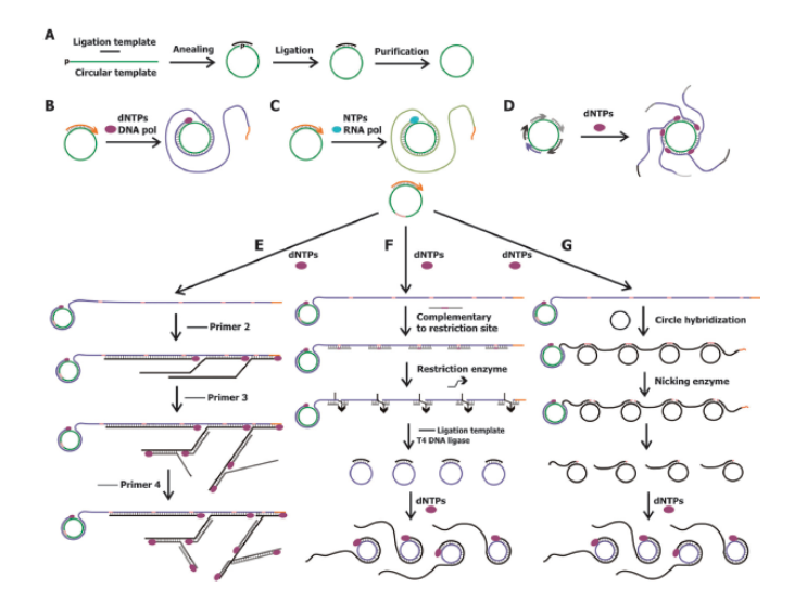 1998年建立的滚环扩增(RCA)是模拟自然界微生物环状DNA的滚环复制过程,发展起来的一种放大信号和靶核酸相结合的检测方法。在具有链置换活性的DNA聚合酶作用下由一条引物与环形DNA模板的链置换合成,实现环状DNA模板的体外等温线性扩增。可分为线性扩增(单引物RCA)、指数扩增、多引物扩增和信号扩增RCA。