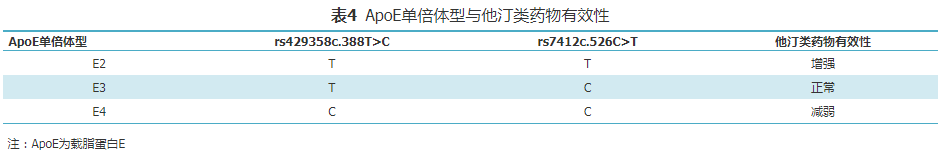 他汀类药物不良反应存在较大的个体差异。SLCO1B1基因突变者服用他汀类药物可增加肌病或横纹肌溶解症的发生率。研究发现SLCO1B1基因多态性是服用他汀类药物发生横纹肌溶解症的独立决定因素,SLCO1B1基因纯合突变者服用他汀类药物,发生肌毒性风险约为未突变者的17倍(表1)。 研究证实,ApoE基因多态性影响血清TC、TG水平,进而影响他汀类药物的降脂效果。ApoE基因多态性是高脂蛋白血症及动脉粥样硬化性血管病的易感基因,影响ApoE蛋白与LDL-R的亲和力,从而影响肝脏调节血脂的能力。ApoE基因2个位点(388T>C、526C>T)SNP影响他汀类药物的调脂疗效,2个位点可形成3种单倍体型(表4)。