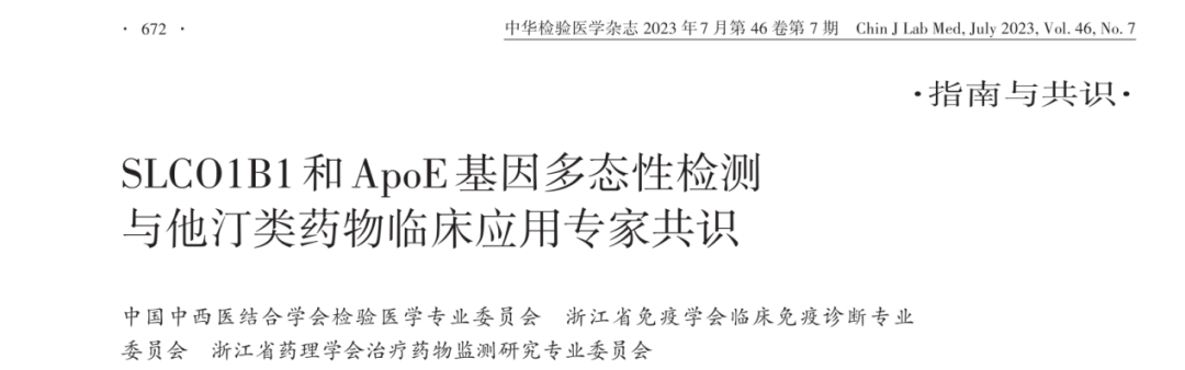2023年7月19日,《中华检验医学杂志》发表了《SLCO1B1和ApoE基因多态性检测与他汀类药物临床应用专家共识》(以下简称《共识》),该共识由中国中西医结合学会检验医学专业委员会, 浙江省免疫学会临床免疫诊断专业委员会和浙江省药理学会治疗药物监测研究专业委员会联合发布。 《SLCO1B1和ApoE基因多态性检测与他汀类药物临床应用专家共识》发布会于2023年6月15日在第十次全国中西医结合检验医学学术会议期间圆满召开。 他汀类药物作为心血管疾病防治的主要药物,用药前检测SLCO1B1及ApoE基因多态性,将有助于实现他汀类药物的精准用药,提高调脂疗效,减少或避免药物不良反应的发生。基于我国他汀类药物相关基因检测的实际临床应用需求,由36位临床医师、检验师及药师等对其中的一些关键问题给出了共识性观点,形成10条建议。以期为临床安全、合理使用他汀类药物提供指导。 ➣ 共识1 首次服用他汀类药物,用药前应检测SLCO1B1基因多态性,以减少药物不良反应发生;首次服用他汀类药物未检测SLCO1B1基因多态性,若用药过程中出现肝转氨酶升高、肌病等不良反应,建议检测SLCO1B1基因多态性分析原因。 ➣ 共识2 首次服用他汀类药物,为评估他汀类药物治疗效果,建议在用药前检测ApoE基因多态性;启用他汀类药物治疗后,若降脂疗效不佳,建议检测ApoE基因多态性分析原因。 ➣ 共识3 他汀类药物的个体化治疗除了检测SLCO1B1及ApoE基因常见的SNP以外,在无法解释临床疗效和不良反应的情况下,应考虑检测SLCO1B1和ApoE基因的稀有变异。 ➣ 共识4 CYP2C9、ABCG2、ABCB1等其他基因多态性与他汀类药物安全性及有效性的相关性证据尚不充分,不建议检测CYP2C9、ABCG2、ABCB1等基因多态性指导他汀类药物的个体化应用。