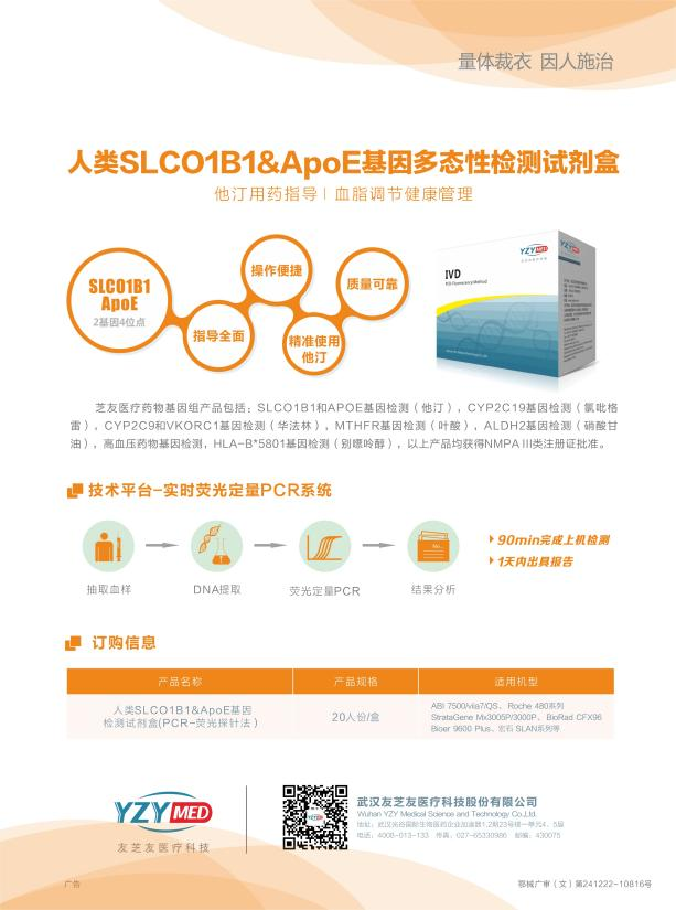 武汉友芝友医疗科技股份有限公司(简称“芝友医疗”)可检测《共识》推荐SLCO1B1基因的388和521位点、ApoE基因的388和526位点。其中,该方案的荧光PCR试剂为全国第一个通过NMPA三类注册审批产品(国械注准20153400245)。辅助临床指导更精准,更安全的使用他汀类药物进行降脂治疗。芝友医疗本着“量体裁衣,因人施治”原则,帮助大家安全、有效、快速降脂! 目前《共识》单行本已同步发行。详情请后台留言咨询!
