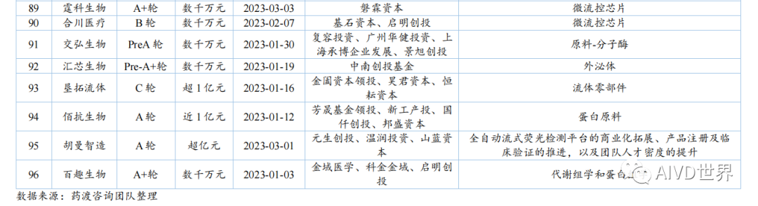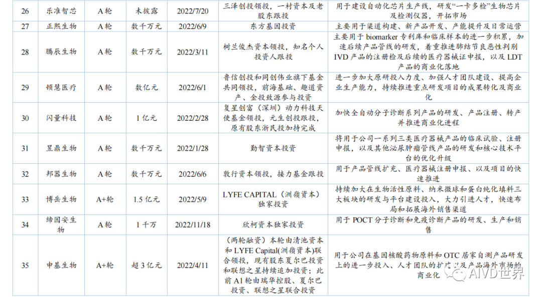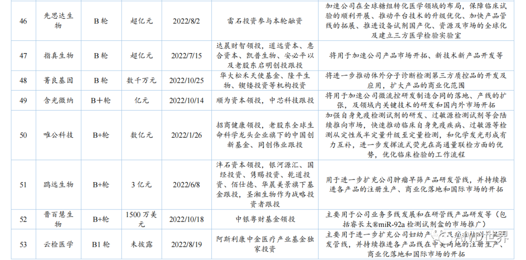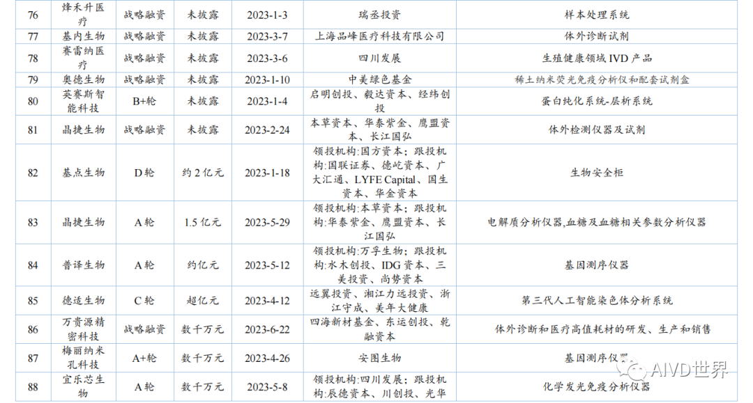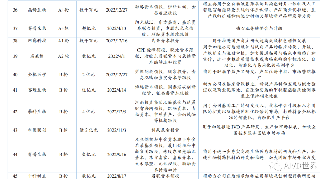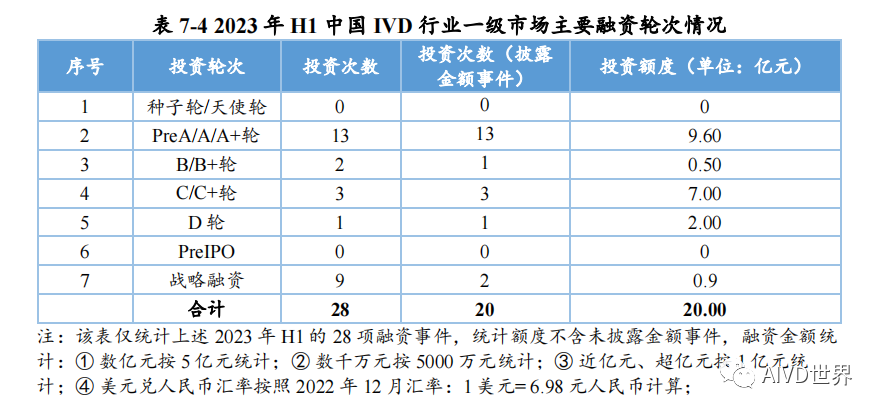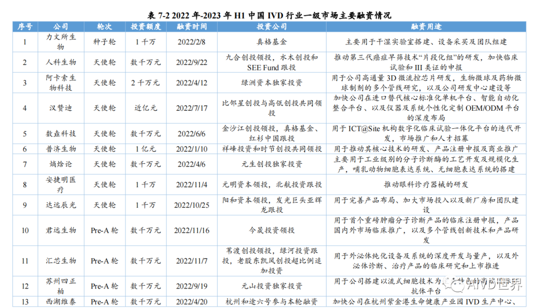 | 体外诊断试剂(In vitro diagnosis,IVD)是指按医疗器械管理的体外诊断试剂,包括在疾病的预测、预防、诊断、治疗监测、预后观察和健康状态评价的过程中,用于人体样本体外检测的试剂、试剂盒、校准品、质控品等产品。按照检测原理和应用领域,可分为生化诊断、免疫诊断、分子诊断、血液诊断、微生物诊断和即时检测(Point-of-Care Testing,POCT)。Kalorama information 数据显示,2022 年新冠检测相关市场份额降低至 25.58%,但全球 IVD 整体市场容量从2021年的 1233.68 亿美元增长至1273.80 亿美元,增速为 3.25%。随着疫情影响消退,新冠检测相关的市场将持续缩减,但整体 IVD 市场受癌症检测、血糖检测等项目的带动仍将保持增长,预计至 2027 年将超过 1400 亿美元。此外,越南、土耳其、韩国、阿联酋、沙特阿拉伯、中国等新兴市场将持续助力全球 IVD 市场的发展。截至2023年H1,2022年-2023 年 H1 共有 8 家 IVD 企业上市,其中2022年上市企业数为 7 家,2023年H1上市企业数为1家。2022年与2021年相比减少10家企业。上述 8 家企业的融资情况如下表所示。由上表可知,2022 年中国新上市的 IVD 企业共计 7 家,分别为仁度生物,云康集团、美因基因、英诺特、华大智造、新芝生物及康为世纪。其中,云康集团,美因基因于港交所成功上市。上述7家企业的IPO融资金额共计76.41亿人民币,其中,华大智造融资额最高,约36亿人民币。2023年H1中国新上市的IVD企业仅艾迪康1家,融资额为3.74 亿人民币。除艾迪康外,致善生物、联川生物、中翰盛泰生物、雅睿生物、硕华生命科学均在2023年H1阶段上市失败(8月7日,荣盛生物IPO终止)。此外,还有一大批 IVD 企业还在审核中,如全式金、世和基因、凯实生物、达科为、沃文特、英科新创等。注:由于某些融资事件未披露原因,本章节 IVD 企业融资事件为代表性企业主要融资事件,非完全统计。2022年中国经历了疫情反复影响,并于年底施行放开政策。与2021年相比,2022年中国 IVD行业整体融资金额出现大幅下降,约为103 亿元[3]。2023年 H1 中国IVD行业融资金额约为20亿元。2022年-2023年H1中国IVD行业一级市场代表性企业的融资情况如下表所示。由上表可知,2022年-2023年H1中国IVD行业一级市场融资主要涉及分子诊断、免疫诊断、质谱检测、生化检测等领域。在上述 96 项投资事件中,共涉及 87 家企业。其中,获亿元以上融资的事件共计 44 项,涉及 41 家企业,按年份统计,2022年获亿元以上融资的事件共计 34 项,2023 年 H1 获亿元以上融资的事件 10 项,明显少于 2022 年度融资金额。齐碳科技完成 7 亿元 C 轮融资,硅基仿生同年获得 2 次 5亿元及以上融资,9 家企业获得数亿元(以 5 亿元统计)融资。2022年-2023年H1中国IVD行业各轮次融资情况如下表所示。由上表可知,2022 年中国IVD行业一级市场融资总额为 103.04 亿元。从融资企业所处轮次看,处于B轮之前的事件约占 58%。在融资额度方面,B/B+轮融资金额最高,为31.55 亿元;其次为 Pre A/A/A+轮,为30.30亿元。由上表可知,2023年H1中国IVD行业一级市场融资总额为20亿元。从融资企业所处轮次看,处于B轮之前的事件约占46%。在融资额度方面,Pre A/A/A+轮融资金额最高,为 9.60 亿元;战略融资事件多未披露金额。2022年全球IVD整体市场容量增速放缓,市场规模较2021年增幅 3.25%。随着疫情影响消退,癌症检测、血糖检测等项目将带动整体市场保持增长,预计至 2027年全球IVD市场将超过1400亿美元,以中国为代表的新兴市场也将持续提供助力。在二级市场融资方面,由于核酸检测业务曾经一度火热,2021 年中国新上市的IVD企业数量为 17家;到2022年中国新上市的IVD企业数量显著降低,仅有7家,分别为仁度生物、云康集团、美因基因、英诺特、华大智造、新芝生物及康为世纪;而2023年H1 仅有1家 IVD企业上市成功。2022 年-2023年H1 8家IVD企业的IPO融资金额共计80.15亿元人民币,其中,华大智造融资额最高,约36亿人民币。在一级市场融资方面,2022年中国 IVD 行业整体投融资力度减弱,投资总额约103 亿元(较2021年的140亿下降26%)。而这一变化在2023年H1呈现的更为明显,上半年中国 IVD行业投融资约为20亿元,仅为2022年度的20%,投资市场降温明显,并且IVD赛道融资有多样化趋势,如微流控芯片、生物原料、生物组学、超低温冷藏设备等。在超亿元的投资事件中, 2022年获亿元以上融资的事件共计34项,2023年H1获亿元以上融资的事件10项,对于大额投资,投资机构更趋于谨慎。齐碳科技完成 7 亿元 C 轮融资,硅基仿生同年获得 2 次 5 亿元及以上融资,9 家企业获得数亿元(以5亿元统计)融资。 [1]《体外诊断试剂注册管理办法(试行)》 [2] 简 析 《 全 球 体 外 诊 断 检 测 市 场 》 第 15 版 (https://new.qq.com/rain/a/20221109A0103C00) [3] 国创联行:2022 中国医疗器械领域融资达 638 次融资总额为 268.9 亿元 (https://business.sohu.com/a/654126512_121124566) |