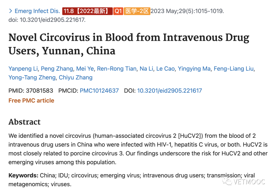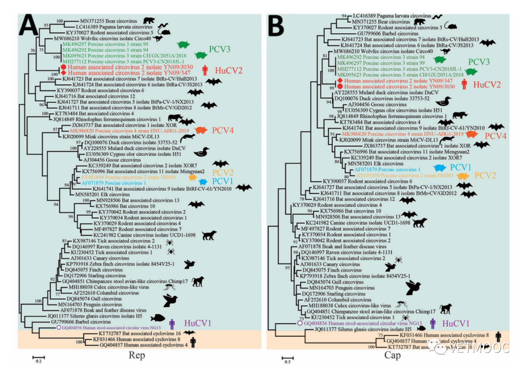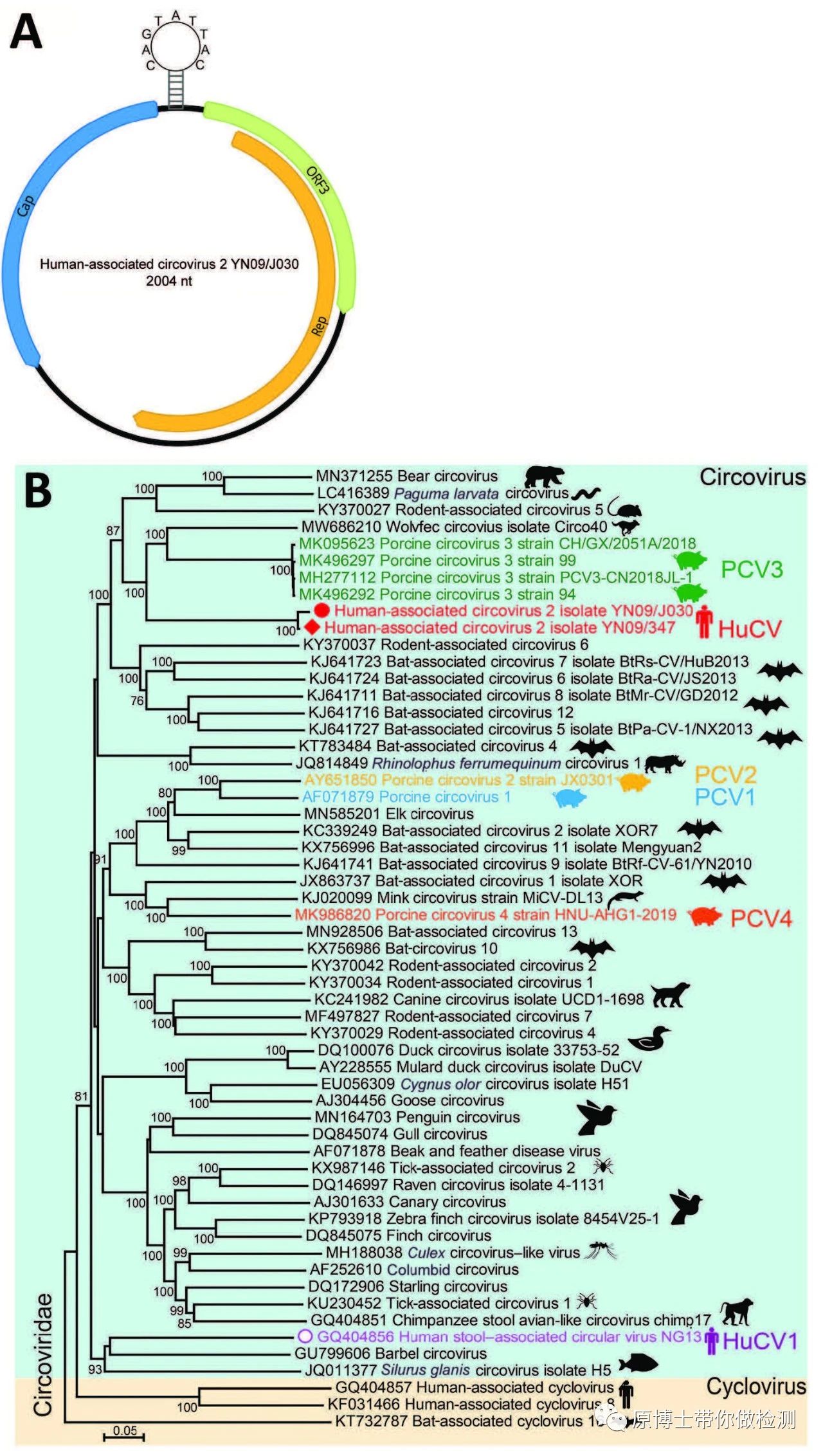 | 云南的研究人员通过高通量测序技术在回溯的吸毒人员的血液样本中鉴定出与PCV3亲缘最近的人类的圆环病毒HuCV2。我们知道圆环病毒是单股环状的DNA病毒,其宿主谱是比较广的已经有报道的除了哺乳动物还有鸟类、鱼和昆虫等,在猪上面已经发现了PCV1-4,其中PCV1是最早发现的认为是一种污染细胞的病毒,对猪只其实不致病,而PCV2是当前主要关注的能够引起断奶仔猪多系统综合征、皮炎肾病综合征等圆环病毒相关疾病,而PCV3和PCV4则是近几年发现的。来自复旦大学和中科院昆明所依据昆医的研究团队,对中缅边境的注射吸毒人员进行血浆中的病毒感染情况回溯调查,他们对09年以来的近100名注射吸毒的瘾君子的血样进行病毒鉴定分析,在血样中除了鉴定出HIV-1和HBV(乙型肝炎病毒)和HCV(丙型肝炎病毒)以外,还发现细环病毒(Anelloviridae,原来在猪上发现的TTV就属于这个科)、黄病毒、圆环病毒、正粘病毒、乳头瘤病毒、肺病毒、细小病毒和三角病毒(Kolmioviridae)的成员。其中从两名感染 HIV-1和/或HCV两者的静脉吸毒者的血液中(2009年采的样品,患者应该于2010年和2014年分别去世了)鉴定出一种新型圆环病毒——人类相关圆环病毒 2 (human-associated circovirus,HuCV2)。 HuCV2 与猪圆环病毒 3 亲缘关系最近(其实也只有60.5%)。该研究其实主要是对该新病毒进行了序列鉴定、遗传演化分析。  HuCV2的基因组结构跟PCV2、PCV3这些都相似,可以鉴定出负责编码复制酶Rep蛋白的编码区ORF1和编码衣壳蛋白Cap的ORF2,也有ORF3。