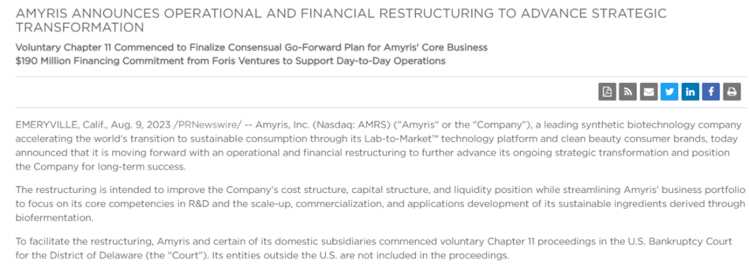 近期,全球合成生物学三巨头之一Amyris宣布已申请破产,并计划出售其消费品牌以改善公司的流动资金状况。作为收购过程的一部分,Amyris已从现有贷款机构Foris Ventures获得1.9亿美元的债务人持有融资以支持其持续的日常运营。Amyris向法院提交的文件中显示,公司目前资产大概在5亿美元至10亿美元之间,负债在10亿至100亿美元之间。此外,Amyris在美国以外的公司不包括在此次破产程序中。 Amyris由合成生物学大牛、加州大学伯克利分校化学教授杰·基斯林及其团队于2003年共同创立,官网信息显示,该公司通过发酵和专有的Lab-to-Market运营平台,将研发分子应用于医药、美容、食品等多个下游领域。据悉,迄今为止Amyris 成功创造了13种可持续成分并将其商业化。Amyris在成立之初就获得比尔和梅琳达·盖茨基金会4200万美元的资助,2010年Amyris率先实现纳斯达克IPO,成为全球首家合成生物学上市企业。 Amyris以研发产生青蒿酸(Artemisinic acid,合成青蒿素的重要前体)的酵母菌株起家,随后该公司将这一技术转让给赛诺菲,之后Amyris将开发重点聚焦于生物燃料Biofene法尼烯,但该产品推出并不成功。随后,Amyris在法尼烯基础上推出角鲨烷,角鲨烷具有高度的亲肤性和稳定性。2012年,Amyris开始向化妆品企业供应角鲨烷原料,截至2015年公司在角鲨烷原料的市场份额已经超过20%。此外,依托角鲨烷原料的生产优势,Amyris于2017年推出首个面向消费者的科学纯净护肤品牌Biossance,拓展至终端品牌领域。后续公司不断加大化妆品品牌业务方面的投入,陆续推出彩妆品牌 Rose Inc、护发品牌JVN、婴幼儿护肤品牌Pipette等品牌,覆盖消费者健康、美容和保健领域。 但总体,在后期的发展中,业务多元化模式带来的盈利并不及预期。财报数据显示,2022年Amyris全年营收2.7亿美元,同比下滑21%;2023年一季度营收5608.3万美元,同比下降2.8%,且该季度的亏损达到创纪录的2.02亿美元,同比去年1.1亿的亏损几乎翻倍。2021年末Amyris的总资产为9.54亿美元,2022年末下降到8.24亿美元;2021年末的债务为6.75亿美元,2022年末飙升至12.92亿美元。 今年6月,Amyris宣布公司总裁、首席执行官John Melo已辞去相关职务,任命Han Kieftenbeld为临时首席执行官兼首席财务官。与此同时,该公司还宣布将在全球范围内裁员,进一步实现削减成本的目标。8月初,Amyris发布消息关闭旗下三个品牌——巴西清洁美容品牌 Costa Brazil 、清洁美容零售商 Onda Beauty 和甜味剂品牌 Purecane。 在巅峰时,Amyris股价一度飙升至34美元/股,截止目前,Amyris股价跌至0.05美元/股,总市值跌至1847万美元。 合成生物学是近年来的热门领域之一。据CB Insights统计,2021年全球合成生物初创企业融资达180亿美元。据Markets and Markets预计2026年全球合成生物学市场规模达到307亿美元,对应2021-2026年CAGR为26.5%。过去几年,国内的合成生物学赛道也处于风口,凯赛生物、华恒生物、合生科技、瑞德林生物、和晨生物、擎科生物、迪赢生物、恩和生物、蓝晶微生物等均在布局。 文 | 医谷 |