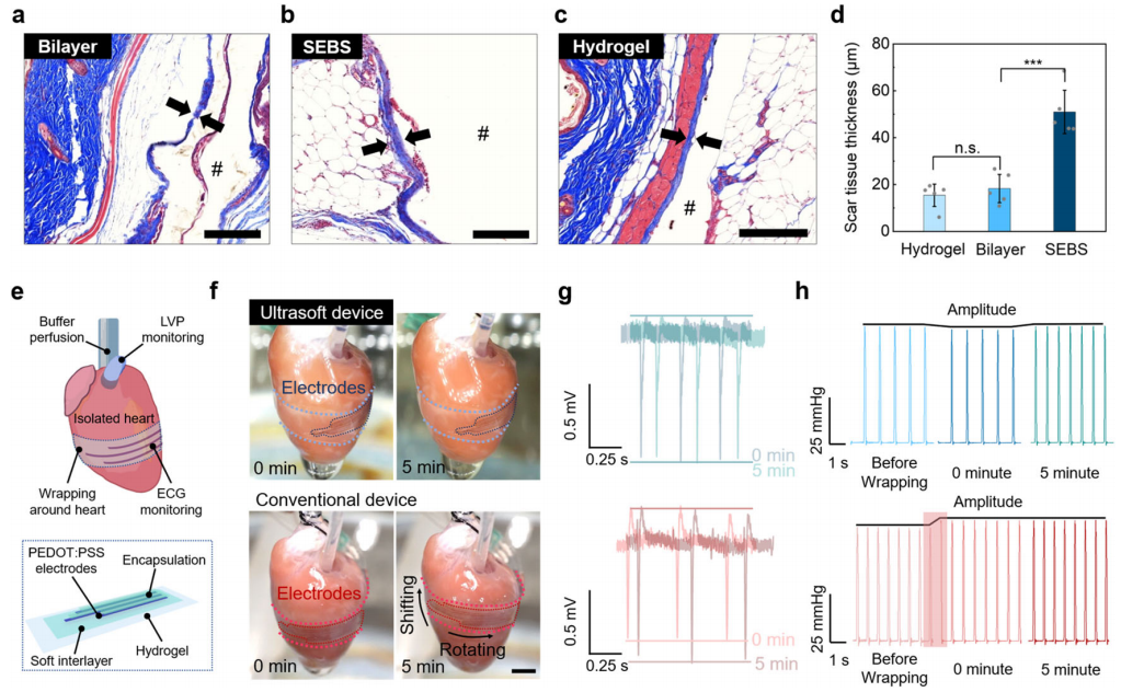 将电子设备作为可穿戴或植入式设备与人体相连接,为健康监测、疾病治疗甚至基础生物学研究提供了大量功能。为了实现无缝和贴合的接口,必须尽量减少电子设备与人体皮肤/组织之间的机械不匹配,其中两个主要方面是柔性(即杨氏模量)和可拉伸性。虽然可拉伸性的实现通常伴随着杨氏模量的降低,但这些可拉伸电子材料和器件的模量仍然比大多数柔性生物组织高3-4个数量级。进一步减少这种模量不匹配对于实现长期稳定的生物界面是非常重要的。首先,机械方面,理论和实验都表明,组织级模量可以显著提高可拉伸装置在非零高斯表面(如人体皮肤或组织)上的贴合性。其次,免疫方面,生物植入物的组织柔软度可以显著抑制对可植入装置的异物反应(FBR) 。总的来说,一个贴合且无疤痕的组织界面对于和调节信号转导的保真度非常重要。 近日,一组来自芝加哥大学和UCLA的研究团队在杂志Nature Communications上发表了一篇题为“Achieving tissue-level softness on stretchable electronics through a generalizable soft interlayer design”的文章。在这项工作中,作者报告了一种可推广的柔性中间层设计,当将其添加到功能层和基底之间时,可以允许使用现有的可拉伸电子材料来构建组织级模量器件,同时实现高拉伸性。利用这种设计,作者展示了一种基于PAAm水凝胶衬底的可拉伸晶体管阵列,其有效杨氏模量为5.2 kPa,比传统的器件软两到三个数量级,可以与动态软表面(如具有非零高斯纹理的皮肤)形成更舒适、稳定和不易察觉的接触。 图片来源:Nature Communications 柔性中间层设计的工作机理 作者通过对由功能薄膜、柔性中间层和超软基底组成的三层结构进行有限元分析(FEA),从理论上研究了中间层的力学功能。在功能膜中引入一个切口,并绘制缺口周围的应力水平图(图a)。结果显示,切口周围的模量越高、夹层厚度越大、分层程度越轻(即粘连性越好),都可以抑制功能层的应力集中(图b-d)。 研究团队通过实验验证了SEBS H1052 (2.83 MPa)可以作为理想的中间层,与超低模量基材(例如水凝胶)具有强粘附性。采用这种中间层设计,即使只有200 nm厚的SEBS中间层,100%应变下半导体薄膜中的拉伸裂纹尺寸和密度明显减小,进一步将SEBS层增加到2 μm有助于实现更少的裂纹扩展(图f)。半导体薄膜的载流子迁移率的变化趋势(图h)也反映了这种SEBS中间层显著提高的拉伸性。 柔性中间层显著提高功能层可拉伸性。 图片来源:Nature Communications 采用柔性中间层设计的超软晶体管 作者尝试使用柔性中间层设计在可拉伸晶体管上实现类似组织的柔软性。采用PAAm水凝胶(200μm,模量2.58 kPa)作为基底,以及SEBS作为柔性中间层,得到的晶体管厚度为200μm,杨氏模量低至14.4 kPa。两个方向的100%应变下,即使重复拉伸1000次,柔性中间层的高拉伸性也能确保稳定的载流子迁移率(图c,d)。 通过在SEBS软中间层上预先设计空间图案有助于有源矩阵实现更低模量,可低至5.2 kPa模量(图g),比之前报道的传统弹性体基底(厚度为100 μm)上的可拉伸晶体管阵列软两到三个数量级,同时保持了相似的可拉伸性。 超软可拉伸晶体管和有源矩阵电路采用柔性中间层设计。图片来源:Nature Communications 超软器件增强了贴合性并减少了机械约束 组织级柔软度的实现可以极大地提高附着在动态皮肤/组织表面上的电子设备信号转导质量的同时,降低不适感。贴合性的改善在非零高斯曲面上得到了证明,如图c, d所示的人类手腕表面。超软设备在皮肤变形下可以更好地遵循原始皮肤表面纹理,这意味着更低的不适感和更好的贴合性。 此外,低杨氏模量的装置最大限度地减少了对柔软皮肤和组织运动的机械约束。低机械约束的好处在包裹变形软组织的情况下更为明显,例如周期性膨胀的血管(图f)。与传统器件(图g右)所看到的明显约束相比,当被超软晶体管阵列包裹时,血管可以更好地保持其原始膨胀程度(图g中)。 超软器件增强了贴合性并减少了机械约束。 图片来源:Nature Communications 超软器件的生物相容性表征 对于植入式应用的生物相容性,作者比较了三种类型样品上的FBR:水凝胶膜、SEBS膜和SEBS-水凝胶双层样品。这些样品被植入小鼠皮下1个月,以分析组织反应。如图d所示,双层植入体的瘢痕组织(18.3μm)比SEBS植入体(51μm)薄,与水凝胶植入体(15.4μm)相似。结果表明,长期的免疫相容性确实可以从植入物模量的降低中获益。 研究团队进一步将中间层设计应用于超软可拉伸电生理(EP)记录设备(图e)。该设备的超低模量表现出两个主要优点。首先,该设备与心脏表面保持相对稳定的附着,由于心脏跳动而产生的位置移动最小(图f-top),这对于在心脏表面进行长期空间分辨率的ECG记录/映射非常重要(记录的ECG信号如图g-top)。其次,超软装置对心脏跳动的机械约束较低,LVP稳定且增幅最小(图h)。这种益处对于使用慢性集成设备进行微创和稳定的心脏测绘是很重要的。 Ultrasoft设备具有抑制免疫反应和与活体组织的机械兼容性。图片来源:Nature Communications 总结 作者展示了一种通用的柔性中间层设计,该设计允许具有相对高模量的可拉伸功能材料用于制造超软和可拉伸电子产品。通过实现均匀的应变分布,该设计可以显著提高基底上功能层的可拉伸性,其模量降低了几个数量级。通过将可拉伸半导体集成到超软基底上而不影响可拉伸性,这种中间层设计使模量低于10 kPa可拉
