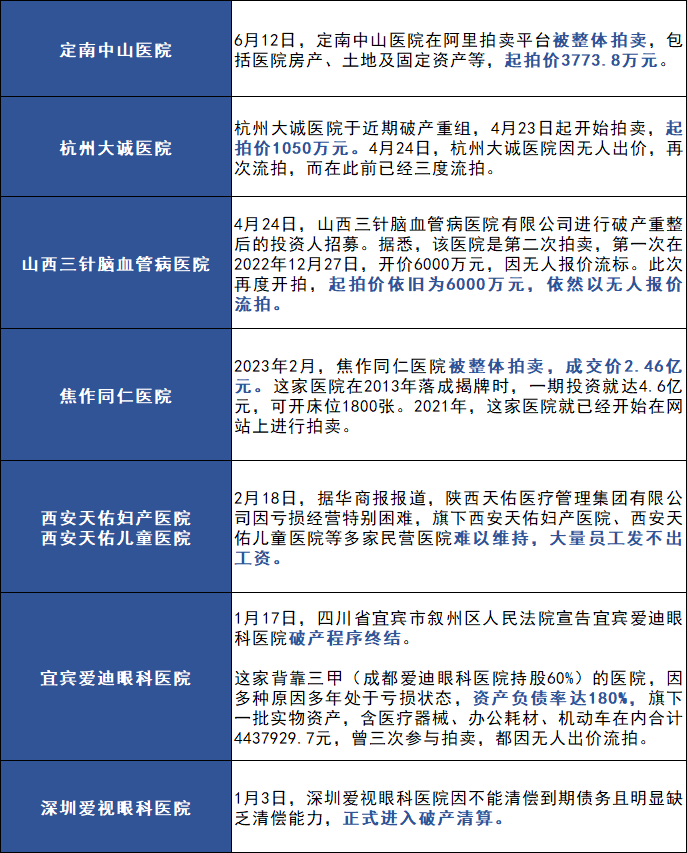 近日,公拍网司法拍卖网站上更新了一则医院拍卖信息。 公告显示,接受拍卖的标的物为“博乐市博冶医院等九家单位的破产财产”,起拍价约2217万元,将于2023年9月18日开拍。 此次的拍品涉及多家医疗机构,包括博尔塔拉蒙古自治州博冶中医医院房屋建筑物及附属设施、医疗设备、办公设备等,以及博乐市南城街道南城社区卫生服务站、博乐市青得里街道秀苑社区卫生服务站内部分设备等。 也就是说,当地至少上述3家医院都破产倒闭了…… 投资上亿!多家大型医院破产、拍卖 8月18日,贵阳市白云区人民法院发布公告,称已正式受理贵阳荟康医院破产清算一案,目前正在推进相关程序。 据其医院挂网介绍,贵阳荟康医院于2019年12月正式对外运营,总建设面积2.4万平方米,编制床位420张,总投资2.15亿元,是一所二级综合医院。 8月10日,在京东拍卖平台上,舟山市瑞和医院管理有限公司名下土地使用权、建筑物等资产以1.37亿元的价格被拍卖出去。拍卖内容包括72048平方米的土地使用权,医院综合楼、宿舍楼、 后勤物业楼等建筑物,以及分院所用的机器设备、车辆等固定资产等。 据阿里拍卖了解,“蒙城众和中医院所有的位于蒙城县许疃镇赵集众和大道西侧的土地使用权、房屋及附属物”将于9月4日开始竞拍,起拍价约2217万元。 这家医院属于民办非营利性综合医院,2016年6月正式登记成立。相关资料显示,这家医院总投资1.2亿,设置床位120张,业务类型包括中医治疗、内科、外科、妇产科等。 7月17日,全国企业破产重整案件信息网披露,恩施华龙总医院有限公司预重整托管人正面向社会公开招募意向投资人,进入了破产预重整程序。 医院官微显示,作为一家三级综合医院,该院开放床位500张。目前日门诊量近500人次,住院病人350人次、健康体检100多人次,2019年、2020年分别实现业务收入9000万元、1.2亿元。 像恩施华龙总医院这样年营收过亿的都没能逃过破产命运,可见民营医院面临的困境与震荡。 《中国卫生健康统计年鉴2021》显示,全国2.35万家非公立医疗机构,一年总计亏损1300亿元,平均每家亏损高达553万元。中国医院协会民营医院管理分会副会长余小宝曾表示:疫情以来,已有2000多家民营医院破产倒闭。 前两年导至医院倒闭的一大元凶是疫情。但如今形势稳定下来,回顾上半年,陷入欠薪、资金链断裂、破产的民营医院依旧不在少数。 据医学界,某民营二甲综合医院院长甚至透露:据其所知,今年以来,他们省大概就有十几家民营医院倒闭的倒闭、转手的转手,还有并给公立医院的。这十几家医院都是床位在500张以上的,此前的患者来源一直很稳定,在当地也有较好口碑。 这一现象背后反映出,对于更多民营医院来说,真正让医院陷入危机的绝不止“天灾”。 大环境上,我国医疗事业以公立为主,非公立医疗机构则承担着“补充”角色。医联体、医共体、分级诊疗的加速推行,以及各大公立医院分院建设潮,都在压缩民营医院生存空间。 此外在经营方面,民营医院定位不清晰、服务同质化严重,监管趋严下灰色捞金手段失效、过度营销等都是重要原因。 未来的一段时期,一些缺乏核心竞争力、管理能力弱、改革魄力不足,或者以不规范经营和不正当竞争维系经营的民营医院,会继续在多重压力作用下被大幅清出。 而关于民营医院破局之路的探索,业内人士表示,可以将目光放在一些难以进入公立医院带量集采或基本医保支付范畴的高端药品、耗材、设备、手术和医疗服务,重点发力眼科、口腔、医美、康养之类的赛道,即向消费医疗、品质医疗转型。 对于医疗器械企业和经销商而言,面对巨变中的民营医疗市场,提前转变策略,及时退身,布局更大的增量市场同样至关重要。 |