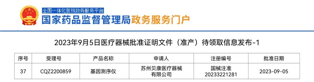 摘要: 2023年9月5日,贝康医疗DA500高通量基因测序仪正式获得国家药品监督管理局(NMPA)批准的第三类医疗器械注册证(国械注准20233221281)。