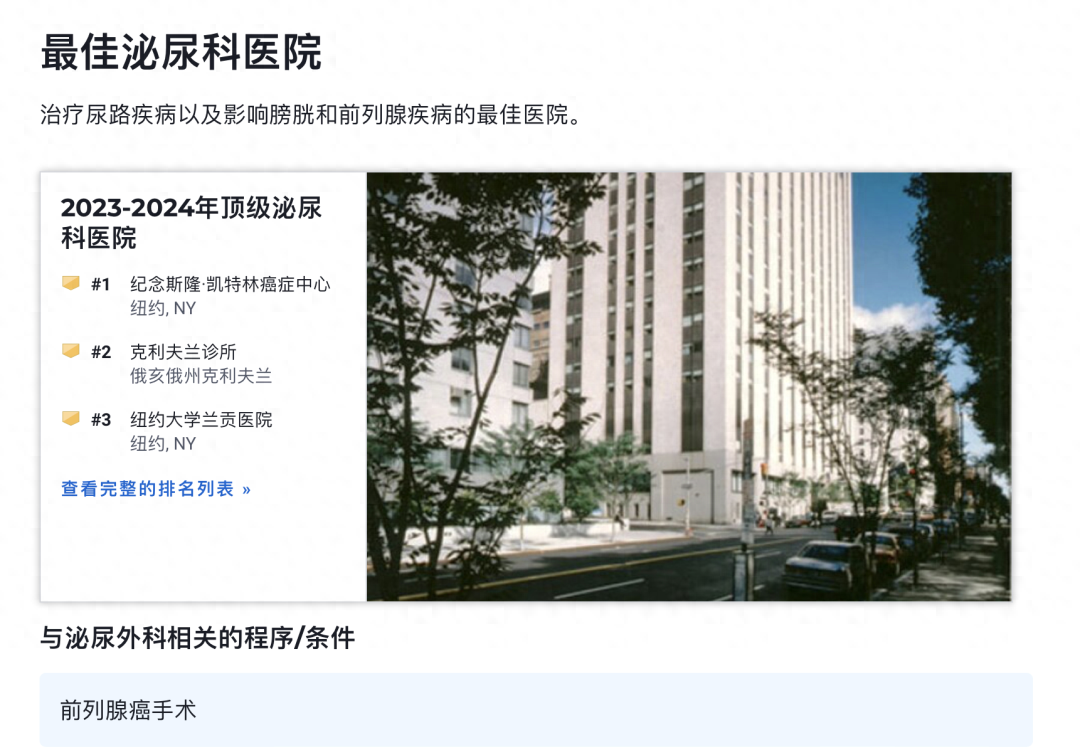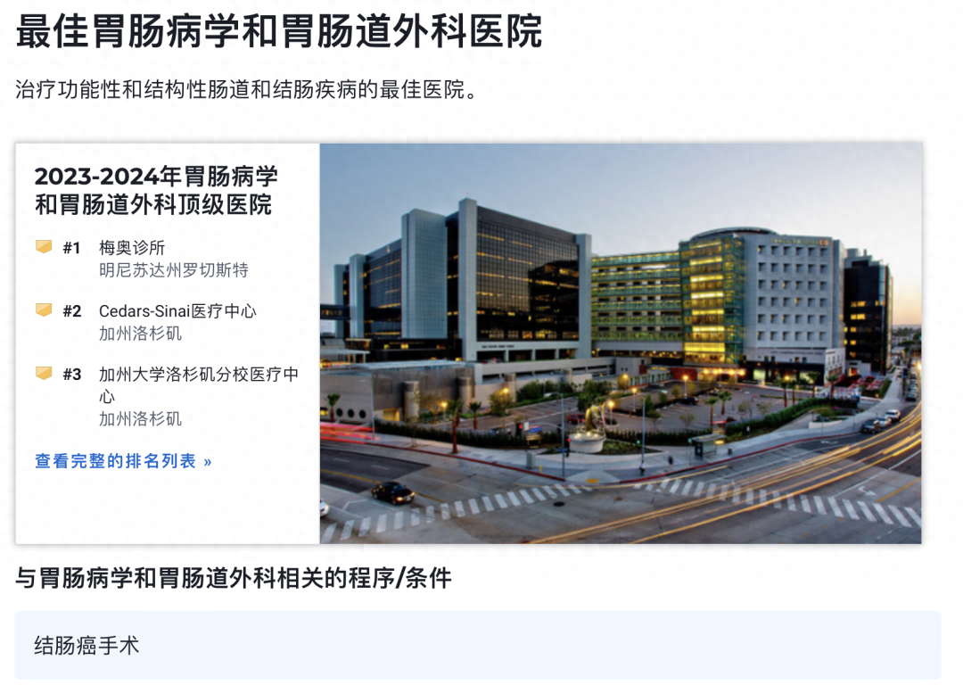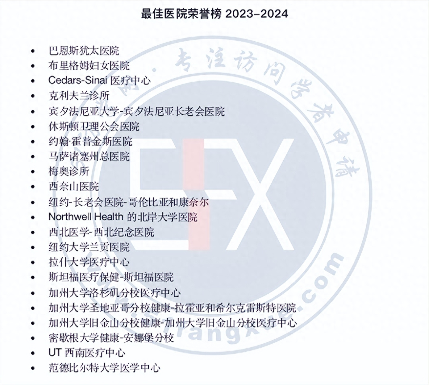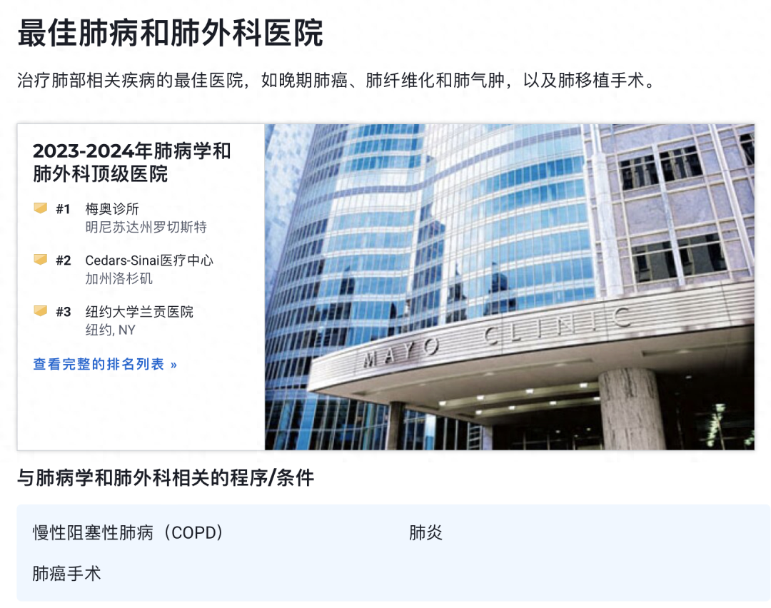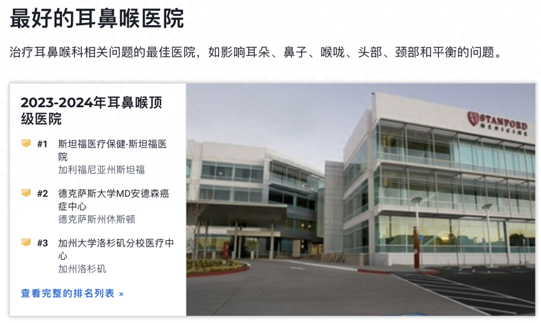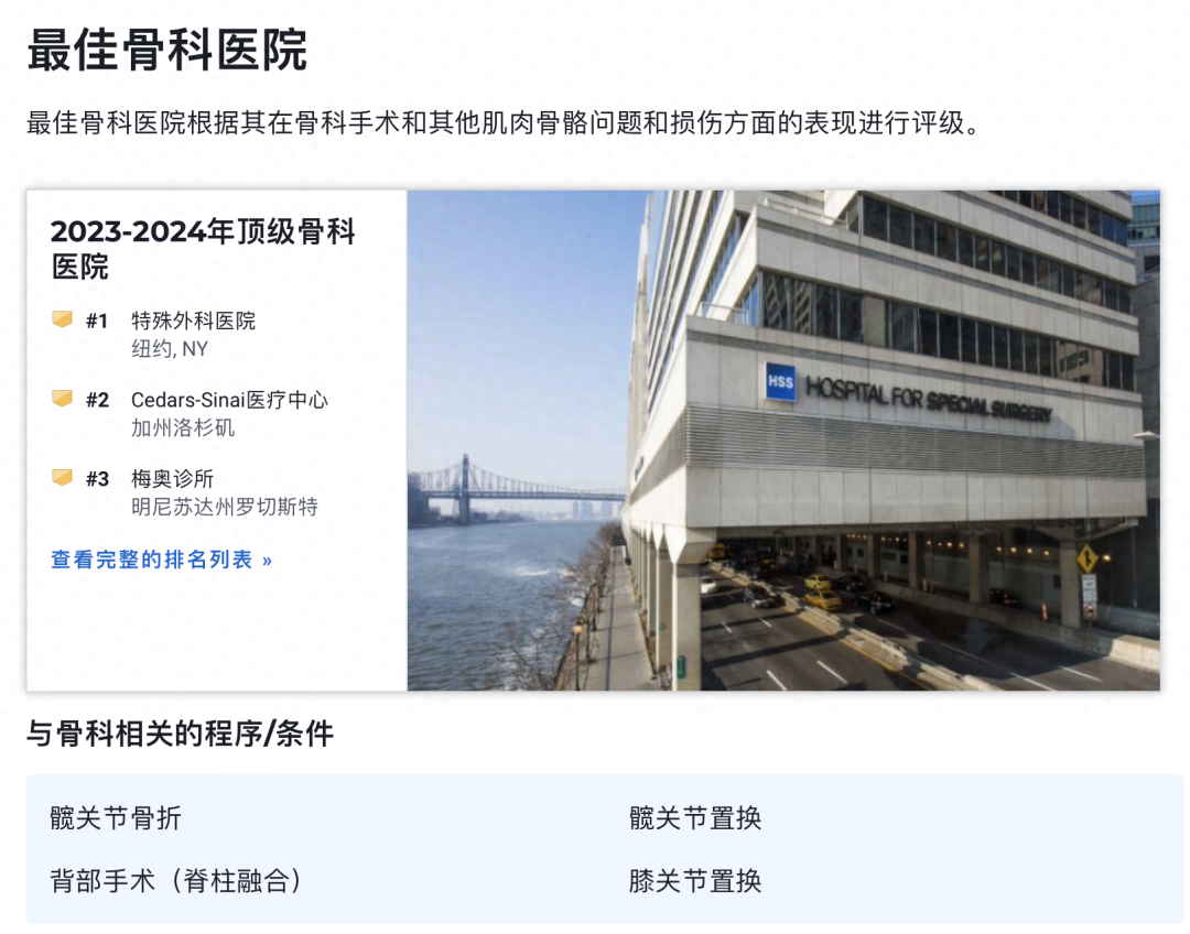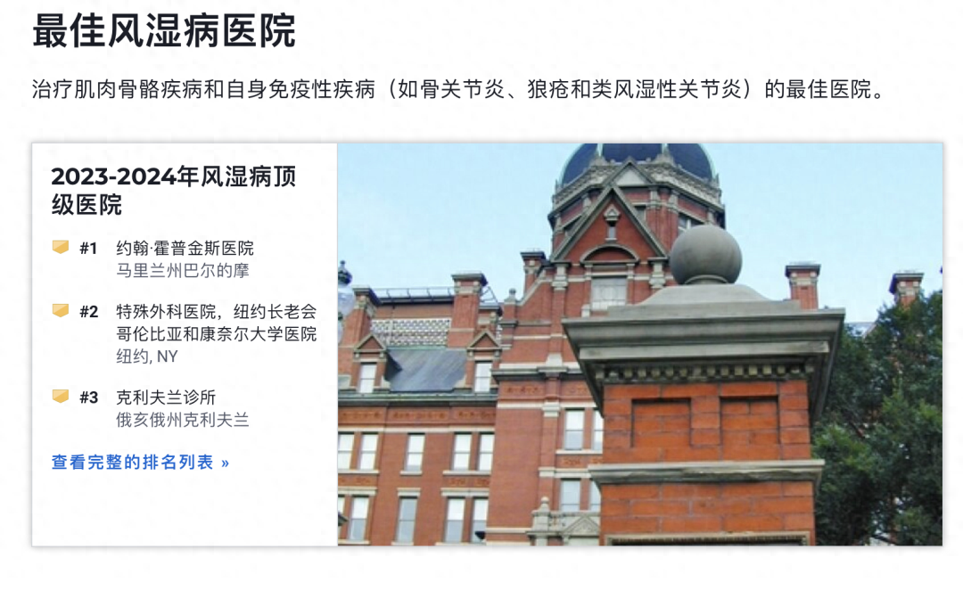 ![]() U.S News公布2023-2024年美国最佳医院及15个专科排行榜 前不久,《美国新闻与世界报道》(U.S News & World Report)公布了2023-2024年度美国最佳医院排行榜以及癌症等15个专科的排名。该排名公布的全美医院排行榜一直是美国医院比较有公信力和权威性的排名,也是很多医学访问学者/博士后出国学习进修方向及目的地的重要参考之一。 与往年不同,本次美国医院排名出现了大的变更:《美国新闻与世界报道》没有发布综合排名,而是推出了“2023-2024美国最佳医院荣誉榜”,共有22家医院上榜。(排名不分先后) ![]() U.S News公布2023-2024年美国最佳医院及15个专科排行榜 22023-2024年 美国最佳医院排行榜 ![]() U.S News公布2023-2024年美国最佳医院及15个专科排行榜 癌症 ![]() U.S News公布2023-2024年美国最佳医院及15个专科排行榜 心脏病学、心脏和血管外科 ![]() U.S News公布2023-2024年美国最佳医院及15个专科排行榜 糖尿病和内分泌学 ![]() U.S News公布2023-2024年美国最佳医院及15个专科排行榜 耳朵、鼻子和喉咙 ![]() U.S News公布2023-2024年美国最佳医院及15个专科排行榜 胃肠病学和胃肠道手术 ![]() U.S News公布2023-2024年美国最佳医院及15个专科排行榜 老年医学及肾脏病 ![]() U.S News公布2023-2024年美国最佳医院及15个专科排行榜 神经病学和神经外科 ![]() U.S News公布2023-2024年美国最佳医院及15个专科排行榜 妇产科 ![]() U.S News公布2023-2024年美国最佳医院及15个专科排行榜 眼科 ![]() U.S News公布2023-2024年美国最佳医院及15个专科排行榜 骨科 ![]() U.S News公布2023-2024年美国最佳医院及15个专科排行榜 精神科 ![]() U.S News公布2023-2024年美国最佳医院及15个专科排行榜 肺病与肺外科 ![]() U.S News公布2023-2024年美国最佳医院及15个专科排行榜 康复 ![]() U.S News公布2023-2024年美国最佳医院及15个专科排行榜 风湿 ![]() U.S News公布2023-2024年美国最佳医院及15个专科排行榜 泌尿 ![]() U.S News公布2023-2024年美国最佳医院及15个专科排行榜 |
