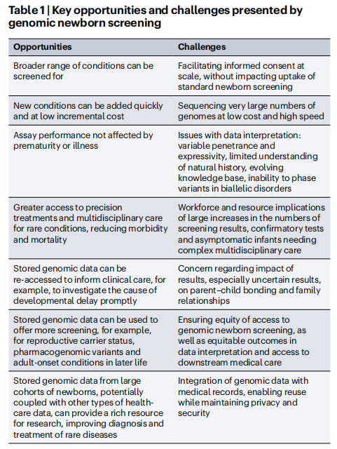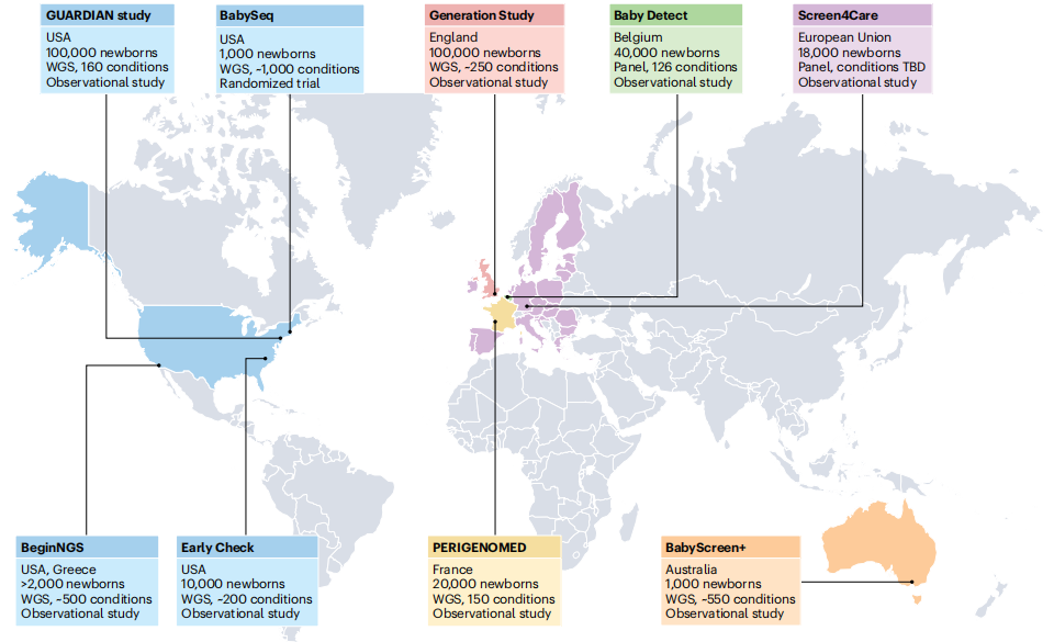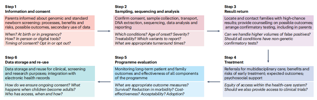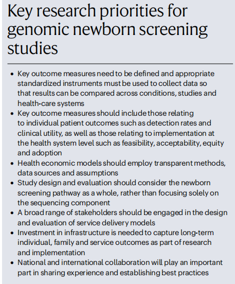 图片来源:Nature reviews genetics 基因组学和罕见疾病 01 在过去的十年中,无偏见的基因组测序已经革新了罕见疾病的诊断。研究项目,如Care4Rare、破译发育障碍研究、10万基因组计划、未确诊疾病网络和孟德尔基因组学中心,已经为数千个家庭提供了基因诊断。随着测序成本的下降,解读能力的提高和报告速度的加快,采用罕见病筛查方法变得越来越可行。 目前,基因组检测仅为30-50%的疑似罕见遗传病患者提供诊断。技术进步,如长读测序和光学基因组图谱,再加上多组学方法,将继续推动诊断实践的发现和改进。然而,实施问题,如不公平的检测机会,仍然是改善结果的主要障碍。许多罕见疾病的精准治疗目前只能通过大型学术中心获得,限制了获取。即使诊断出了可治疗的疾病,面对不可逆转的器官损伤,仍然可能无法避免灾难性的结果。因此,越来越多的人呼吁采用筛查方法,结束诊断和治疗过程,改善罕见疾病的结果。 全球范围内已开展了几项旨在对数千名新生儿进行基因组测序的研究(如下图)。 国际启动大规模新生儿基因组筛查研究。 图片来源:Nature reviews genetics 新生儿筛查和基因组学 02 筛查方案目的是在疾病的早期阶段确定风险增加的无症状个体,以便采取预防措施或治疗,预示着“精准公共卫生”时代的到来。成功的NBS规划目前在许多国家实施,比如足跟血测试,一些NBS的项目还包括使用听觉脑干反应进行听力测试,以及身体检查和脉搏血氧仪来检测先天性心脏病。基因检测传统上被保留为二级检测,用于确认诊断,但现在开始作为一级检测纳入NBS,如脊髓性肌萎缩症的检测。将新疾病纳入NBS规划的标准通常基于1968年首次引入的Wilson和Jungner筛查原则(如下图)。经典原则主要侧重于疾病和测试标准,但规划和系统问题(有效的基础设施、协调和整合、可接受性、成本效益以及质量和性能管理)的重要性日益重要。 Wilson和Jungner经典筛选标准。 图片来源:Nature reviews genetics 新生儿基因组筛查(gNBS)提供的机会 03 目前被认为可治疗的罕见病中,只有不到5%被纳入NBS规划,而且随着新疗法数量的不断增加,这一差距正在扩大。基因组筛查可以同时筛选更广泛的疾病,可能包括数百种心脏、内分泌、血液、免疫、神经和骨骼疾病以及儿童癌症易感综合征。此外提供了灵活性,可以以最低的成本快速引入对新疾病的筛查。还克服了目前的一些限制,检测性能不受早产或疾病的影响。基因组数据还可以被重新访问,在整个一生中使用,为临床护理提供信息。存储的基因组数据可用于提供更多的筛查,与其他类型的医疗保健数据相结合,为研究、改进罕见疾病的诊断和治疗提供丰富的资源。 新生儿基因组筛查(gNBS)的挑战 04 挑战可能来自筛选测试本身、随后的调查和治疗,可能包括心理困扰、经济压力和身体不适。筛查规划还会增加服务负担和总体成本,以及重新分配资源,从而损害卫生保健系统。纳入基因组测序将对现有NBS途径的每一步提出额外的要求。需要大量的基础设施来提供知情的父母同意和参与;以低成本和高速度对大量基因组进行测序数据解释的问题:不同的外显率和表现度等;需确认筛查结果和需要复杂多学科护理的无症状婴儿数量大量增加;不确定结果对亲子关系和家庭关系的影响;确保公平获得新生儿基因组筛查,以及数据解释方面的公平结果和获得下游医疗服务;基因组数据与医疗记录的集成,可重复访问,同时保持隐私和安全性,并确保适当的性能监测和评估。 现有NBS程序需要改变的程度、不可避免的危害和成本都将与方案设计直接相关。例如,将分析局限于严重但可治疗的儿童疾病的致病变异将产生相对较少的筛查结果,反之亦然。此外,方案设计应反映更广泛的保健系统情况,保险问题以及获得确证性检测和治疗的机会构成了额外的道德和实际挑战。确定gNBS所有潜在利益和危害的大小将是为政策决策提供信息的关键。 新生儿基因组筛查带来的关键机遇和挑战。 图片来源:Nature reviews genetics gNBS的实施现状 05 公众意见 2010年,美国基因组医学和公共卫生新生儿测序(NSIGHT)联盟的成立。已经开始解决有关测试设计和性能、诊断产量、临床效用和成本效益以及家长和保健提供者的意见和关切等重要问题。公众的观点,对gNBS的态度是相对积极的。大多数参与者(>70%)对可治疗的儿童期发病疾病信息感兴趣,而相当大比例的参与者对接受不可治疗的儿童期发病和成人发病疾病的结果感兴趣。卫生专业人员的观点则更为谨慎,他们认为gNBS目前不合适,但在未来10年内最终会实现。同样,全球基因组学与健康联盟、欧盟新生儿筛查专家网络、欧洲人类遗传学学会以及荷兰、意大利和美国的专业机构的立场声明都敦促谨慎行事。 测试设计与性能 NBS在人口规模上进行,无需或很少需要专业人员对数据进行审查,结果在几天内可用。一些研究小组已经利用专家意见制定了基因和疾病清单,用于设计虚拟gNBS面板。所使用的决策框架将不同的重点放在分析和临床有效性、发病年龄、外显率、治疗效果和可接受性上,反映了现有NBS计划使用的标准。根据不同的标准(例如,主要关注临床有效性或可治疗性),专家评估最终得出了388至954个基因的清单。 gNBS的表现与标准NBS和诊断性WGS进行了比较。结果显示,外显子组测序不适合单独作为主要筛查方法,但可以作为第二