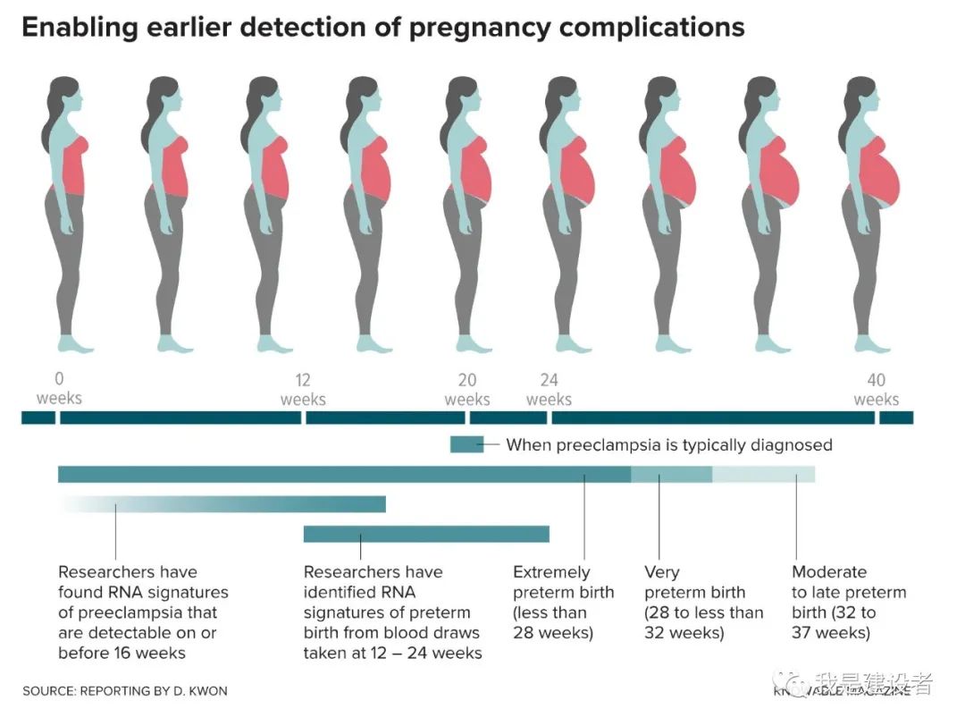 相信开始阅读这篇文章的你应该已经为人父母,或者不久就要当爸爸妈妈,如果说怀孕、诞生小宝宝是一个充满期待的幸福时光,相信你不会反对。 孕育小生命,不管怎么说,都是一段神奇又伟大的人生经历,辛苦甜蜜,各为人知。但妊娠分娩的每个阶段都不轻松,这其中充满了焦虑,因为各种不确定或者不放心。 很多时候,那句稀松平常的“母子平安”是多么来之不易。因为对许多人来说,怀孕会带来严重的健康问题,可能危及父母和孩子。 妊娠并发症及其所带来的风险 从妈妈一个人到怀胎到分娩,身体的结构及生理都发生着巨大的调整和重新适应。妊娠会导至内分泌、激素水平的全身性改变,这也会引起很多并发症,比如先兆子痫、妊娠糖尿病、妊娠高血压等等,也有胎儿早产等让人揪心的问题。 先兆子痫和早产都是相对常见的,一些妈妈们也不陌生,这些疾病可能使母亲和婴儿在出生前和出生后都面临健康的风险。先兆子痫是一种与高血压相关的妊娠特异性疾病。据估计,全球 4.6% 的妊娠会发生先兆子痫。如果不及时治疗,可能会导至癫痫、昏迷和器官损伤等严重问题。而早产指的是妊娠达到28周但是不足37周分娩。根据临床统计,早产大概占分娩总数的5%-15%。虽然宝宝足月生产是一个美好的期待,但随着高龄产妇的增加,早产儿的出生概率也在逐年上升。早产就意味着胎儿的各器官发育还未成熟,存活率及远期智力、神经系统及其他方面的发育都会稍显落后。 一些证据提示,每5个妊娠中就有一个会受到不可预期的并发症的影响,这比女性每年所遭受的所有类型的肿瘤还要多。 为什么是不可预期?因为现实环境里,医生没有一个好的办法来确定一个人是否会出现这些并发症,即便已经有了一些措施,但效果有限,可能也做不到及早的发现,更不用说能精准地判断了。 面对这些不可预期的并发症,除了焦虑还会有恐惧。如果能及早的发现或排除,更有针对性地进行临床管理或者有效的治疗,似乎医生和准父母们都会拍手称赞。 探索潜在的生物标记物,开发精准的妊娠并发症风险预测,既是一个显而易见的未满足的需求,又是一个理想的临床应用场景。 开发血液游离RNA被寄予厚望 自发现母亲血液中游离的胎儿DNA(cfDNA)以来,NIPT无创产前检测的开发和商业化已经彻底改变了胎儿染色体异常诊断和风险筛查的临床管理实践,成为基因测序临床应用的最成功案例。 通过简单采集母亲的一管血来进行产前的健康管理已经越来越多地被临床所采用,不管是针对胎儿染色体异常还是单基因突变,亦或者简单对准父母进行风险基因的携带者筛查,non-invasive无创的方式成为实践的关注点。 回到妊娠的并发症,一个自然生长的想法就是:cfDNA是不是也提供了一些关乎风险的信息呢? 的确有不少课题组在朝这个方向探索。但cfDNA提供的是我们细胞内基因内容的静态视图,即便在血液中的含量有差异,但似乎很难反映动态的变化过程。前面提到,妊娠时一个全身性的动态调整和再适应,这种幅度之大之快,一定包含了细胞及分子层面的调控及响应。事实上,科学界正在朝着cfRNA这条路线加速前进。 但为什么是cfRNA呢? 我们所有人的血液中都携带着自己的遗传物质片段,包括 DNA 和更易消失的RNA。在怀孕期间,这些cfDNA 和cfRNA 的自由漂浮片段都会从发育中的胎儿毛细血管释放,通过胎盘内的绒毛进入到母亲的组织和血液中。与DNA不同,RNA 提供了哪些基因在特定时间点被打开或关闭的快照。由于基因活性随细胞和时间的推移而变化,研究人员意识到可以通过RNA 来更动态地了解怀孕期间母亲体内发生的变化,比如可能的并发症。(题外话,血液里游离的RNA对于肿瘤早筛等液体活检的开发同样有建设意义。) cfRNA从哪里来 cfRNA之于妊娠并发症的研究最早出现在2000年代初期。有趣的是,研究cfDNA、开发NIPT的几个重要参与者也都没有缺席cfRNA的工作。 NIPT之父、香港中文大学的卢煜明教授实验室在2003年就报告说,在对 22 名孕妇进行的一项研究中,在妊娠晚期的孕妇胎盘中发现了一种特定的 RNA 含量要高得多,而且患有先兆子痫的人比没有先兆子痫的要更多。之后,卢教授的实验室对怀孕期间对RNA变化进行了更多的研究,对所发现的cfRNA也申请了相应的专利保护。 在2018年的一项研究中,斯坦福大学生物物理学家 Stephen Quake实验室报告称,cfRNA 可以帮助确定分娩何时发生。他们在美国招募了 38 名已知有早产风险的孕妇,然后在妊娠中期或晚期对每位孕妇抽取了血液样本。通过比较最终早产者和足月分娩者的cfRNA,他们能够识别出临产前两个月出现的一组 RNA,可以帮助查明大约 80% 的早产情况。 这项研究也让其他课题组思考是否可以通过cfRNA来预测先兆子痫。2020年,Illumina与合作者报告了数十种先兆子痫孕妇特有的 RNA 转录本。越来越多的证据提示RNA的表达情况与不同的妊娠结局相关联,这能够帮助在孕早期、在症状出现之前帮助识别有风险的人群吗? 同样是Stephen Quake小组,他们在 2022 年发表了一项研究结果,招募了 73 名先兆子痫风险较高的母亲,并对她们进行了四次抽血:12 周或之前、13 至 20 周、23 周或之后以及胎儿出生后。随后,将 24 名确实患有先兆子痫的女性与其余 49 名未患有先兆子痫的女性的cfRNA 进行了比较,确定了与 544 个基因相对应的 RNA,这些基因的活性在患有先兆子痫的人和未患有先兆子