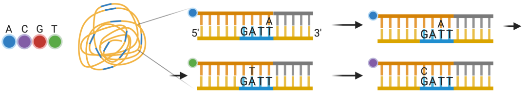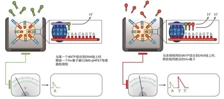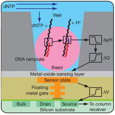 本篇内容,我们将进入到第二代测序也就是高通量测序的内容分享。包括: 随着历时13年耗资近3亿美元的人类基因组计划的完成,生命科学划时代地进入功能基因组时代。人们开始期待在基因图谱中找到疾病发生的确切机制,并实施精准的医疗计划。第一代测序技术虽然具有长读长和准确率高等优势,但其测序成本高、耗时久、通量低等缺陷使其不能满足大规模测序的需求。1996年Ronaghi 和Uhlen建立了焦磷酸测序。2005年454 Life Sciences公司推出了基于焦磷酸测序原理的Genome Sequencer 20系统。这在测序史上是具有里程碑意义的大事件,其改变了测序的规模化进程,成为第二代高通量测序的先行者。第二代测序技术的核心思想是边合成边测序,其最显著的特点就是高通量和自动化。不同于Sanger测序技术对模板进行克隆后进行单独反应,第二代测序技术将模板DNA打断成小片段并通过桥式PCR(或乳液PCR)对文库进行扩增,同时对几十万到几百万DNA模板进行测序。第二代测序技术的出现使得对一个物种的基因组和转录组进行深度测序变得不再遥远,其能够在保持高度准确性的同时,降低测序的成本,提高测序的速度。以人类基因组为3Gb计算,使用第一代测序技术,大概需要测序62500次才能完成人类基因组测序,每个反应按2小时计算,假设每天测序10次,每周工作7天,整个过程大约需要17年,而使用高通量测序技术仅需1周即可完成人类基因组测序。焦磷酸测序是一种由DNA聚合酶(Polymersae)、ATP硫酸化酶(ATP Sulfurylase)、荧光素酶(Luciferase)和三磷酸腺苷双磷酸酶(Apyrase)催化的新型酶级联化学发光测序技术。通过对DNA合成反应中释放的生物光信号完成实时检测,开创了边合成边测序的先河。反应底物为5’-磷酰硫酸(APS)、荧光素。在每一轮测序反应中,反应体系中只加入一种脱氧核苷酸三磷酸(dNTP)。如果它刚好能和DNA模板的下一个碱基配对,则会在DNA聚合酶的作用下,添加到测序引物的3’末端,同时释放出一个分子的焦磷酸(PPi)。在ATP硫酸化酶的催化作用下,生成的PPi可以和APS结合形成ATP,在荧光素酶的催化下,生成的ATP又可以和荧光素结合形成氧化荧光素,同时产生可见光。通过微弱光检测装置及处理软件可获得一个特异的检测峰,峰值的高低则和相匹配的碱基数成正比。如果加入的dNTP不能和DNA模板的下一个碱基配对,则上述反应不会发生,也就没有检测峰。 ATP和未掺入的dNTP由三磷酸腺苷双磷酸酶降解,开始新一个循环。2005年 454 Life Sciences公司基于将焦磷酸测序技术与乳液pcr及光纤芯片技术相结合,推出了Genome Sequencer 20高通量测序系统,发展大规模平行焦磷酸测序技术,实现了测序过程的高通量。 乳液PCR即油相包裹水相,利用油包水结构作为PCR反应的微反应器,进行PCR扩增,乳液PCR最大的特点是可以形成数目庞大的独立反应空间以进行PCR扩增。1、在PCR反应前,将含模板、dNTP、引物和DNA聚合酶的水溶液注入到高速旋转的矿物油表面,水溶液瞬间形成无数个被矿物油包裹的小水滴。2、这些“油包水”包被的磁珠表面含有与接头互补的DNA序列,单链DNA序列能够特异地结合在磁珠上。3、 在磁珠内含有PCR反应所需试剂,保证每个与磁珠结合的小片段都能独立进行PCR扩增,并且扩增产物仍可以结合到磁珠上。携带扩增DNA片段的磁珠被放入PTP板中进行测序。PTP板是一个60mm✖️60mm的光纤板,包含约160万个微反应器小室,每个小室(直径29μm)只能容纳一个磁珠(直径28μm),每个小室中都载有焦磷酸测序所需的各种酶和底物。随后4种dNTP依据T、A、C、G的顺序依次进入PTP板,开始测序反应,流程同焦磷酸测序一样。2007年 454 Life Sciences公司被Roche公司收购后又推出性能更优的第二代测序系统——Genome Sequencer FLX System。该系统读长超过400bp,10小时运行可获得100万条序列,4~6亿个碱基信息,且准确率达99%以上。 454 高通量测序系统在读长上具有明显的优势,使得后续的拼接工作更加高效和准确。是基因组从头测序、转录组分析、基因组结构分析等应用最理想的选择。但是由于使用的是焦磷酸测序原理,对瞬时发光进行检测,因此限制了其更大的通量,并且对于同聚物(连续数个碱基相同的序列)的检测不够准确,同聚物越长,可能产生的误差越大。除此之外,和其他高通量测序平台相比,共测序成本要高很多,在激烈的市场竞争中,并没有发挥出其先行优势。2013年Roche 公司宣布正式关闭 454测序业务。2007年Rothberg离开LifeSciences公司后立即创立了Ion Torrent公司,并开发出基于半导体芯片的新一代革命性高通量测序平台。Ion Torrent测序系统是第一个没有光学感应的高通量测序平台.IonTorrent测序是以半导体芯片为载体,通过检测DNA链在合成时释放H+从而引发的pH变化,把化学信号转变成电信号从而获取碱基信息的边合成边测序技术。1、 Ion Torrent测序系统同样运用了乳液pcr技术。测序反应发生在Ion Torrent芯片(一种布满小孔的高密度半导体芯片)上.每个小孔只能容纳一个测序珠子,孔底端有pH敏感型晶体管传感器,可检测孔内pH变化并将化学信号转变为数字信息。2、将准备好的测序珠子混悬液从芯片进口注入,对芯片离心以便更好地将单个测序珠子卡在单个小孔中。芯片上小孔数量越多,测序通量越大。3、 将分别含有A、T、C、G四种dNTP溶液分别依次流过芯片,若加入的dNTP与DNA链上碱基成功配对,此时会释放一个H+离子,导至小孔内p