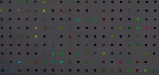 8 在发生测序的小孔有各自的DNA片段和测序复合物,同一时间发出不同颜色的激发光,机器会检测到如下的光信号,实际同时会得到多达几万个光点。